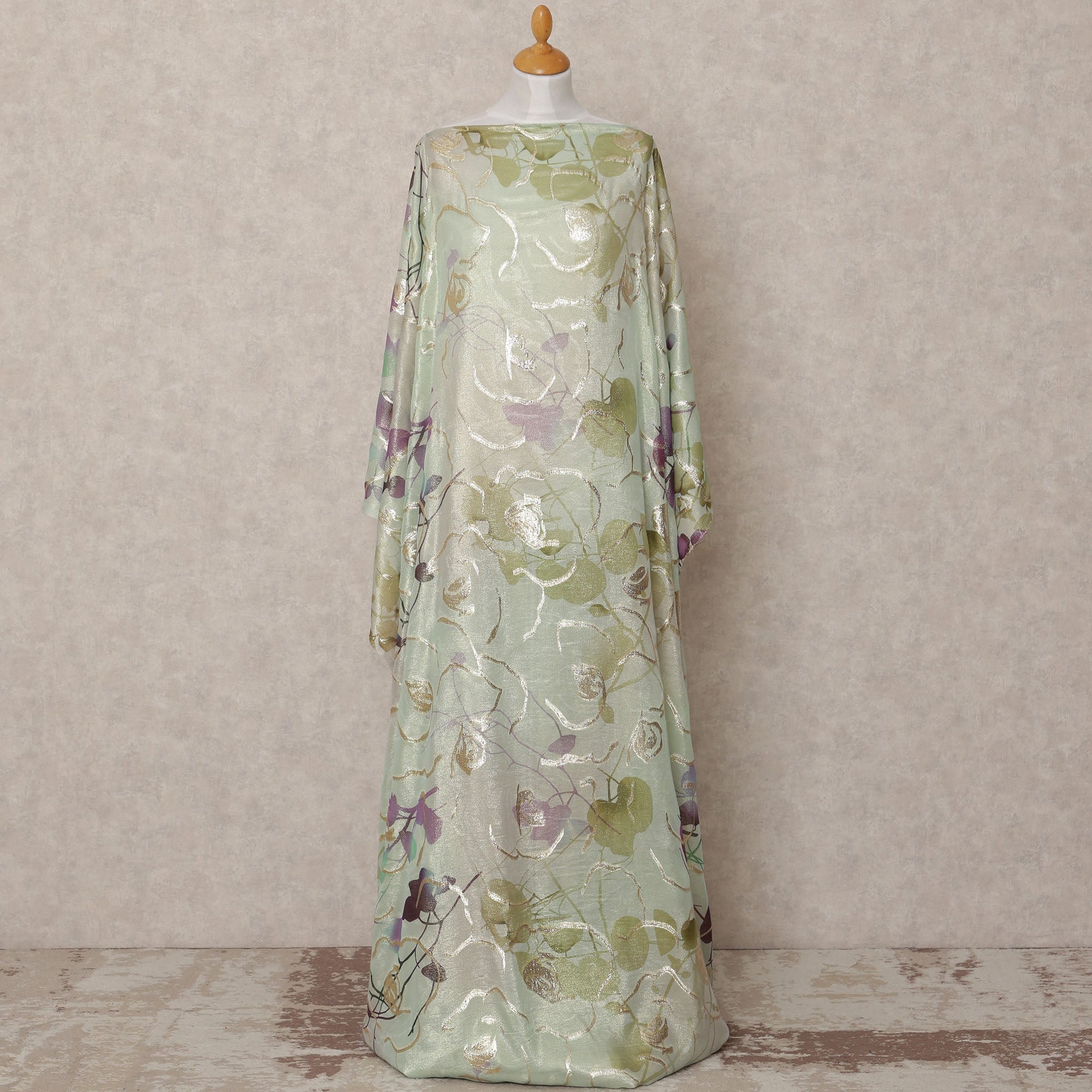 Mint Green and Lilac Leaf Metallic Somali Silk Chiffon Dirac Fabric – 3.5 Meters, Width 140 cm, Made in South Korea-D24736