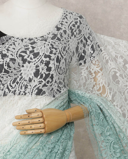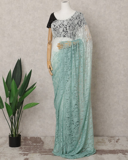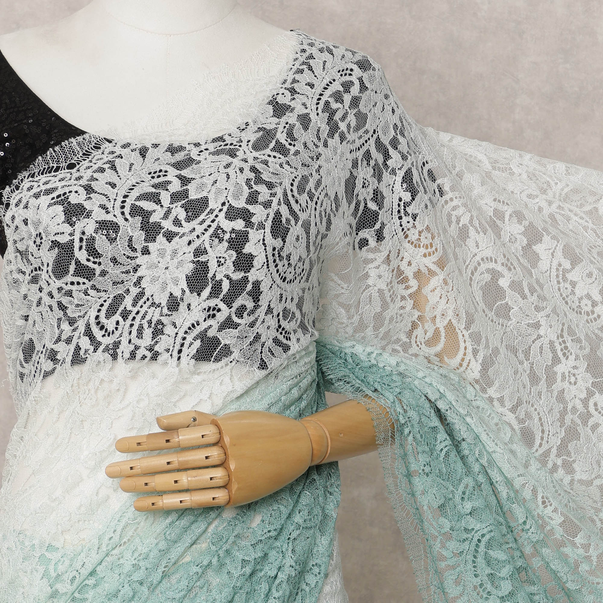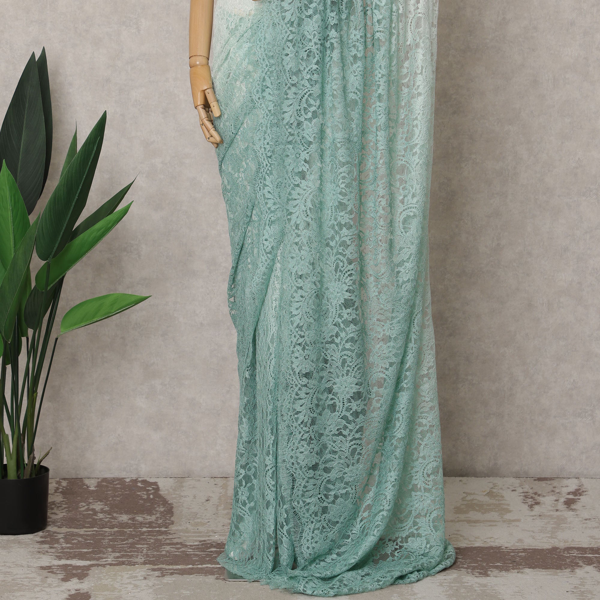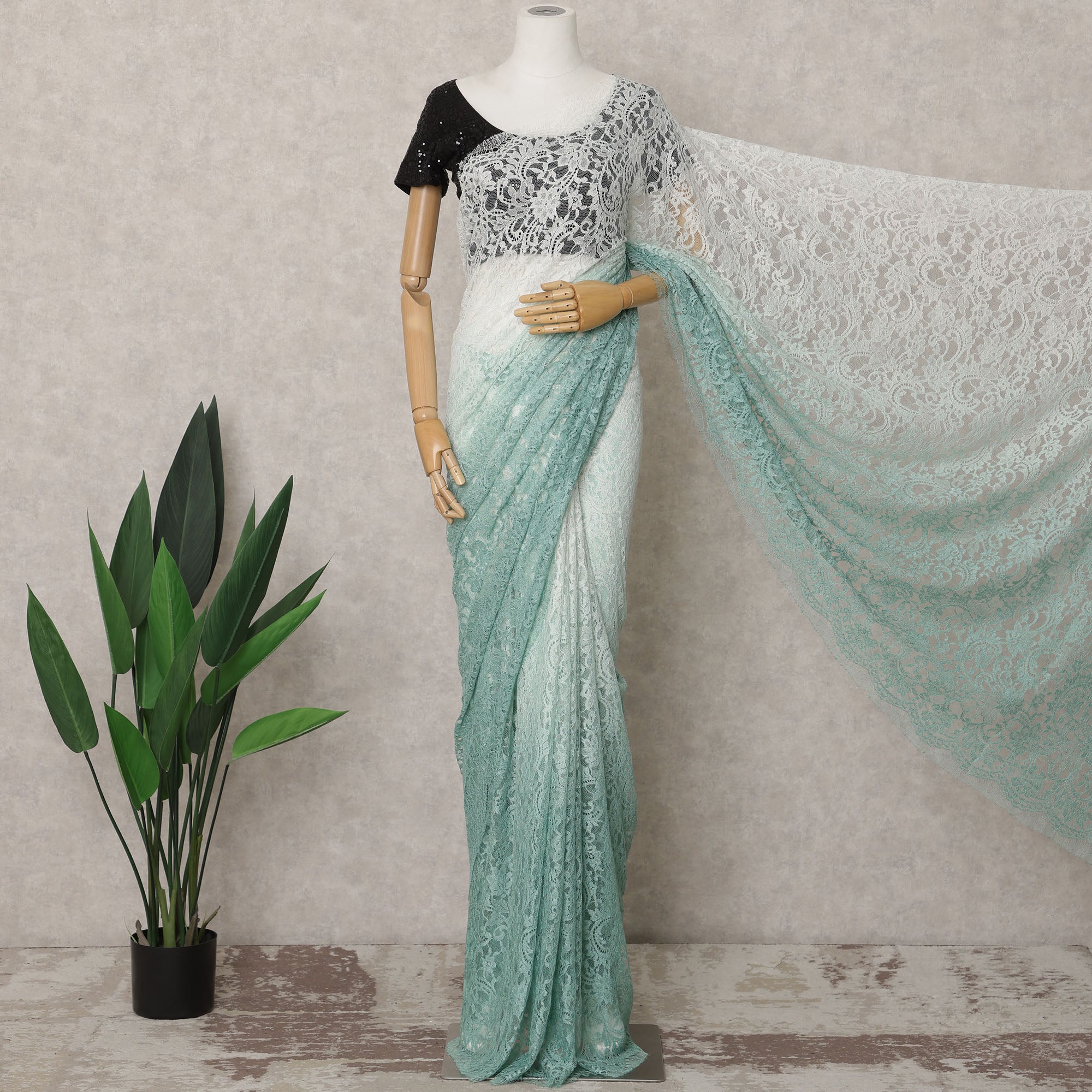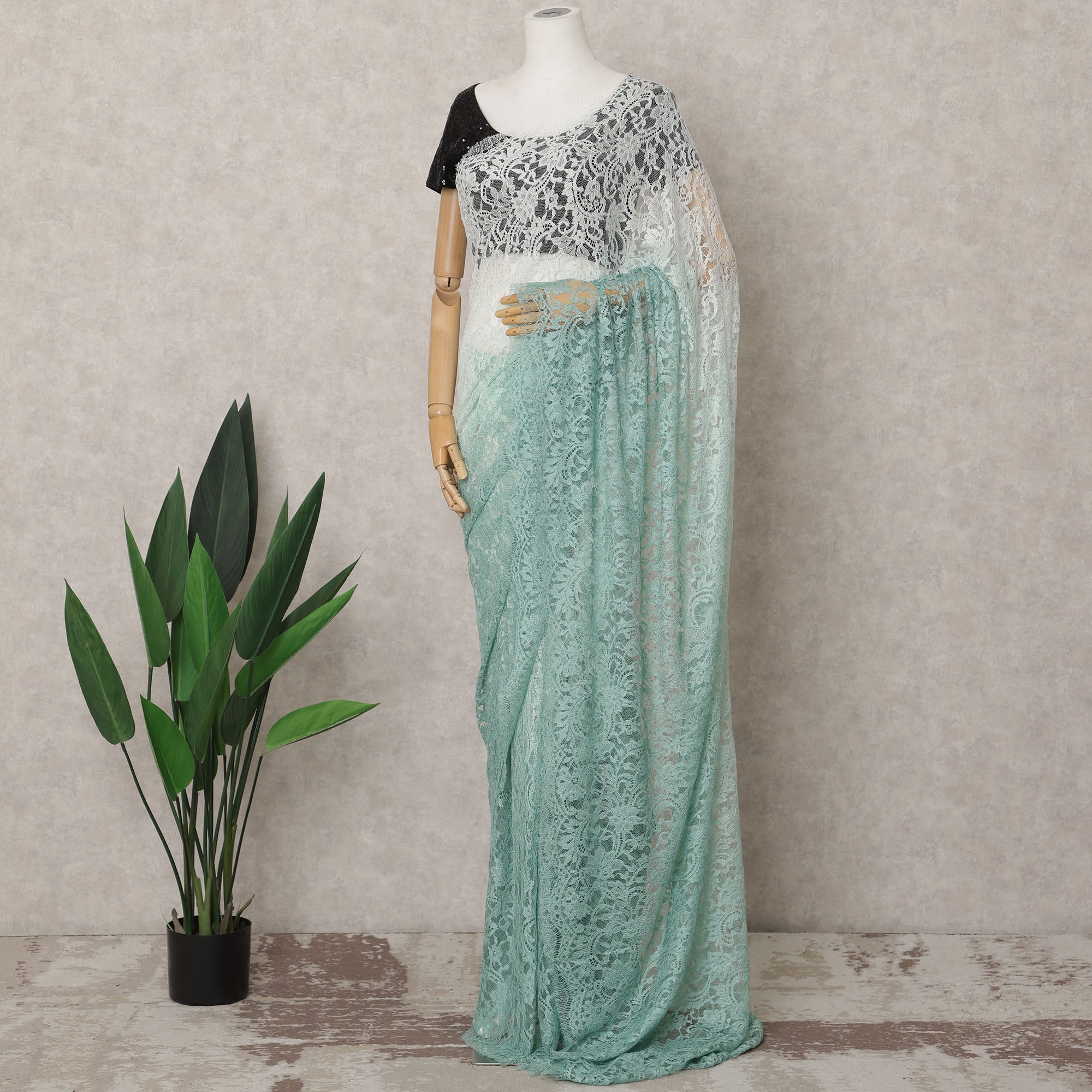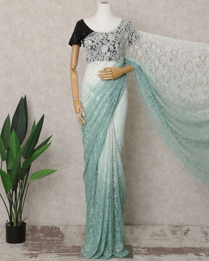 Mint Green and White Ombre French Chantilly Lace Saree, 5.5 Meters, 110 cm Wide-D21827