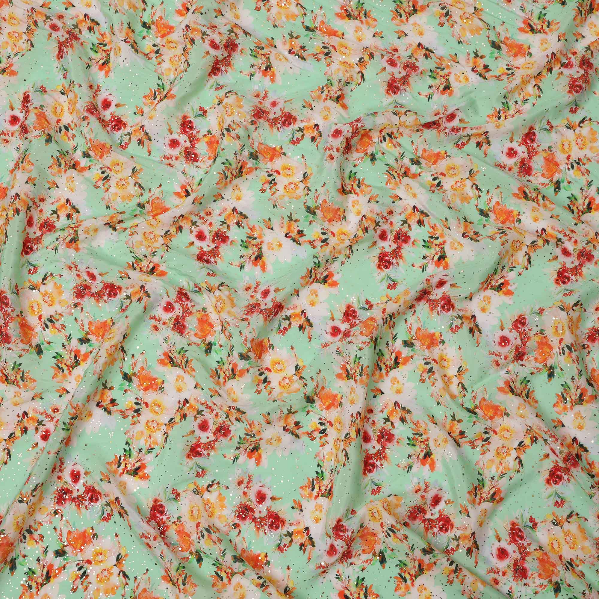 Mint Green Base Multicolor Floral Watercolor Digital Print Viscose Crepe Fabric, 110 Cms Width, Made in India-D23631