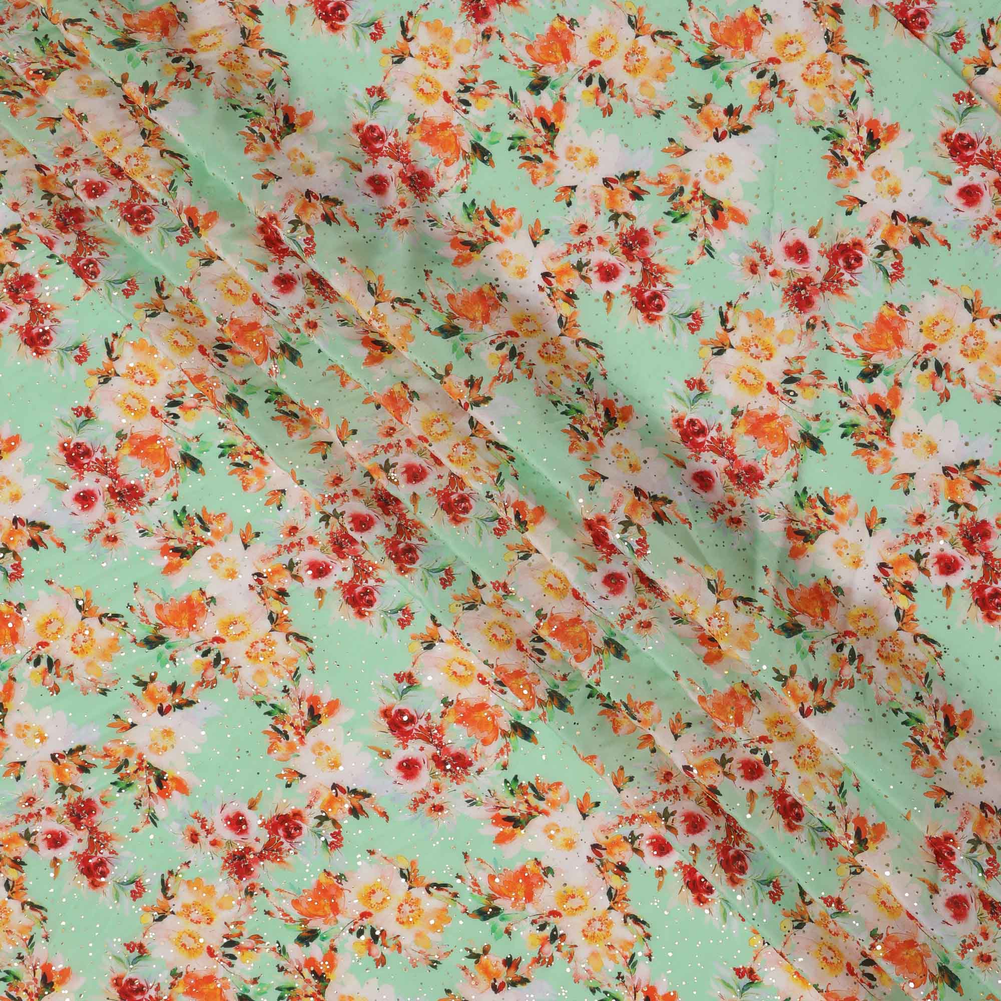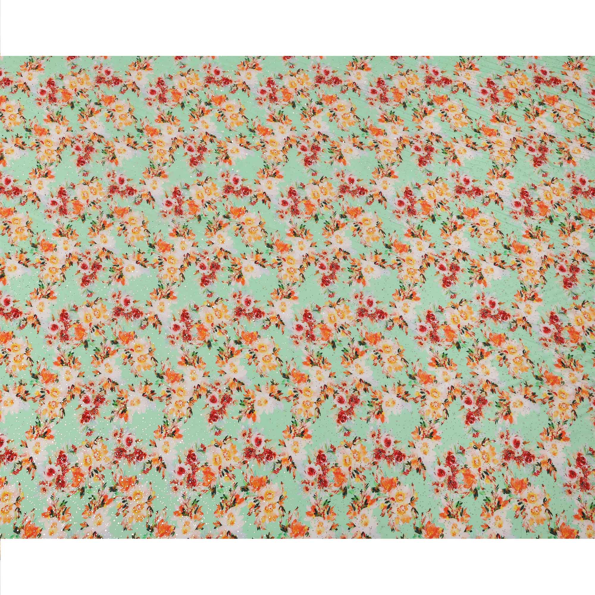 Bask in the freshness of spring with this mint green base multicolor floral watercolor digital print viscose crepe fabric, designed to capture nature’s vibrancy with artistic precision. The base hue of serene mint green forms a perfect backdrop for vivid watercolor florals in bright shades of orange, red, yellow, and ivory, brought to life through high-definition digital printing. Dotted accents subtly shimmer across the surface, enhancing the print’s charm. Crafted from soft, breathable viscose crepe, this fabric offers a smooth texture and fluid drape that flatters every silhouette. With a generous width of 110 cms, it's ideal for crafting elegant kurtas, flowy dresses, chic tops, and scarves. Made in India, this fabric seamlessly blends comfort and color, making it perfect for festive daywear or easygoing resort ensembles. Buy online and elevate your wardrobe with this fresh floral beauty.
