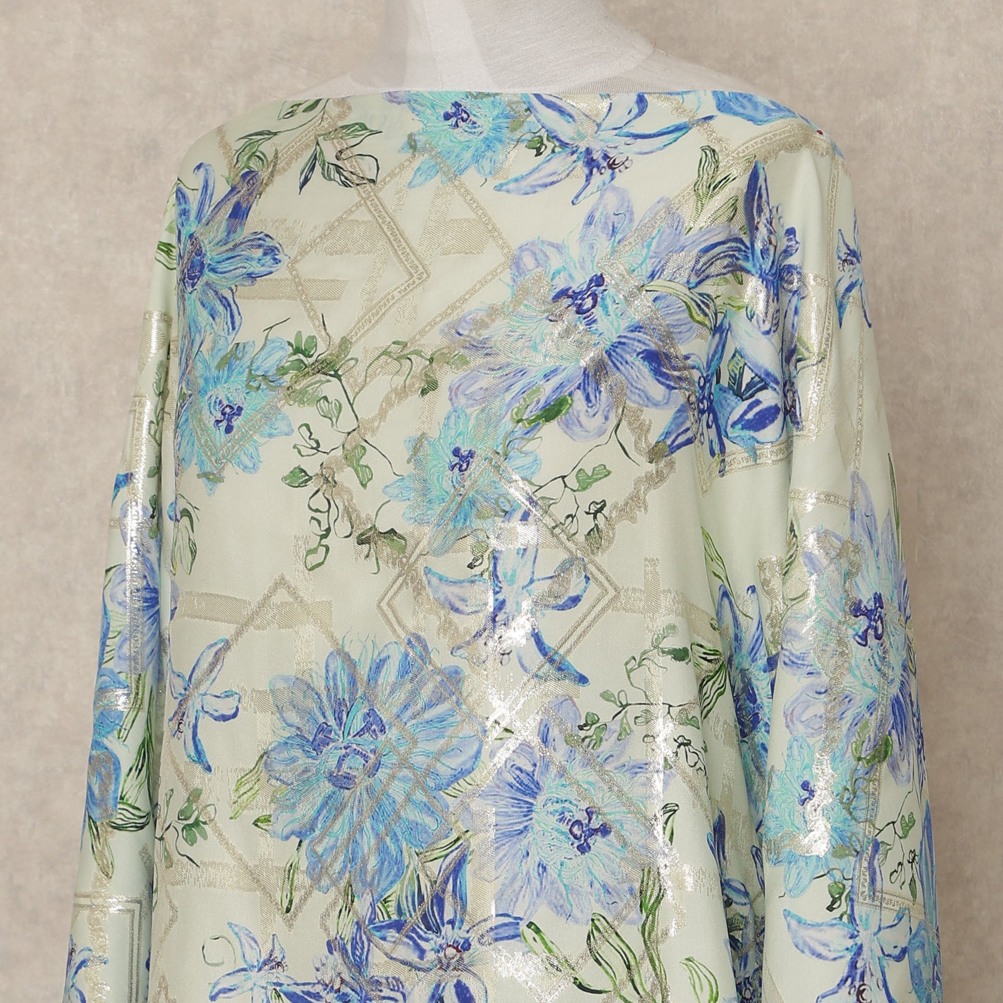 Mint green base with blue floral print and metallic accents adds refined shimmer and elegance.
