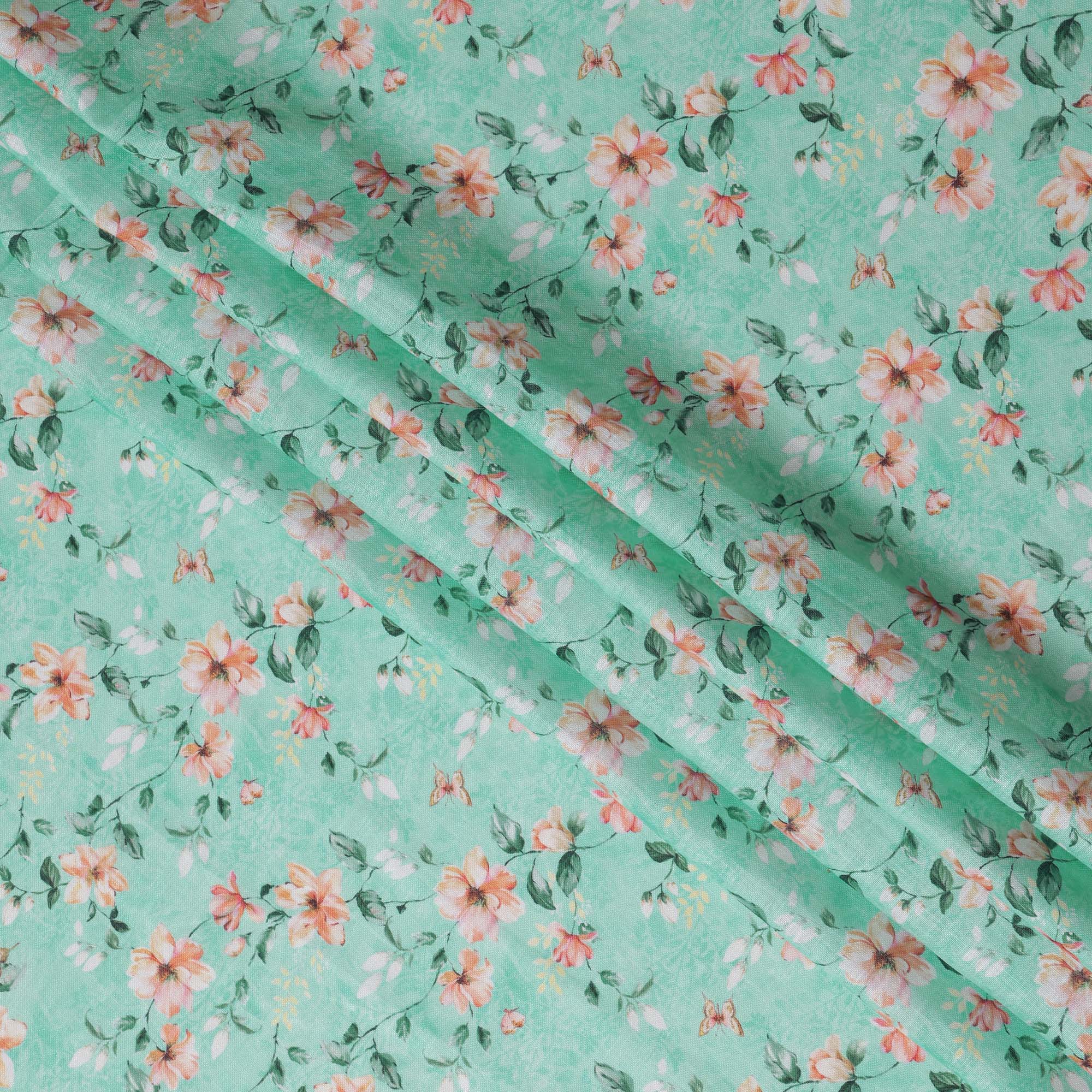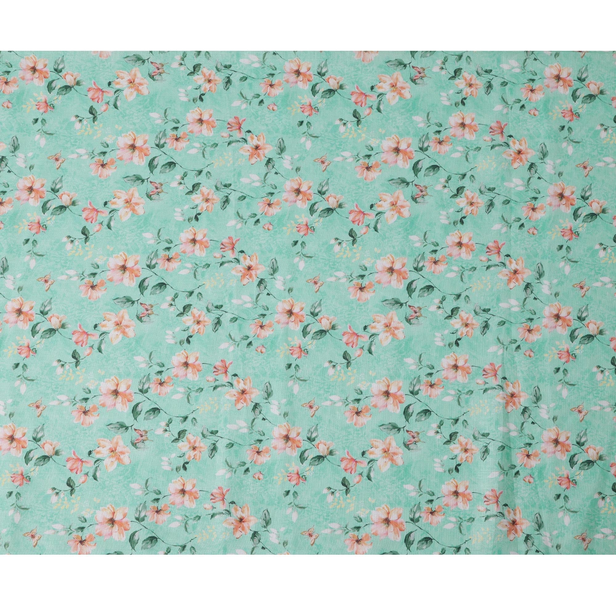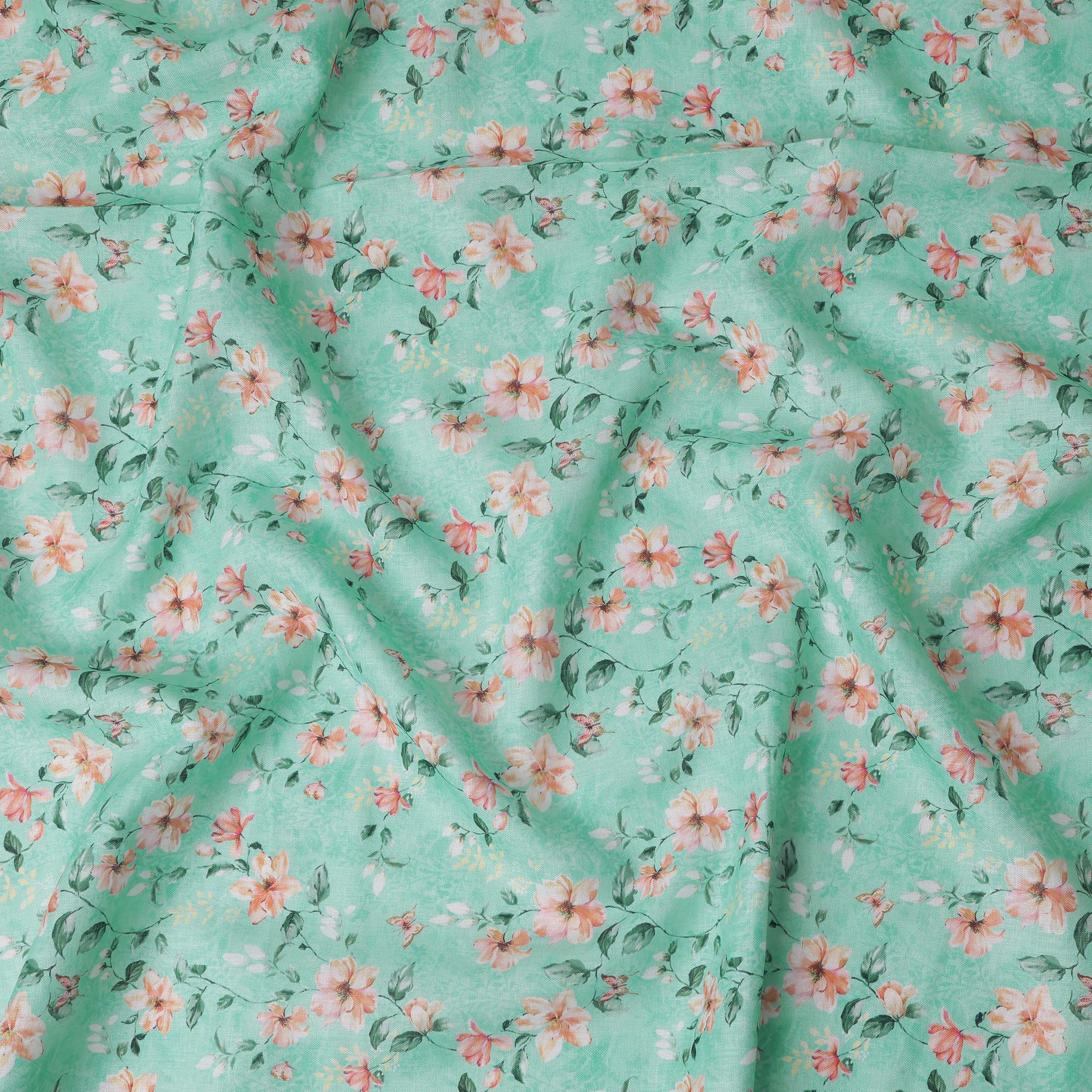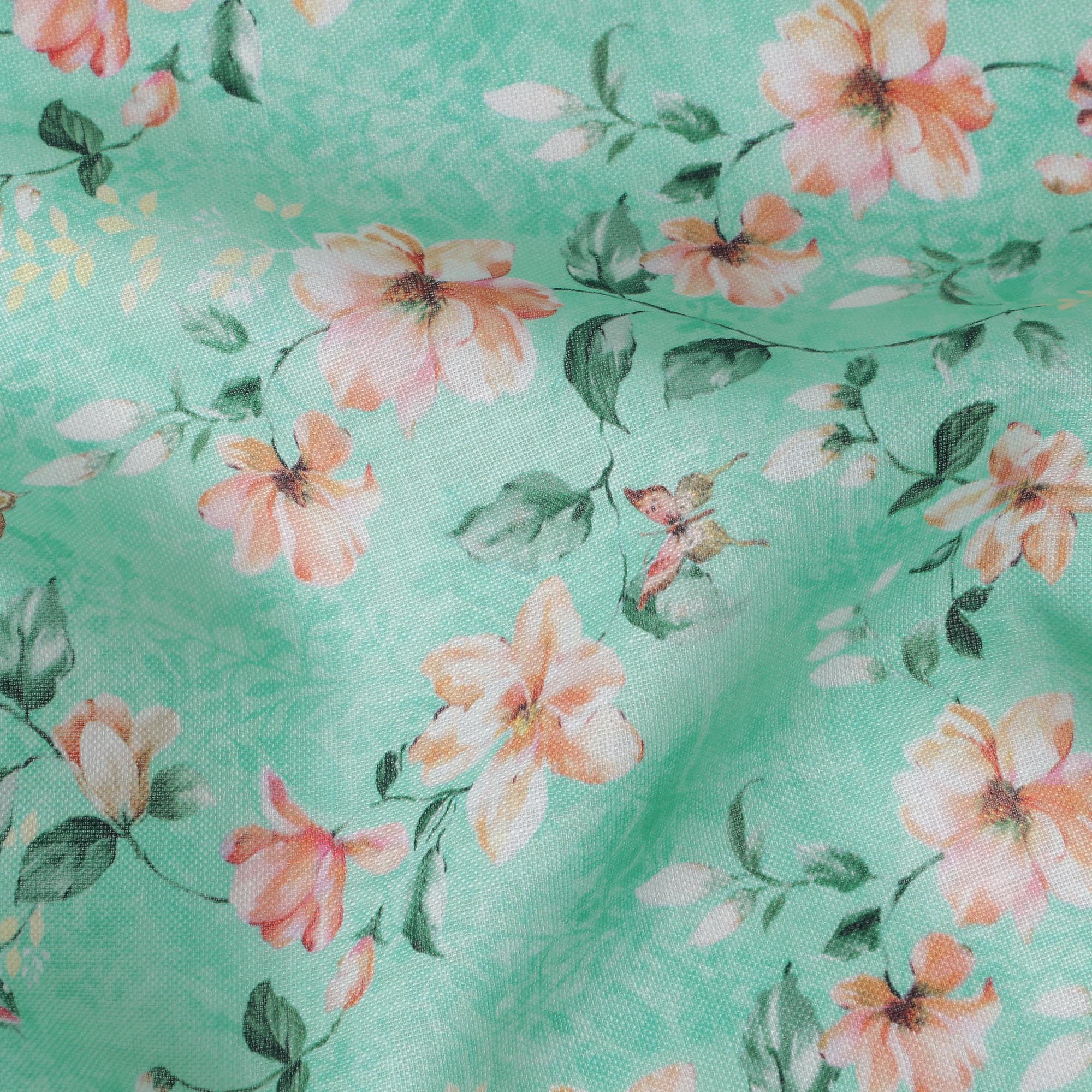 Refresh your designs with this mint green floral printed blended linen fabric, crafted in India with a soft texture and breathable feel. The soothing mint green base is beautifully adorned with delicate peach and white flowers intertwined with lush green leaves, creating a vibrant and elegant appeal. This high-quality blended linen fabric offers durability, comfort, and versatility, making it perfect for stylish garments, charming home décor, and creative DIY projects. With a width of 140 cm, it provides ample material for diverse sewing applications, ensuring a graceful and polished finish.