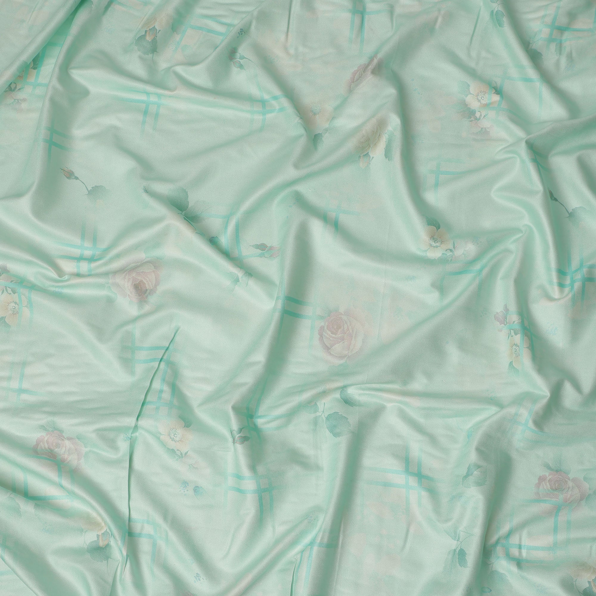 Mint green base with delicate rose floral and subtle grid print creates a fresh and graceful appearance for stylish apparel designs.