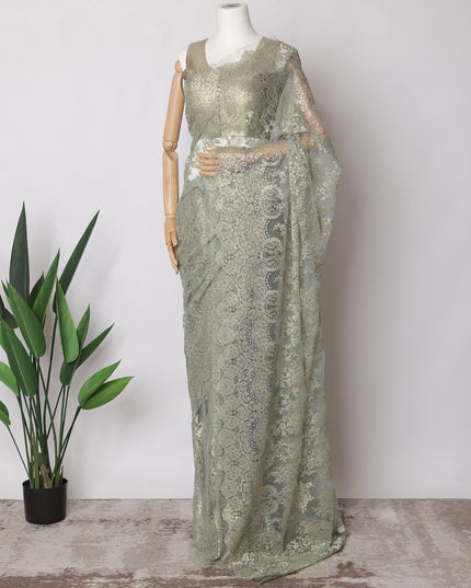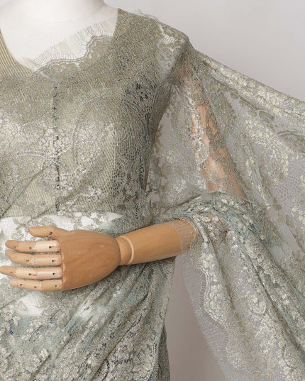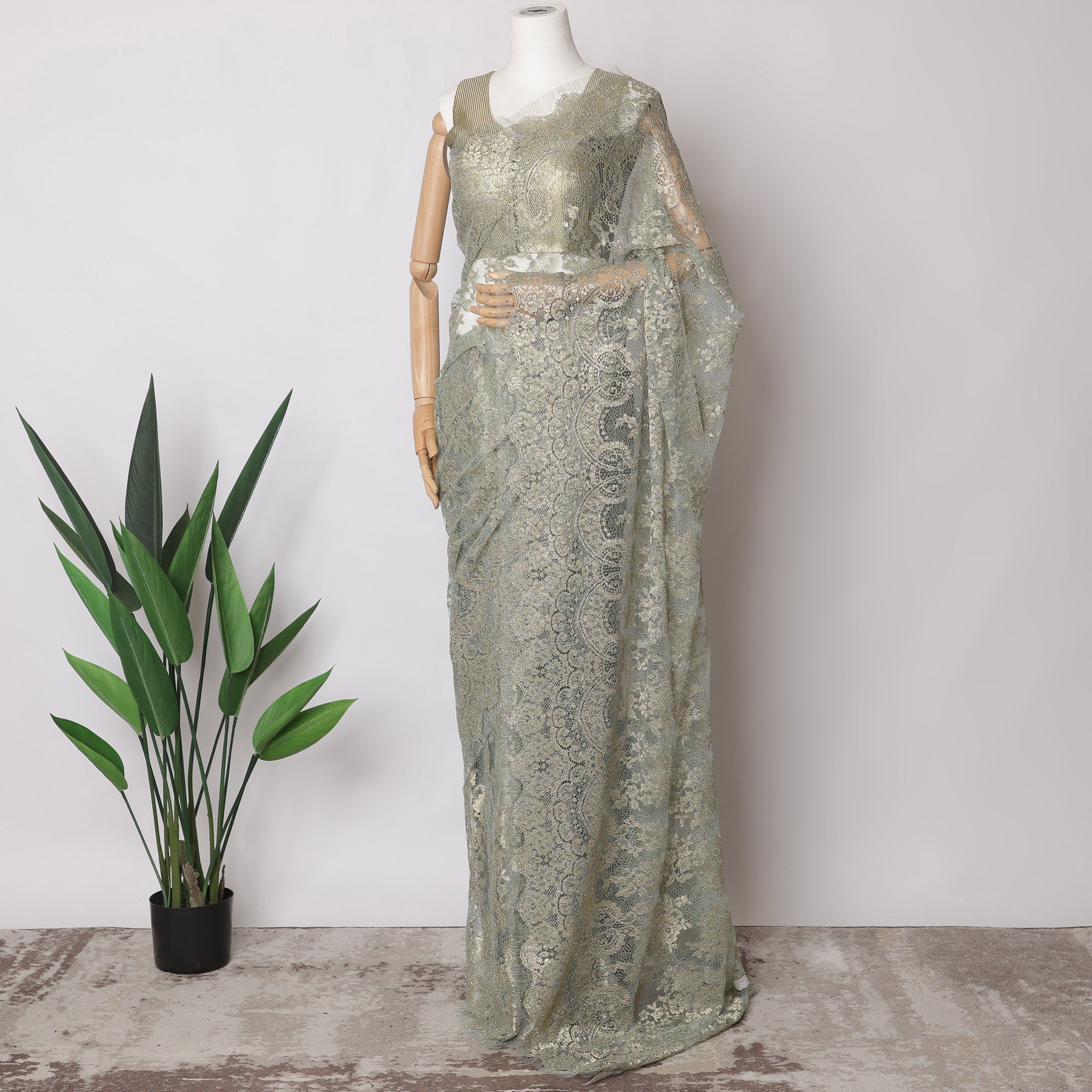 Elevate your wardrobe with this stunning silver-grey French metallic Chantilly saree lace fabric. Crafted in France, this luxurious lace features intricate floral patterns interwoven with metallic accents, giving it a radiant, elegant sheen. With a width of 110 cm and a length of 5.5 meters, it is perfect for creating exquisite sarees, lehengas, or gowns. The delicate, lightweight texture ensures graceful draping, making it ideal for special occasions. This premium fabric blends traditional craftsmanship with a modern touch, offering a sophisticated and timeless appeal. Please note: the blouse shown is for styling purposes and is not included.