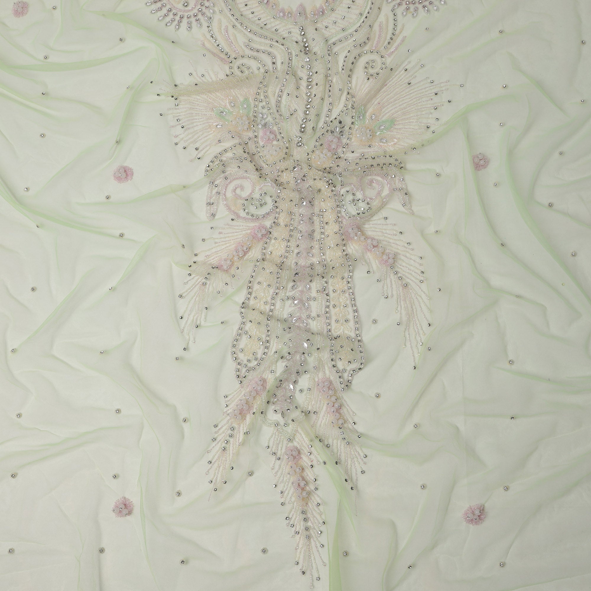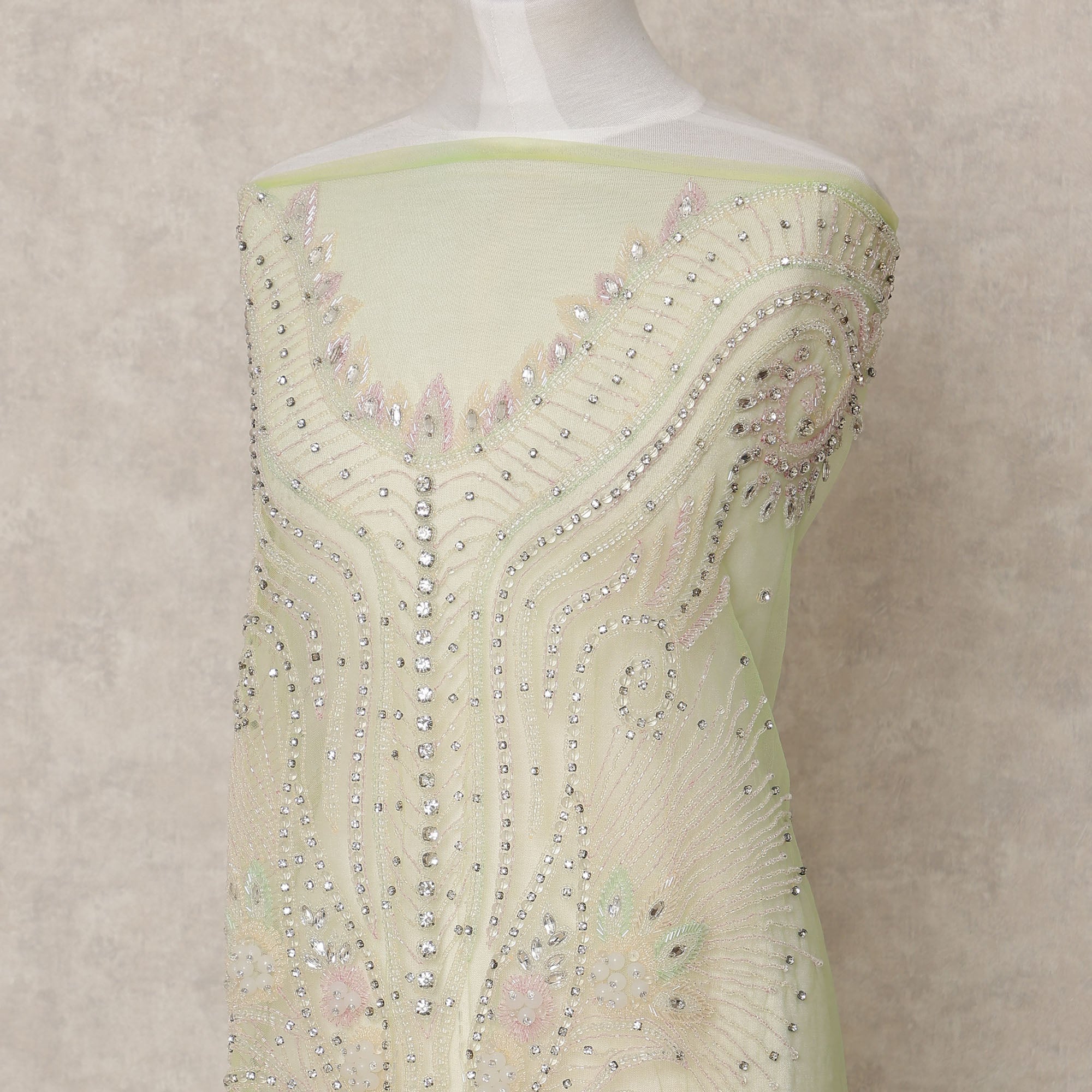 Delicate and refreshing, this mint green nylon tulle fabric is intricately embroidered with shimmering silver sequins, pastel threads, and floral elements in subtle tones of pink, ivory, and green. Designed in a 3-meter length and 140 cm width, this fabric is perfect for crafting ethereal and elegant garments such as sarees, lehengas, or Fustaann dresses. The symmetrical embroidery creates a central cascading motif that exudes regal charm, while the surrounding spaced embellishments enhance the sheer base without overpowering its lightness. The blend of soft colors and rich detailing captures both tradition and modernity, making it a premium choice for designers. Expertly handcrafted in India, this fabric reflects cultural finesse and is ideal for bridalwear and upscale ethnic fashion. Buy online to add a touch of sophistication to your wardrobe creations.