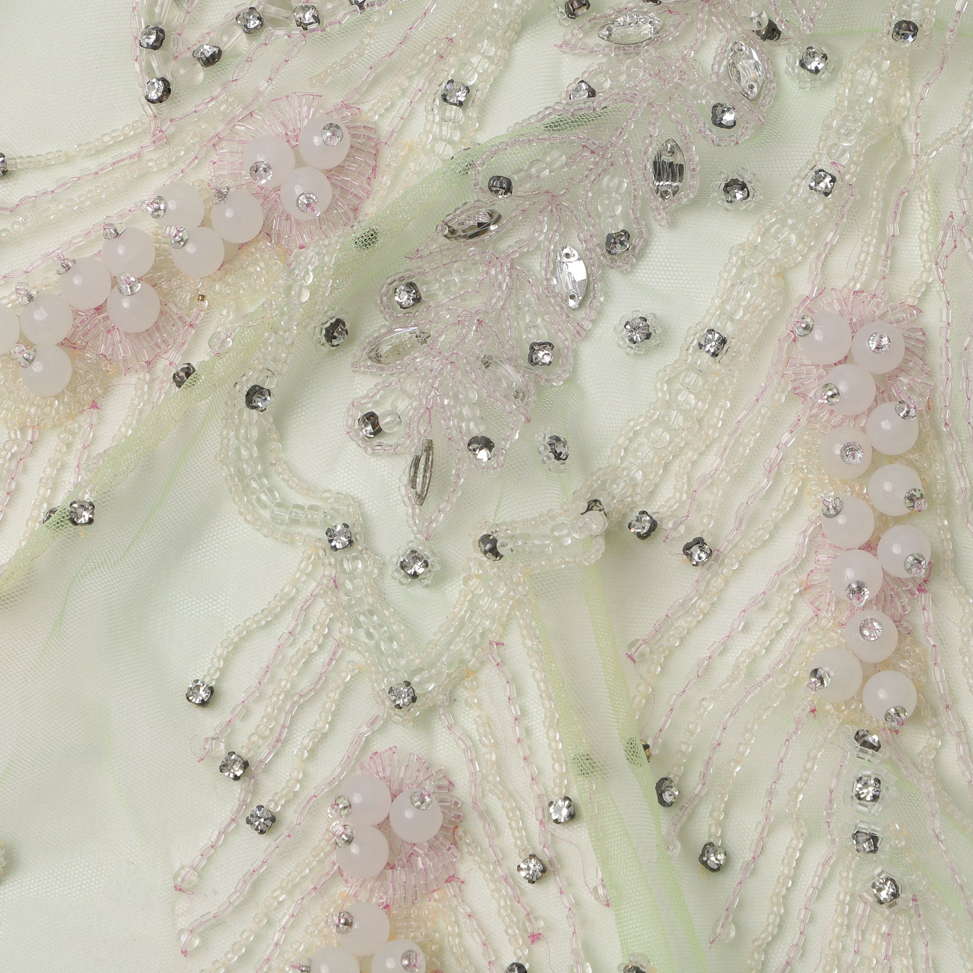 Delicate and refreshing, this mint green nylon tulle fabric is intricately embroidered with shimmering silver sequins, pastel threads, and floral... Read more Read more