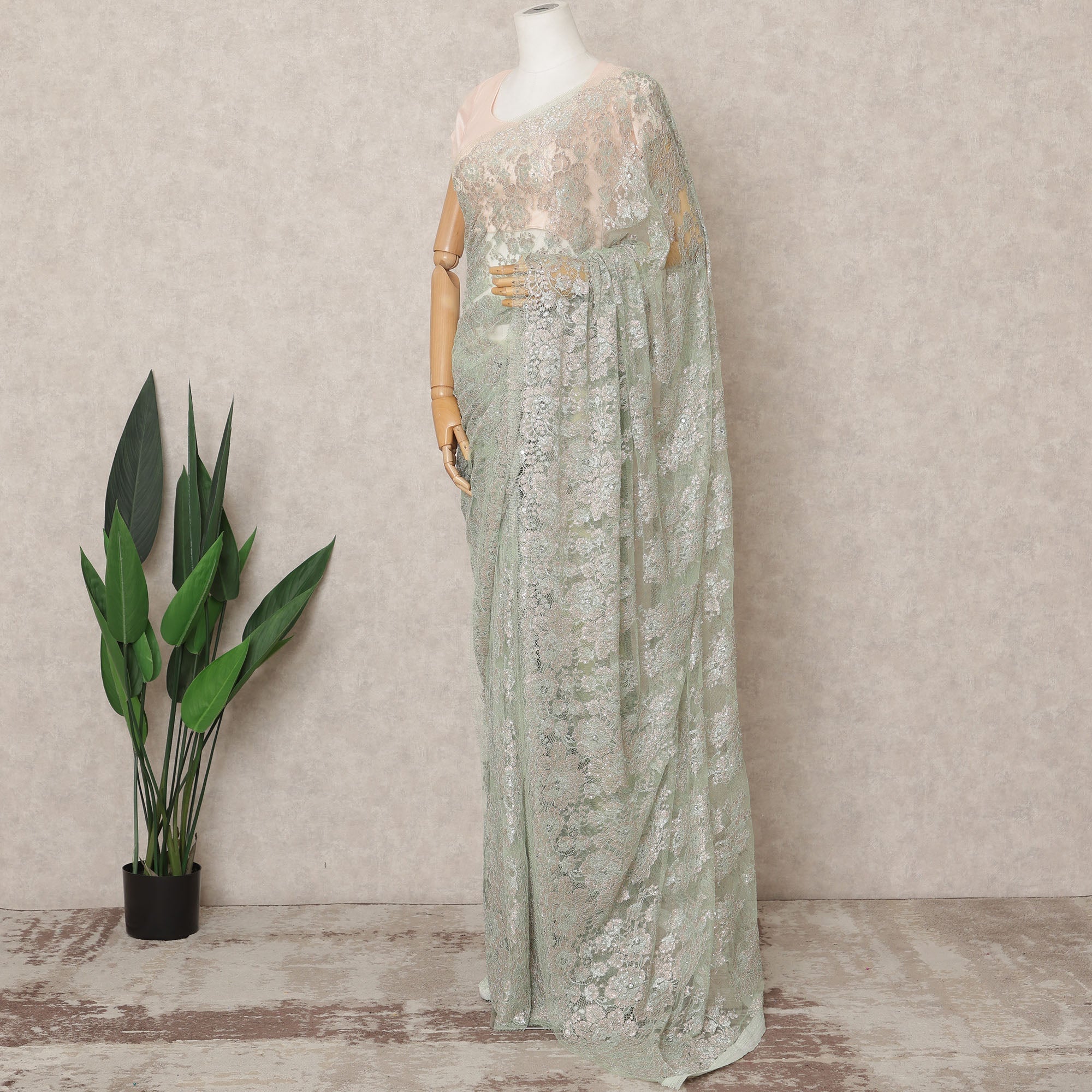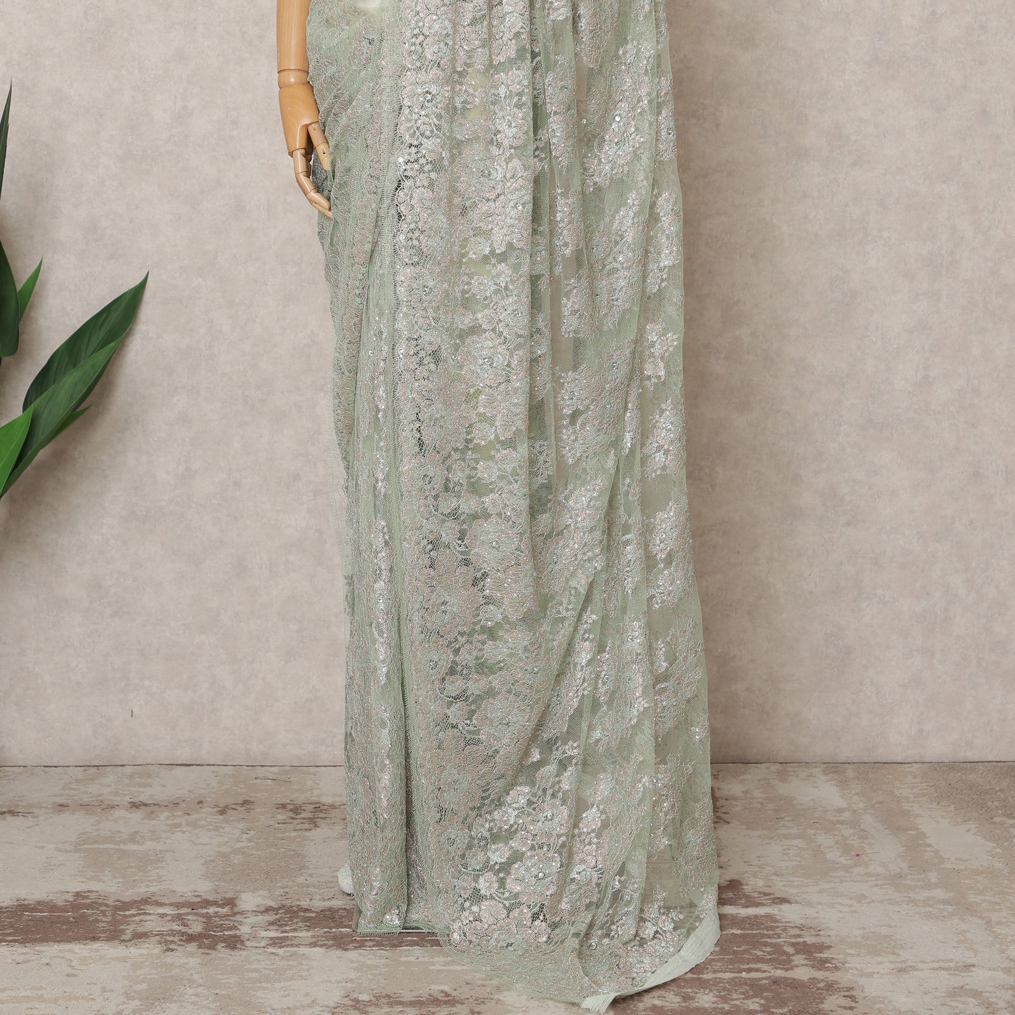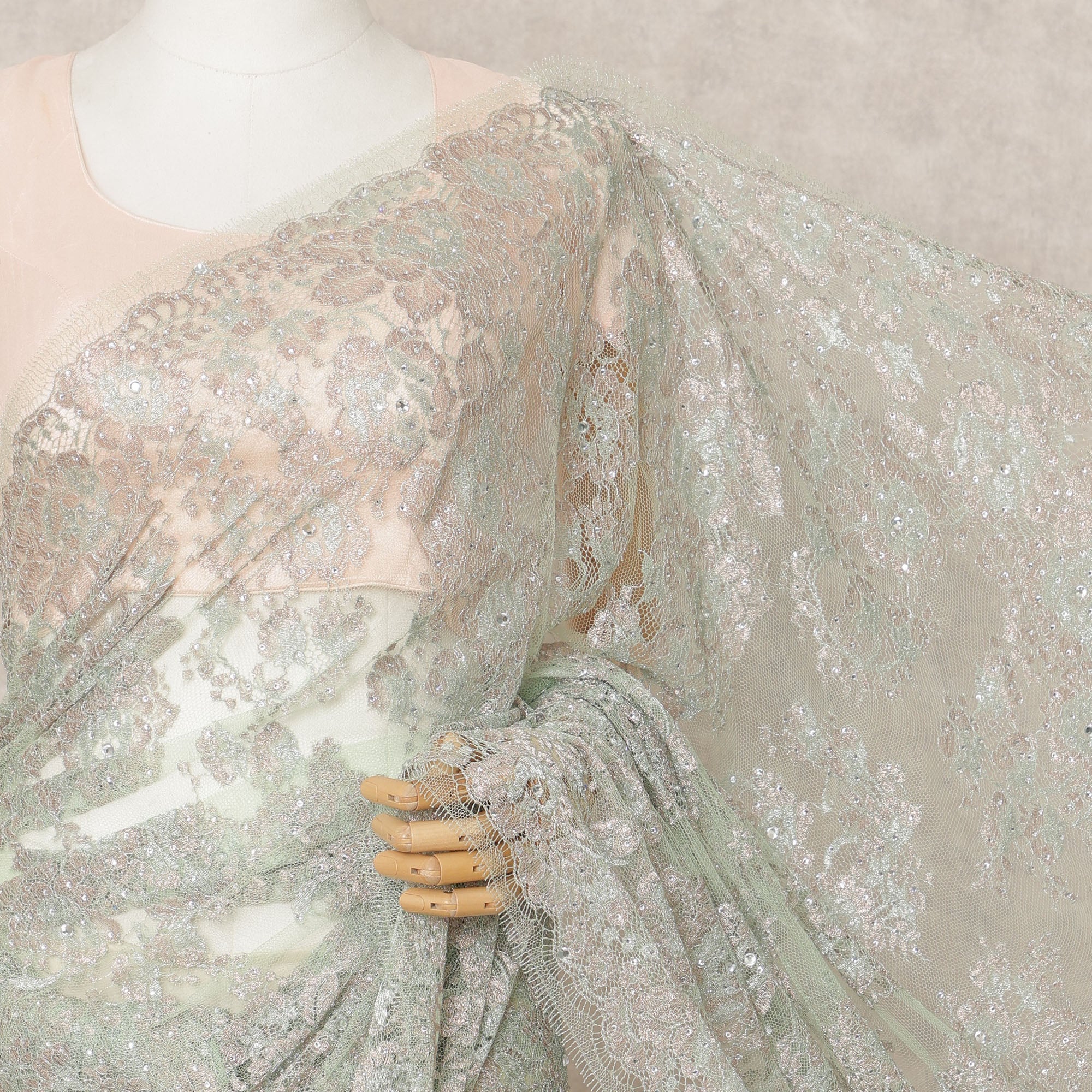 Mint Green Premium Metallic Chantilly Lace Saree with Stone Work, 5.5 Meters Length, 110 Cms Width, Made in France-D23867