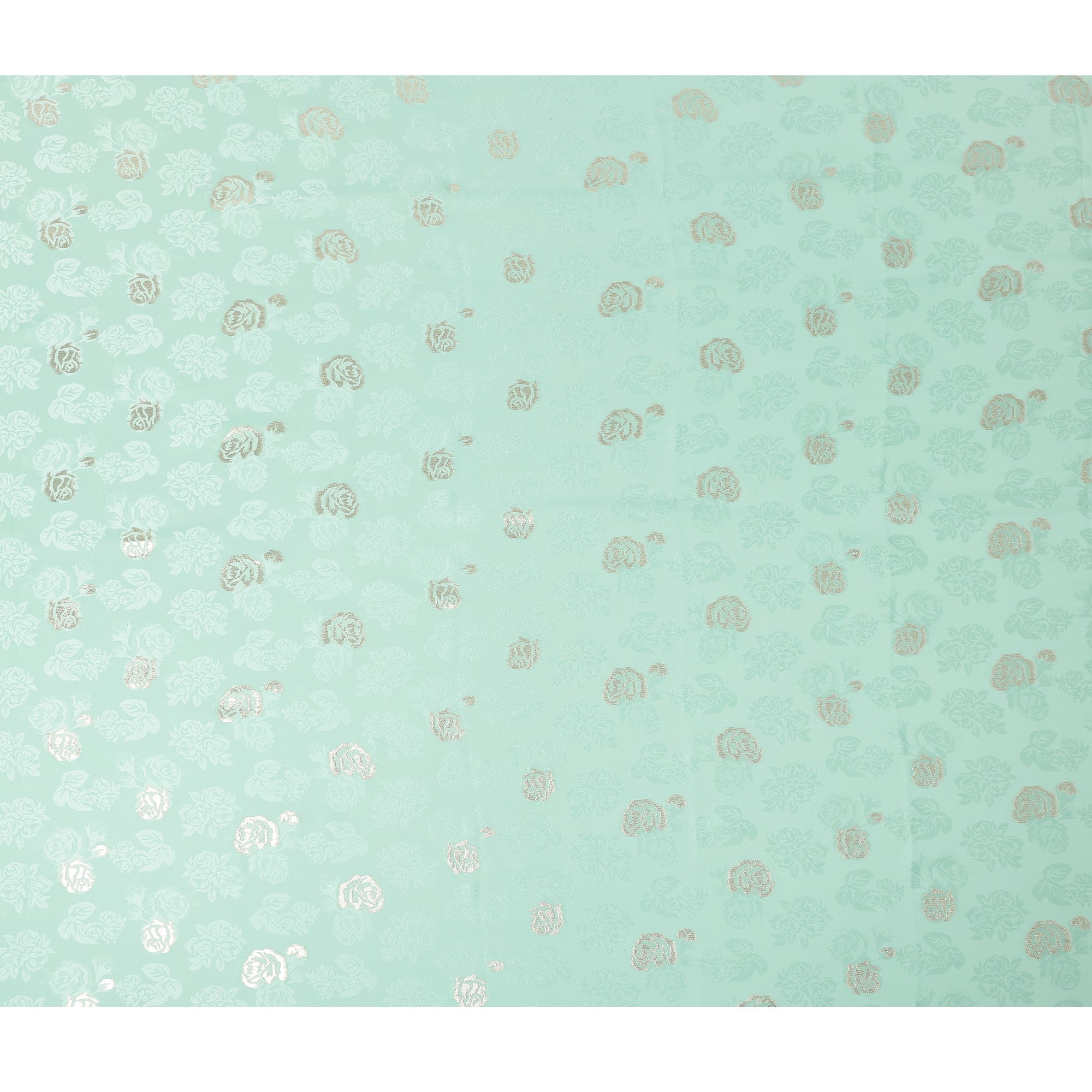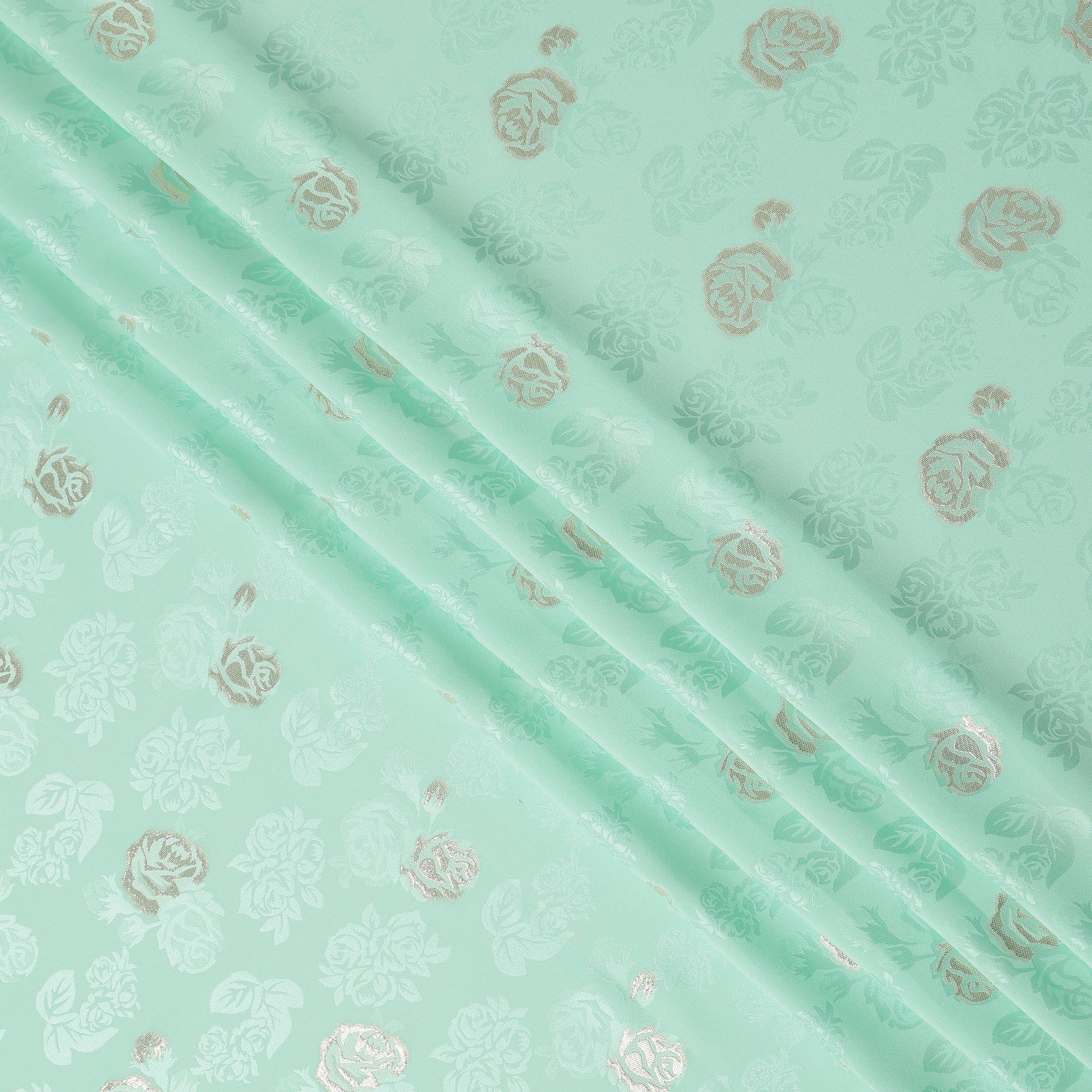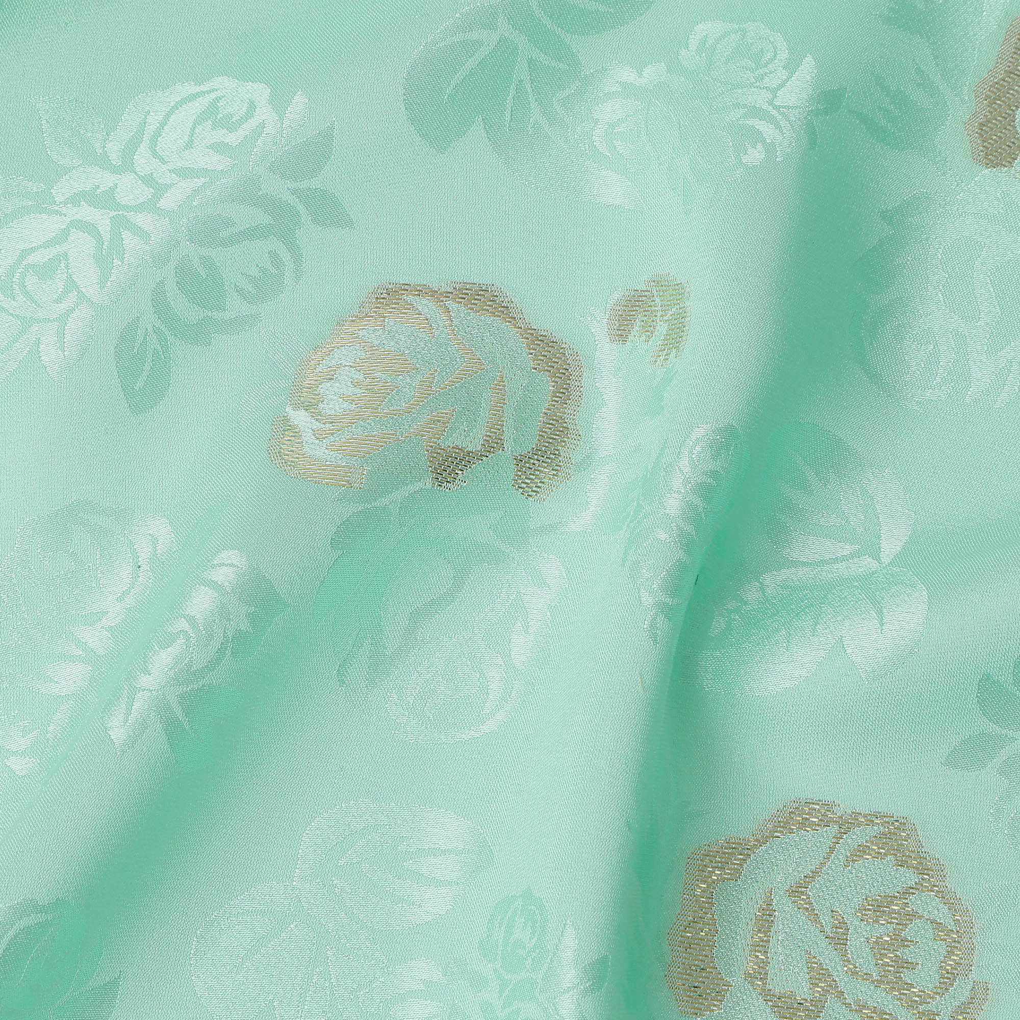 Premium mint green silk satin fabric with elegant metallic floral jacquard design.