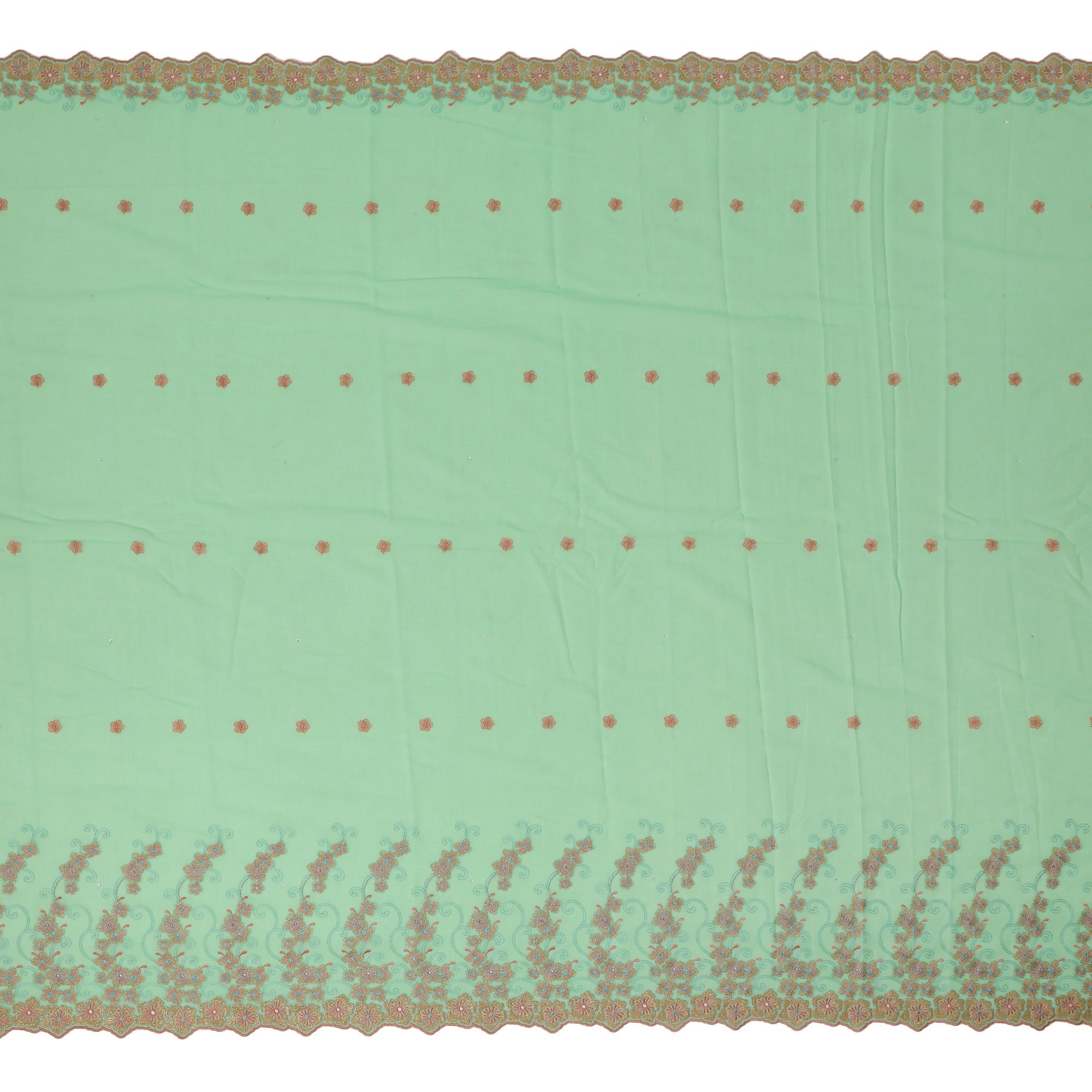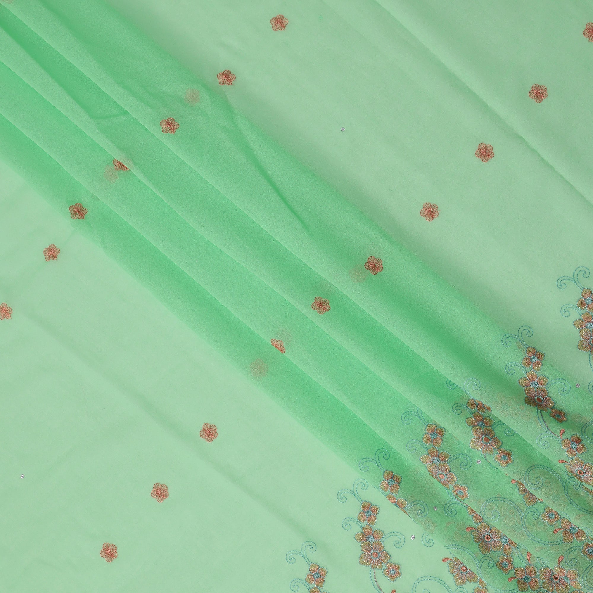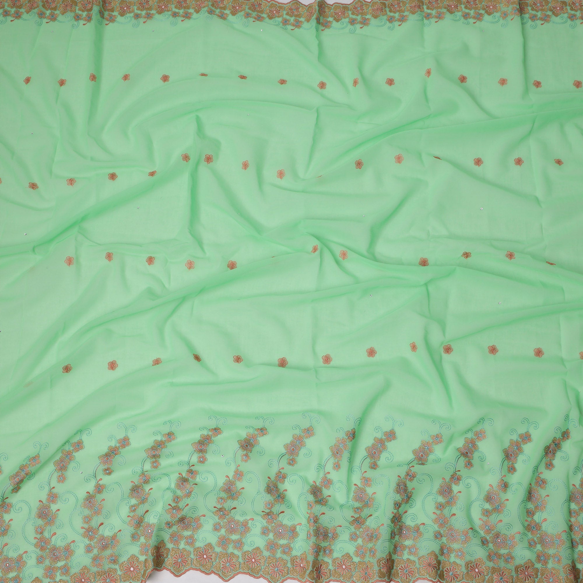 Mint green cotton voile fabric with golden embroidery and stone detailing.