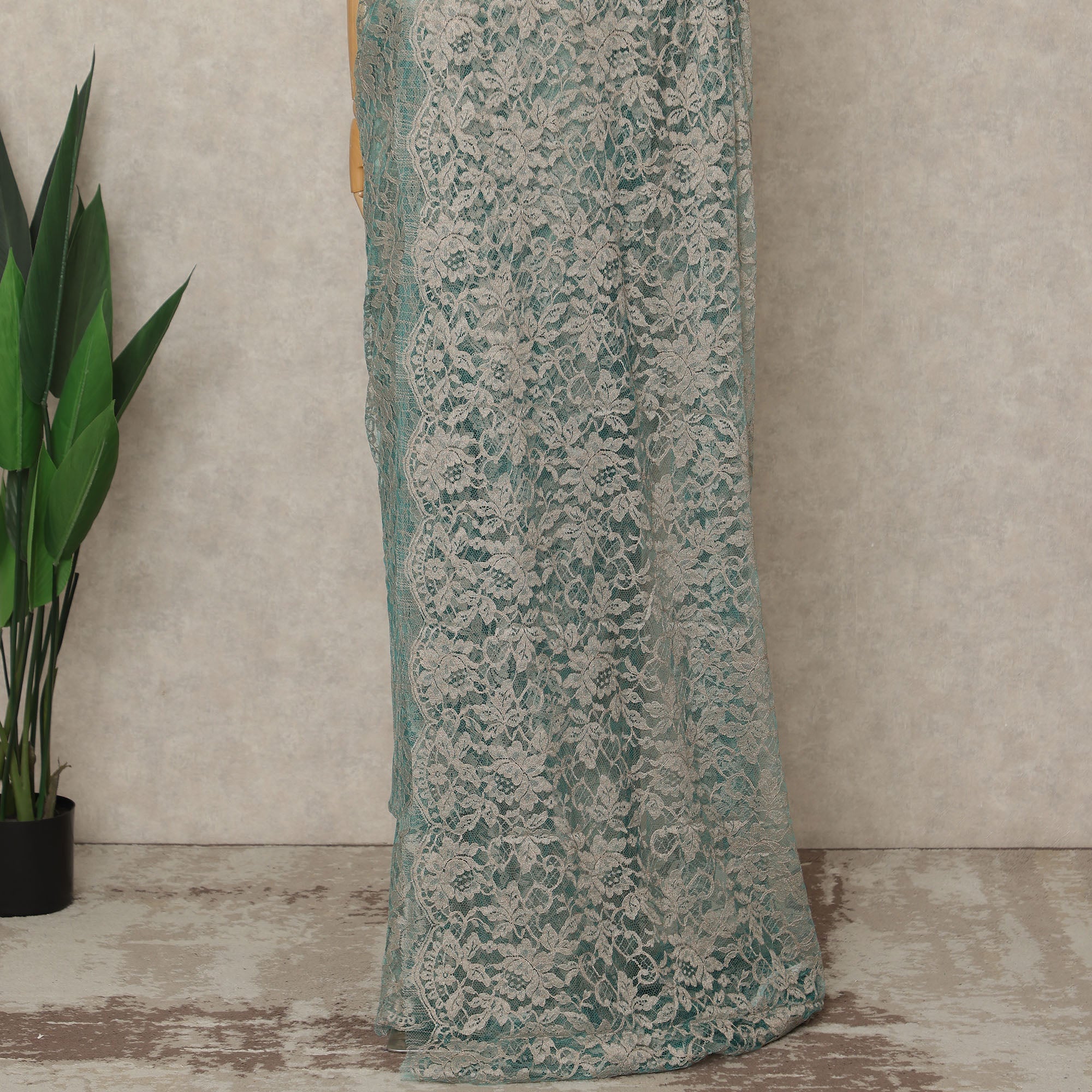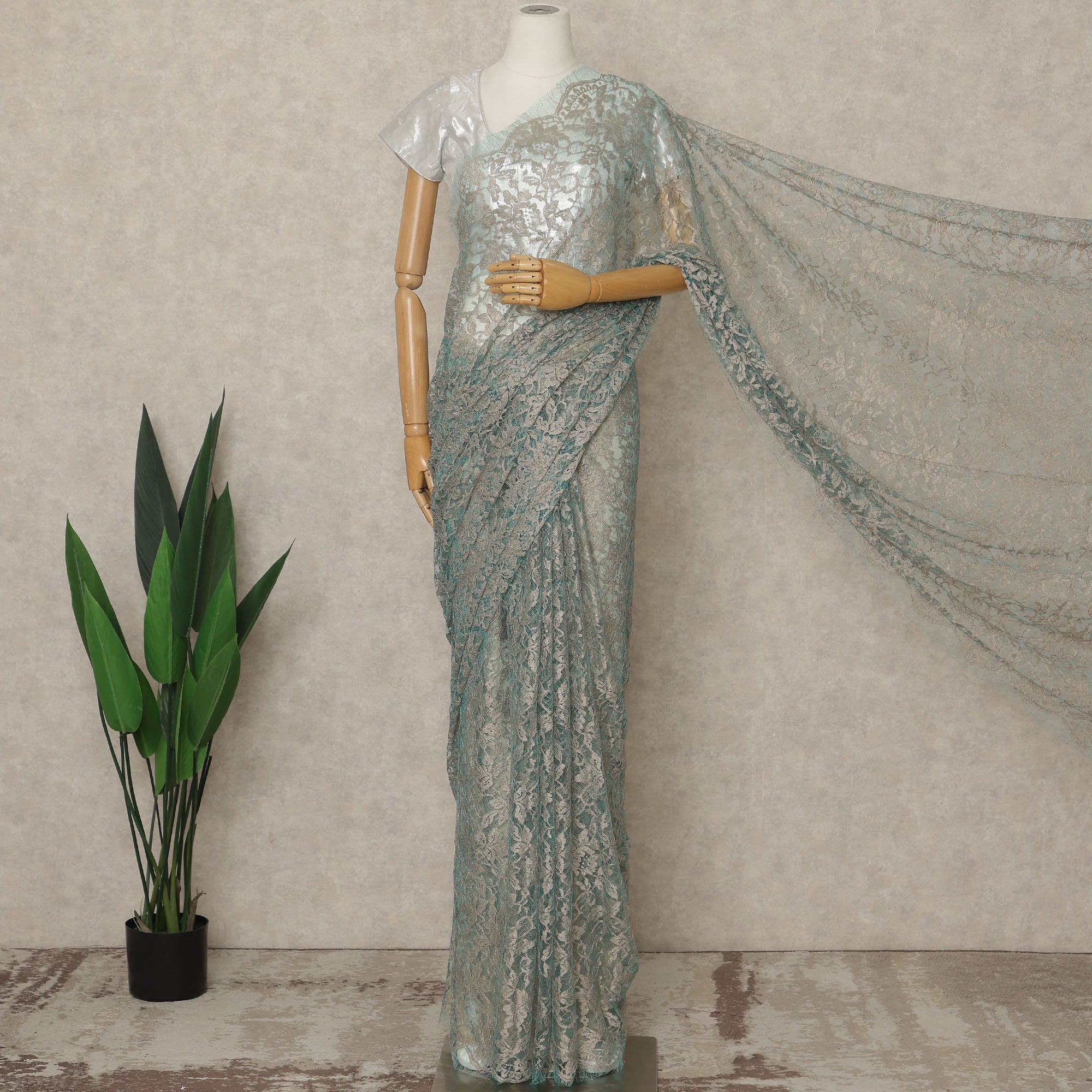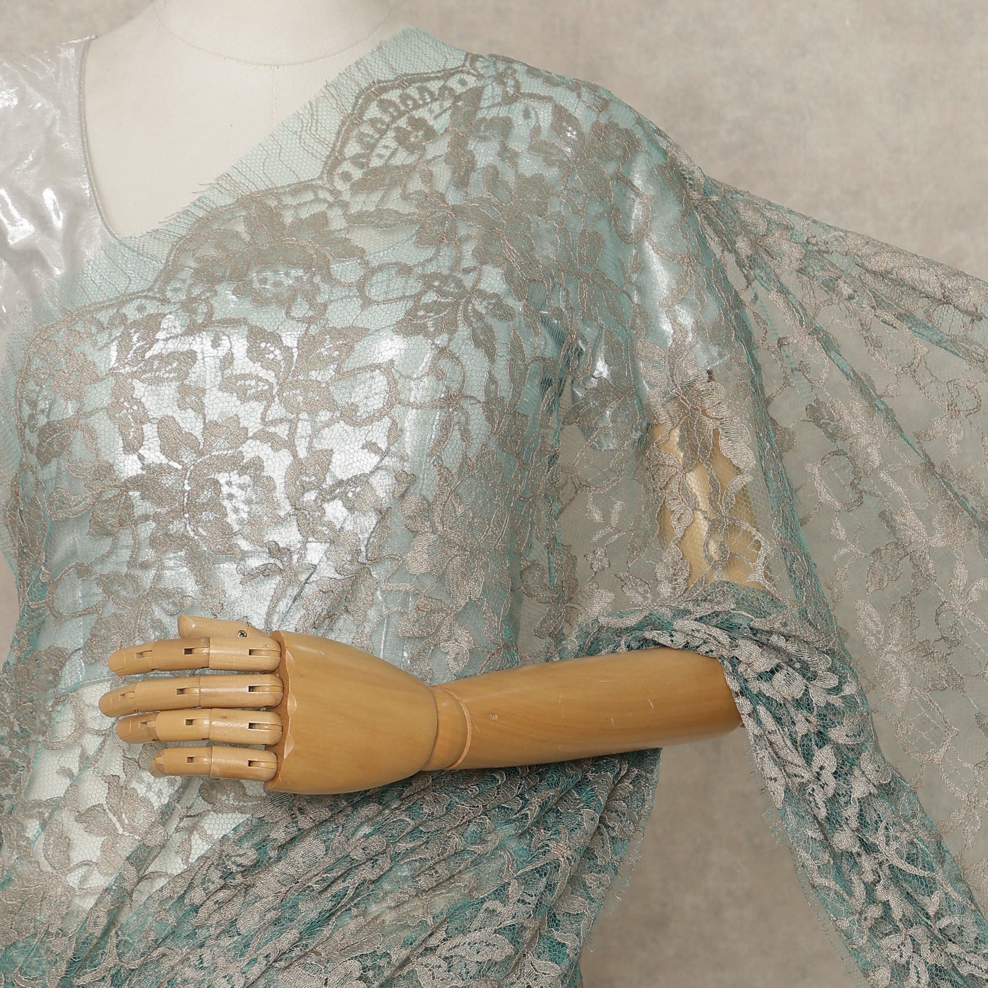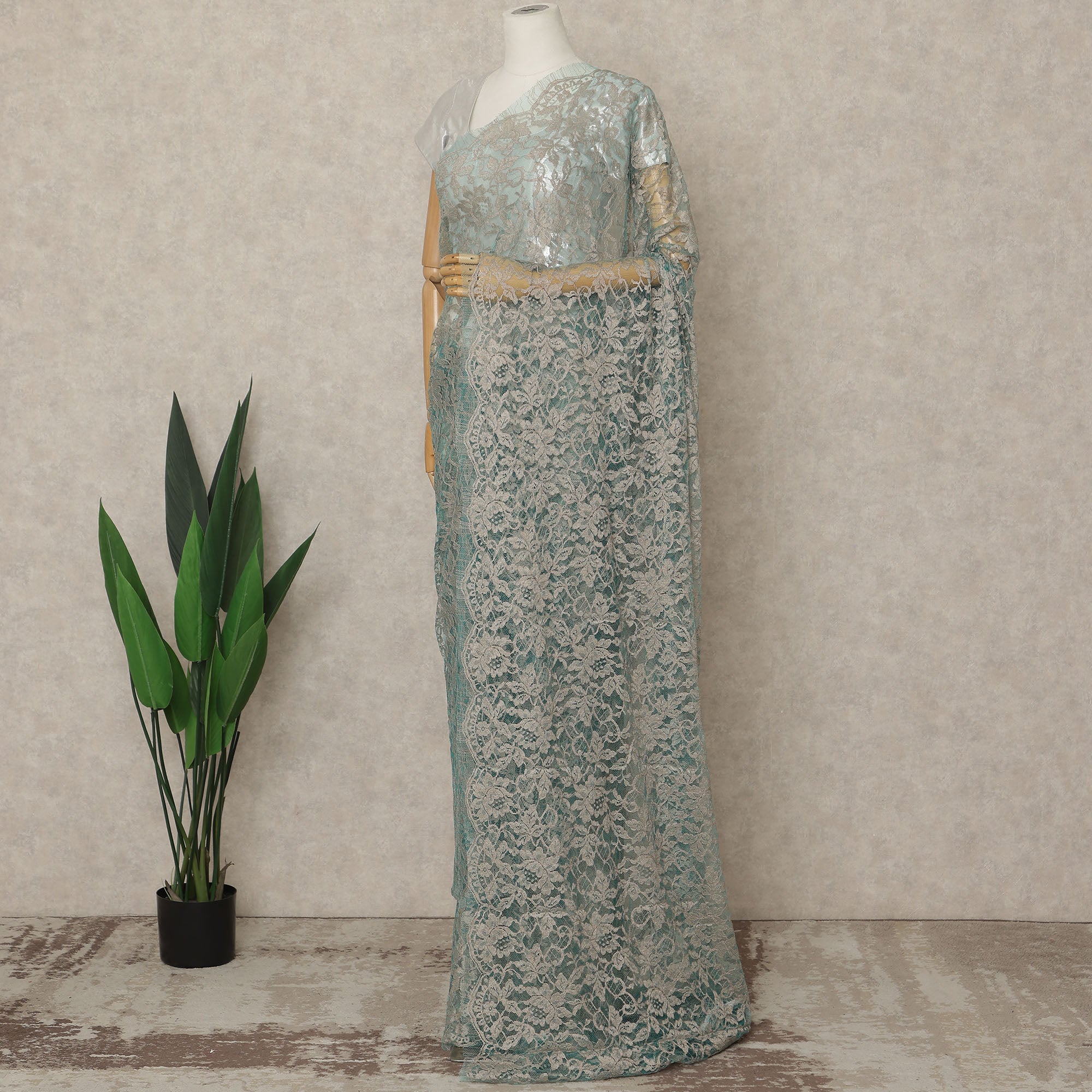 This Mint Premium French Chantilly Saree Lace features a soft mint-green tone with intricate floral lacework and a subtle metallic sheen, offering an elegant, lightweight, and luxurious drape perfect for weddings, festive wear, evening occasions, and designer creations; crafted in France with authentic Chantilly craftsmanship, this approximately 5.5-meter saree lace provides graceful transparency, rich texture, and refined detailing for a sophisticated and high-fashion look—blouse not included.