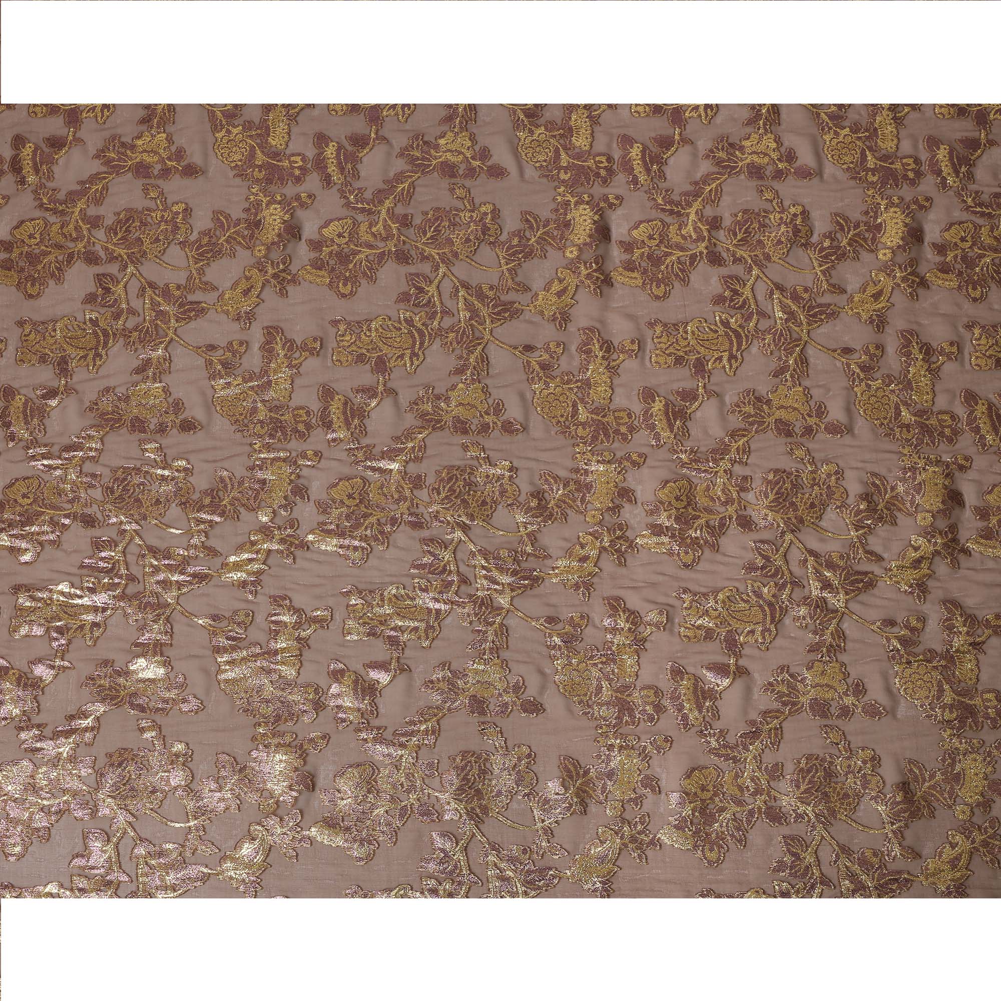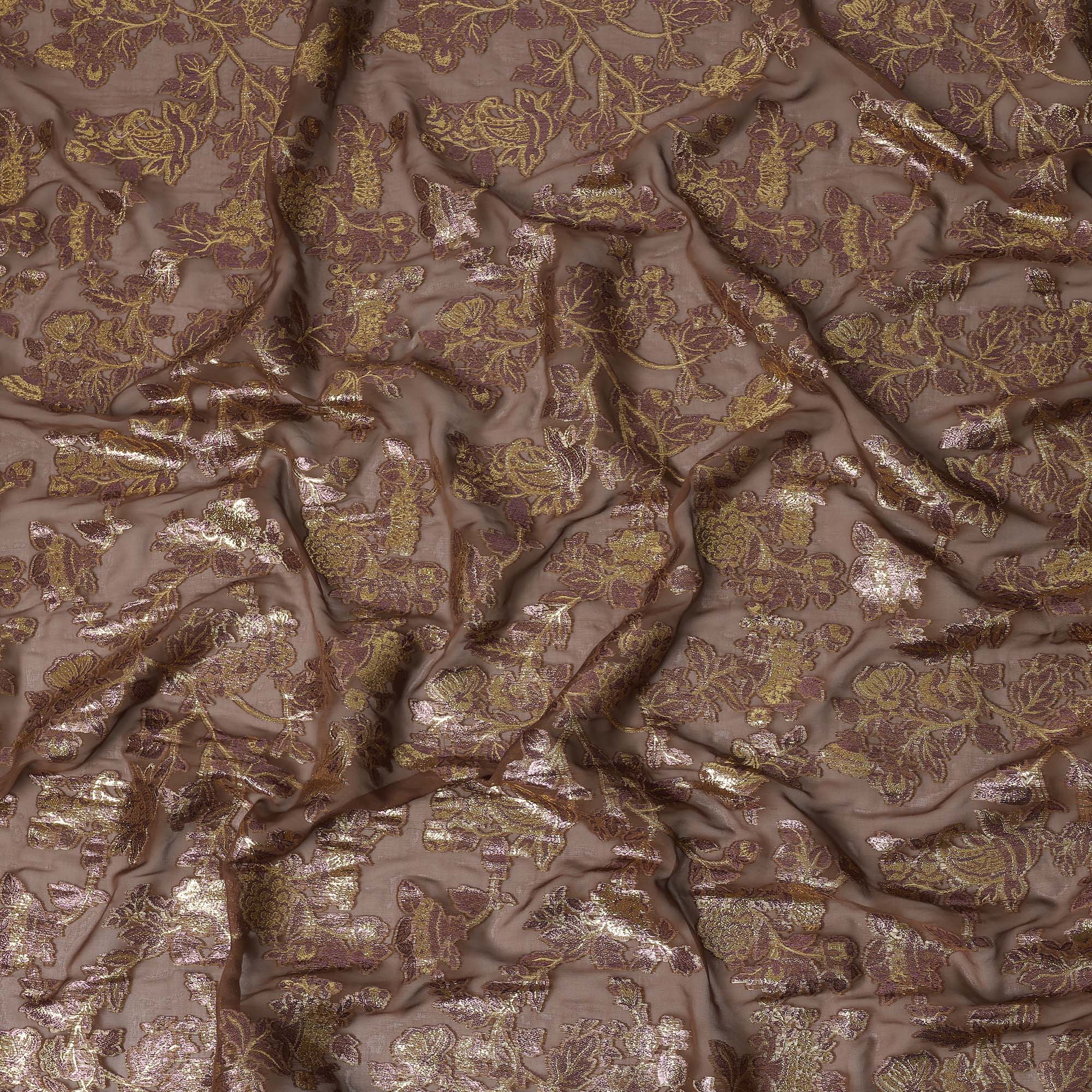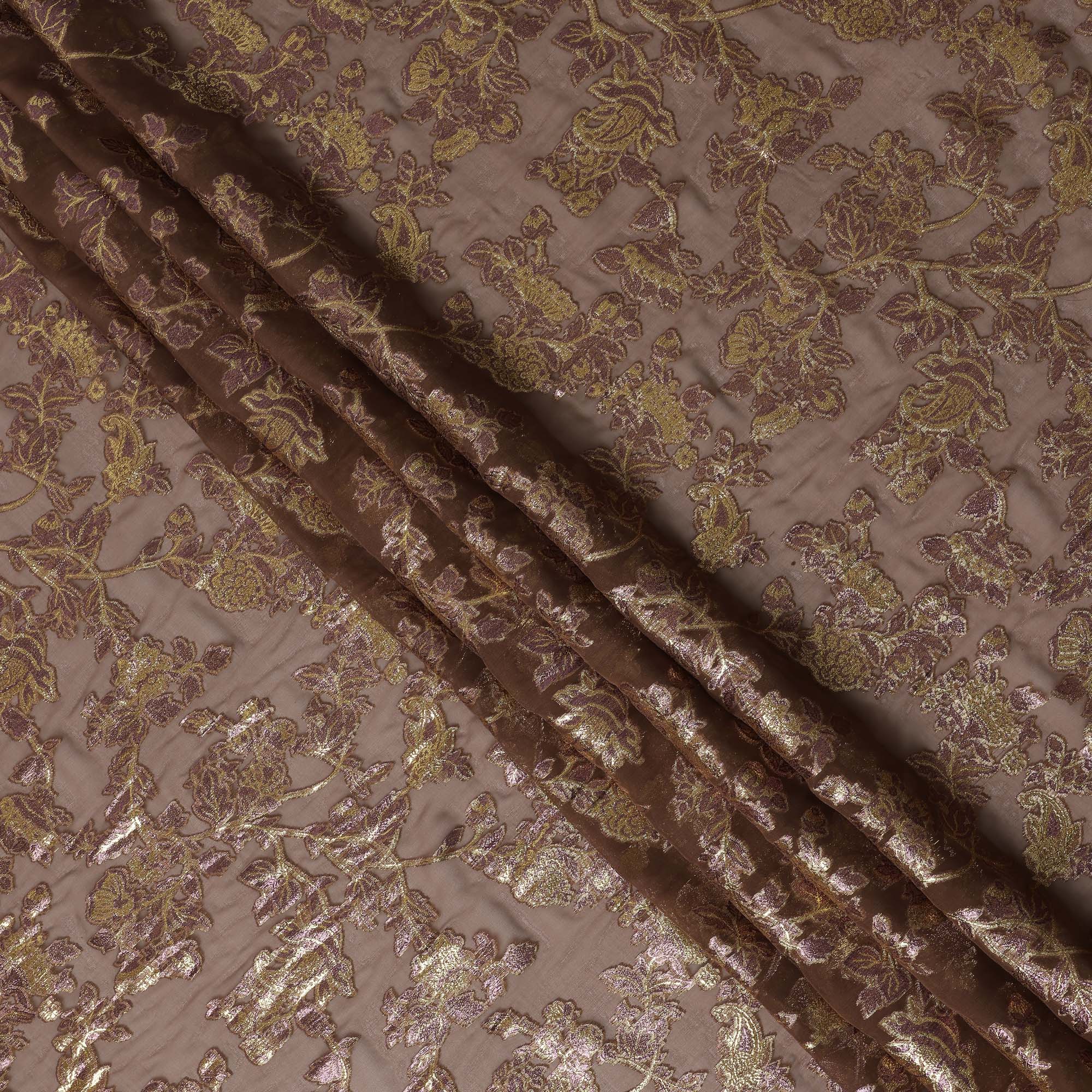 Luxurious mocha brown silk chiffon fabric with metallic floral lurex design