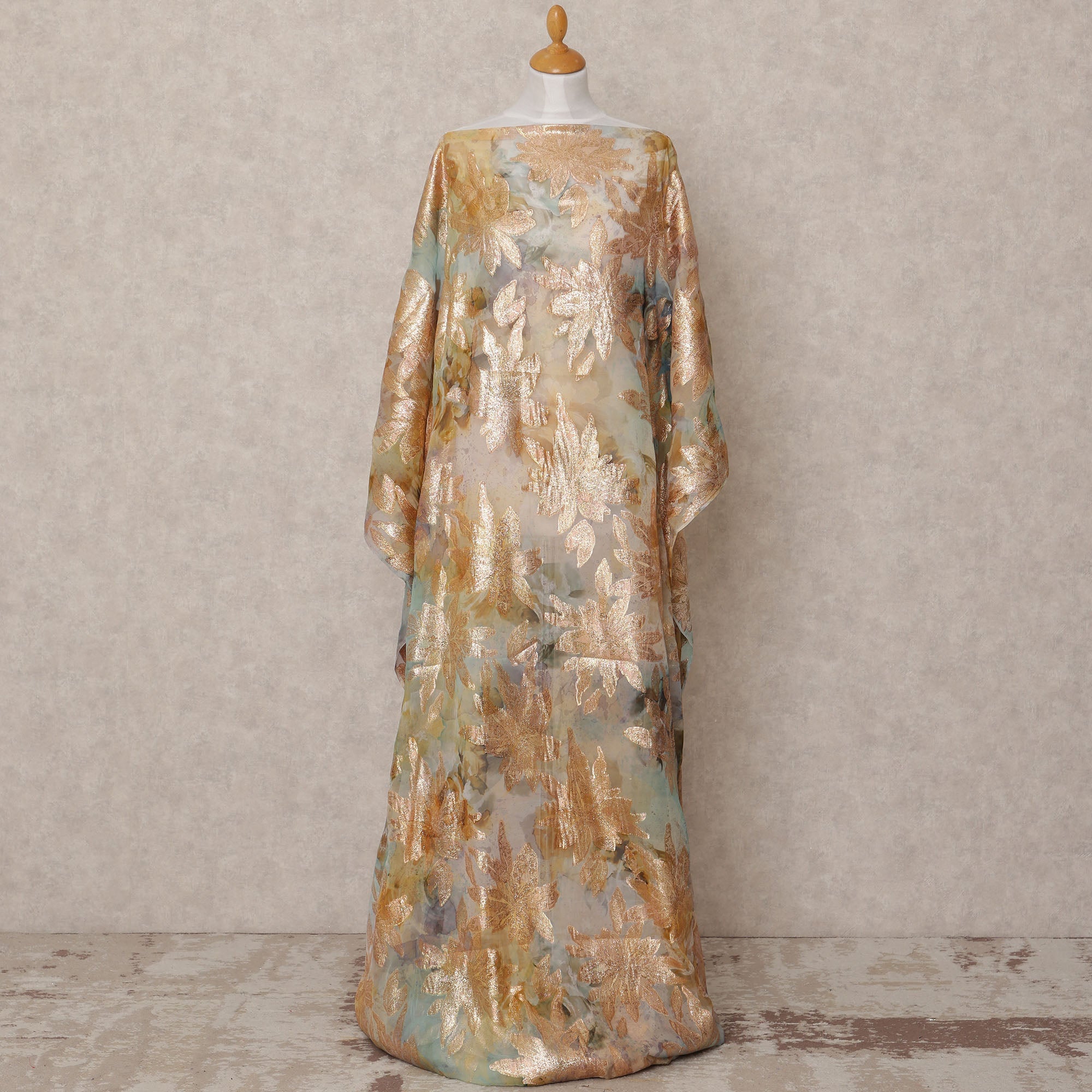 This multi-color Somali silk chiffon dirac fabric features a luxurious golden metallic lurex floral pattern set against a soft, watercolor-like... Read more Read more