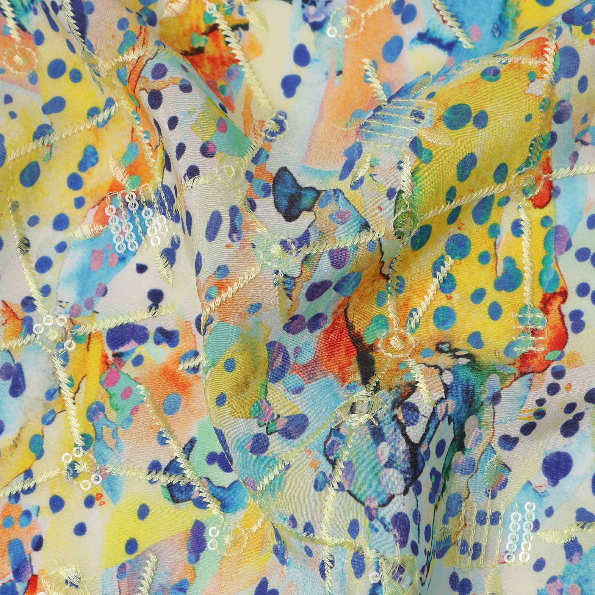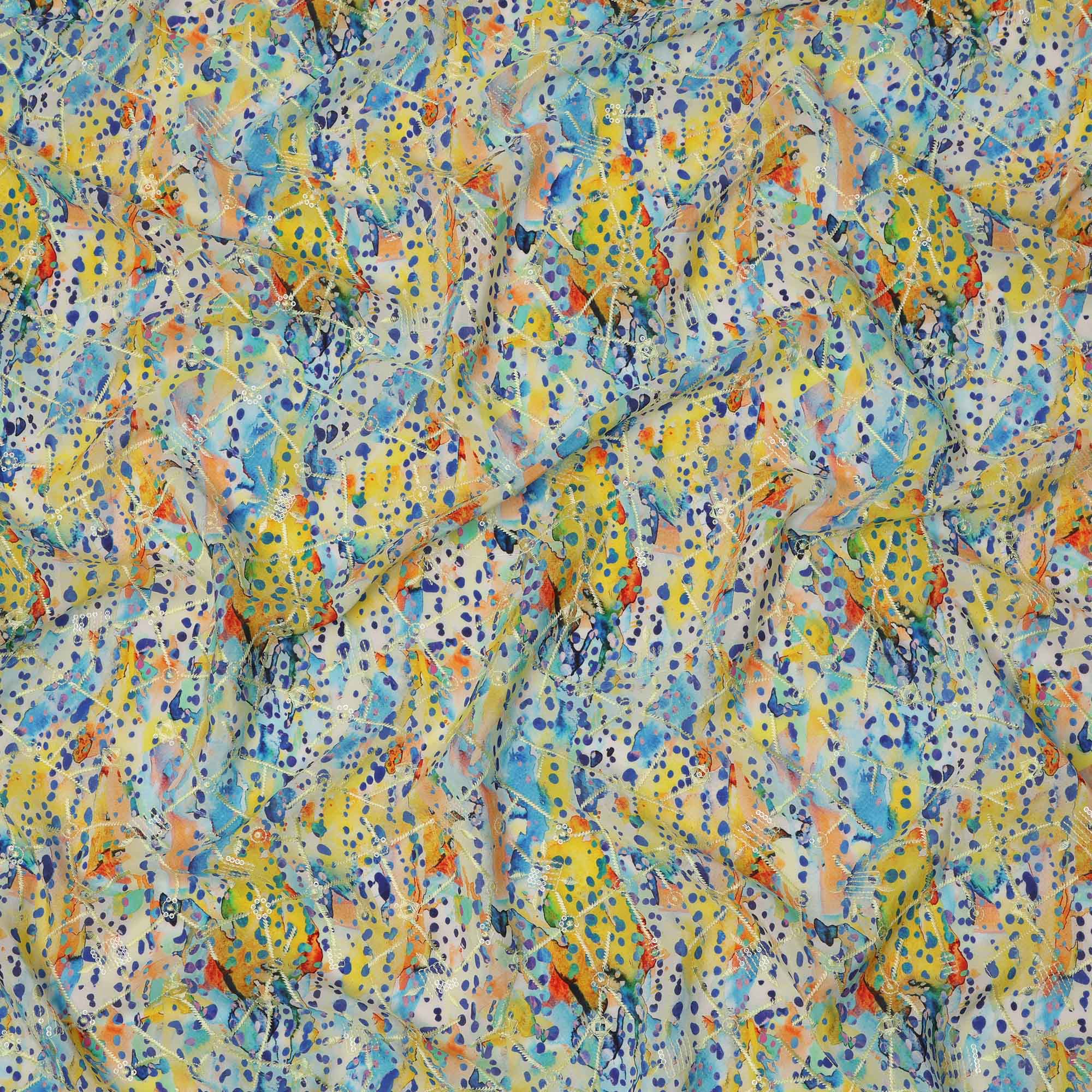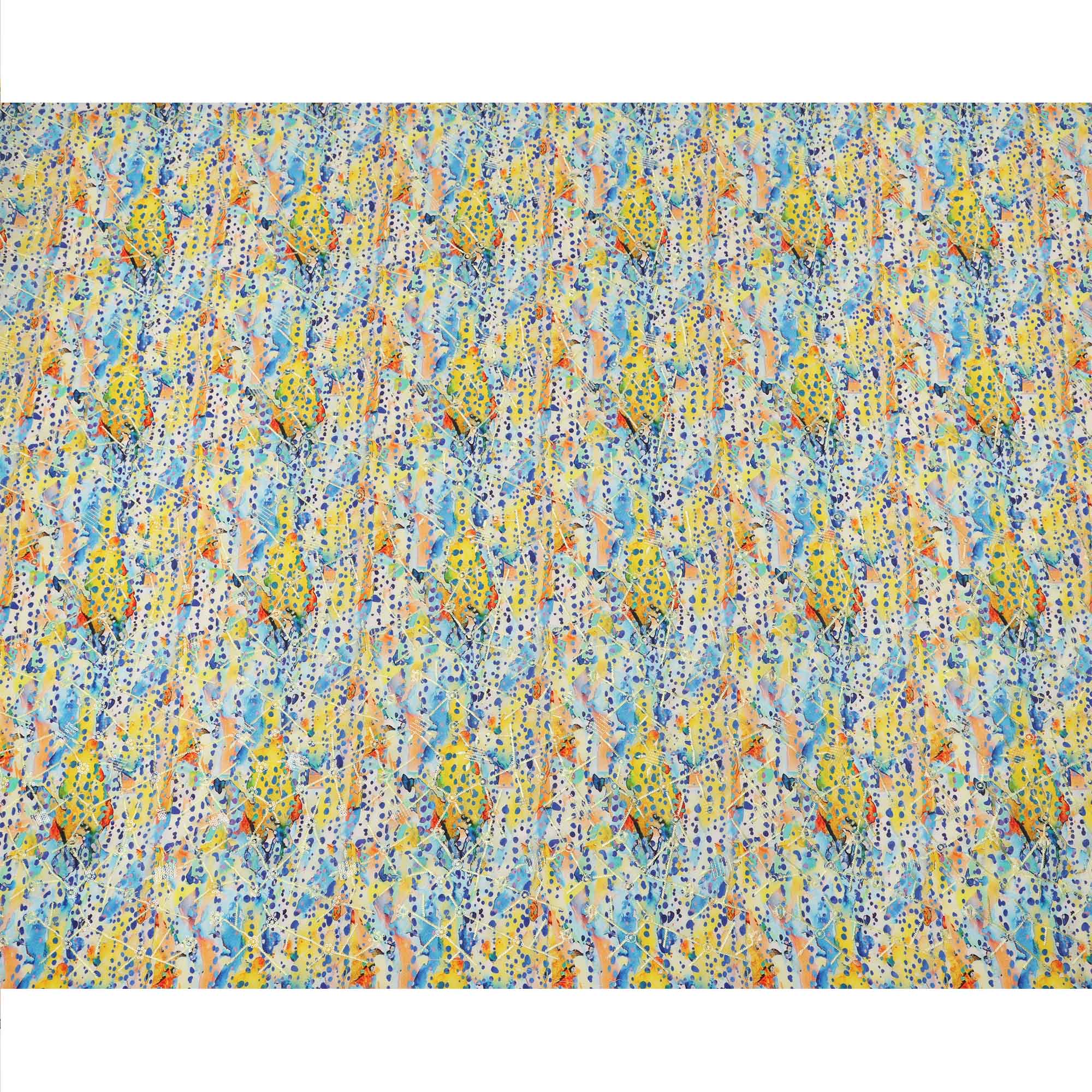 Multicolor Blue-Yellow Splash and Dot Print Viscose Crepe Fabric, 110 Cms Width, Made in India-D23604