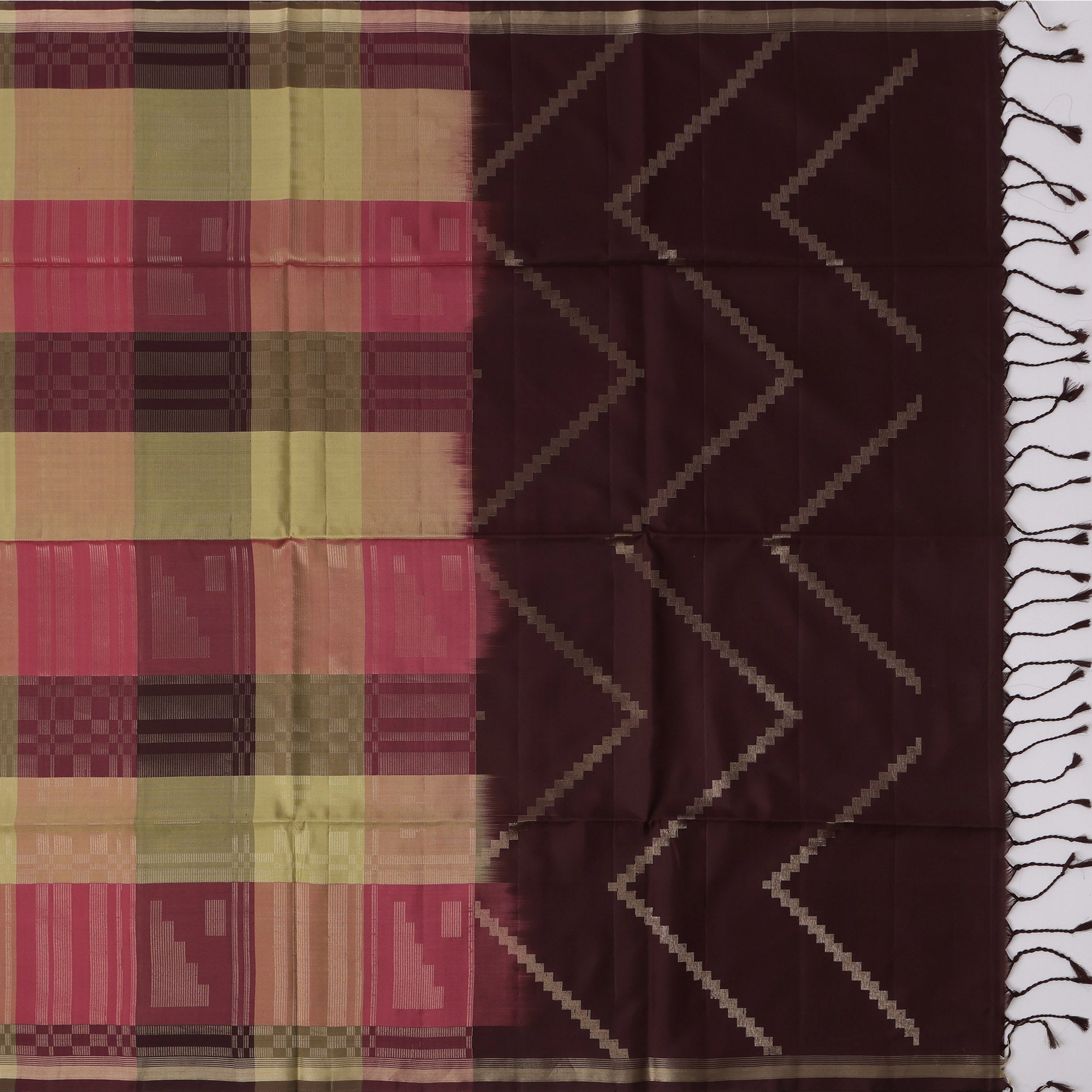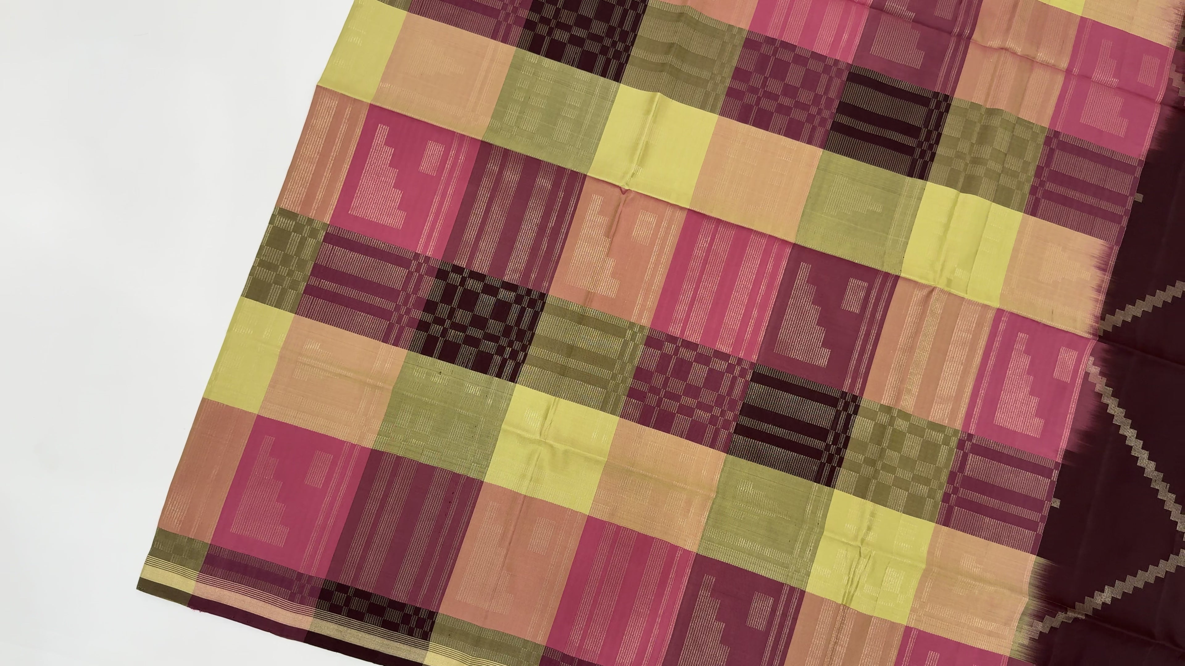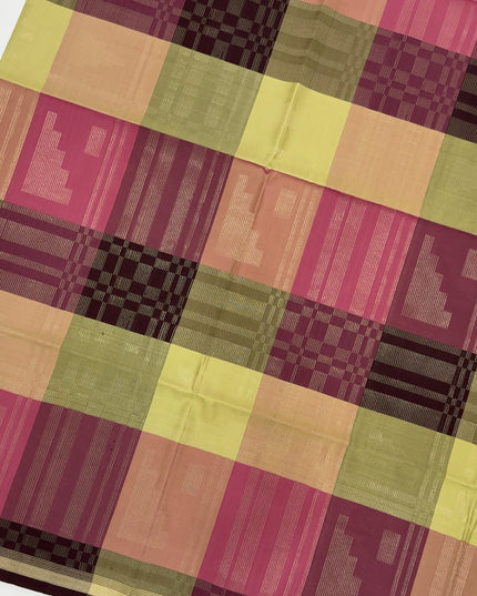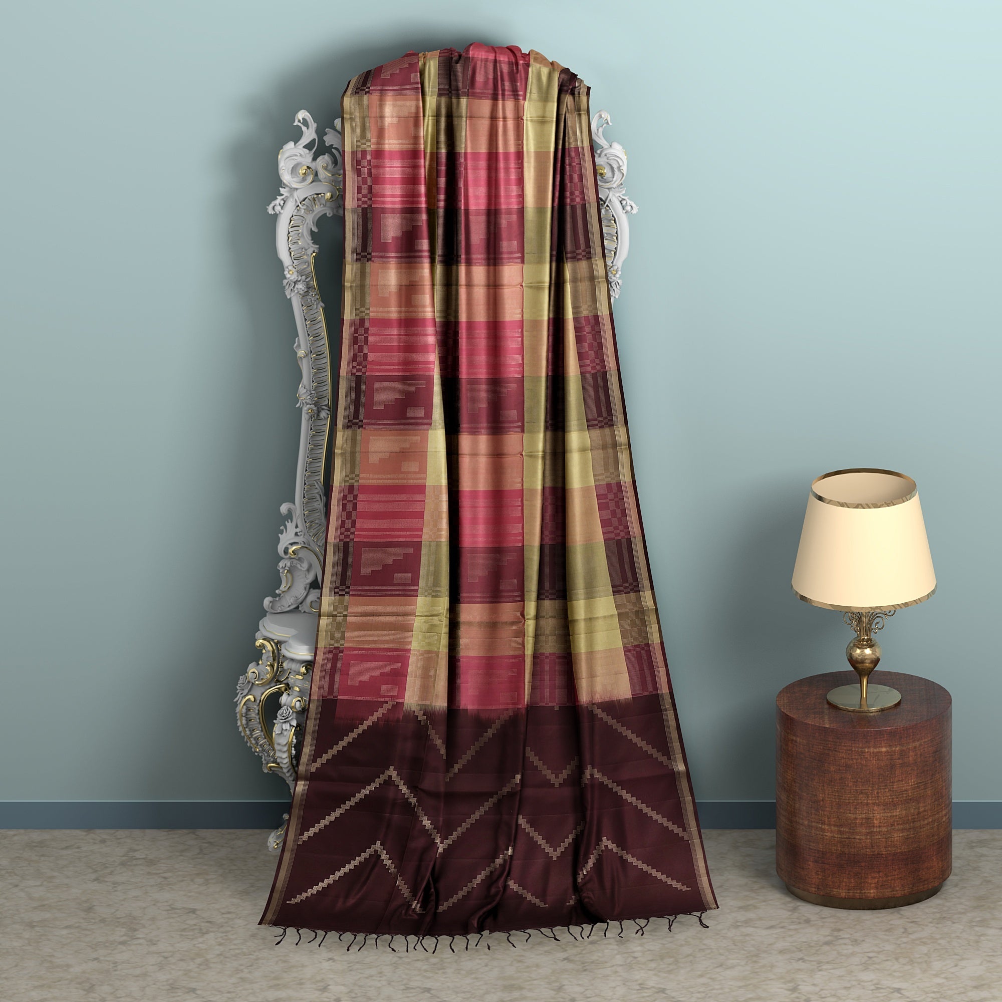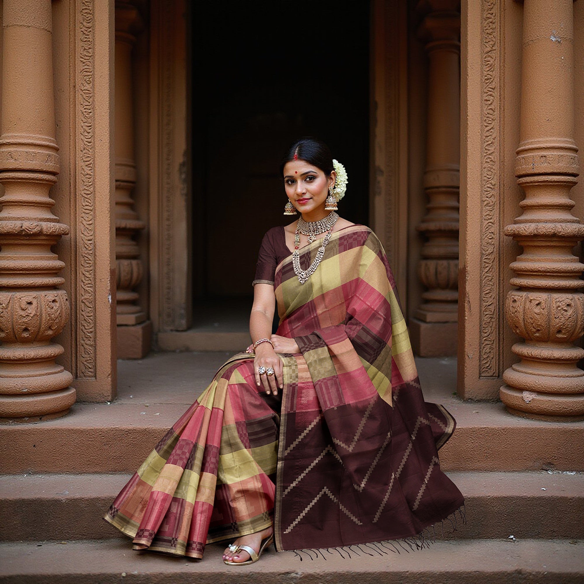 A mesmerizing fusion of tradition and artistry, this Multicolor Checked Pure Soft Silk Saree is a canvas of handwoven brilliance. The body bursts with a grid of warm tones—maroon, pink, beige, and olive—each square telling a unique visual story reminiscent of age-old temple murals. The maroon pallu is adorned with bold geometric patterns that anchor the design with depth and sophistication. Crafted meticulously over 36 hours by skilled South Indian artisans, every thread reflects dedication and heritage. The luxurious soft silk drapes gracefully, promising both elegance and comfort for festive gatherings or cultural events. With its contemporary layout rooted in classical aesthetics, this saree offers wearable legacy. Dry clean recommended for longevity. Shop online for an heirloom that speaks volumes.