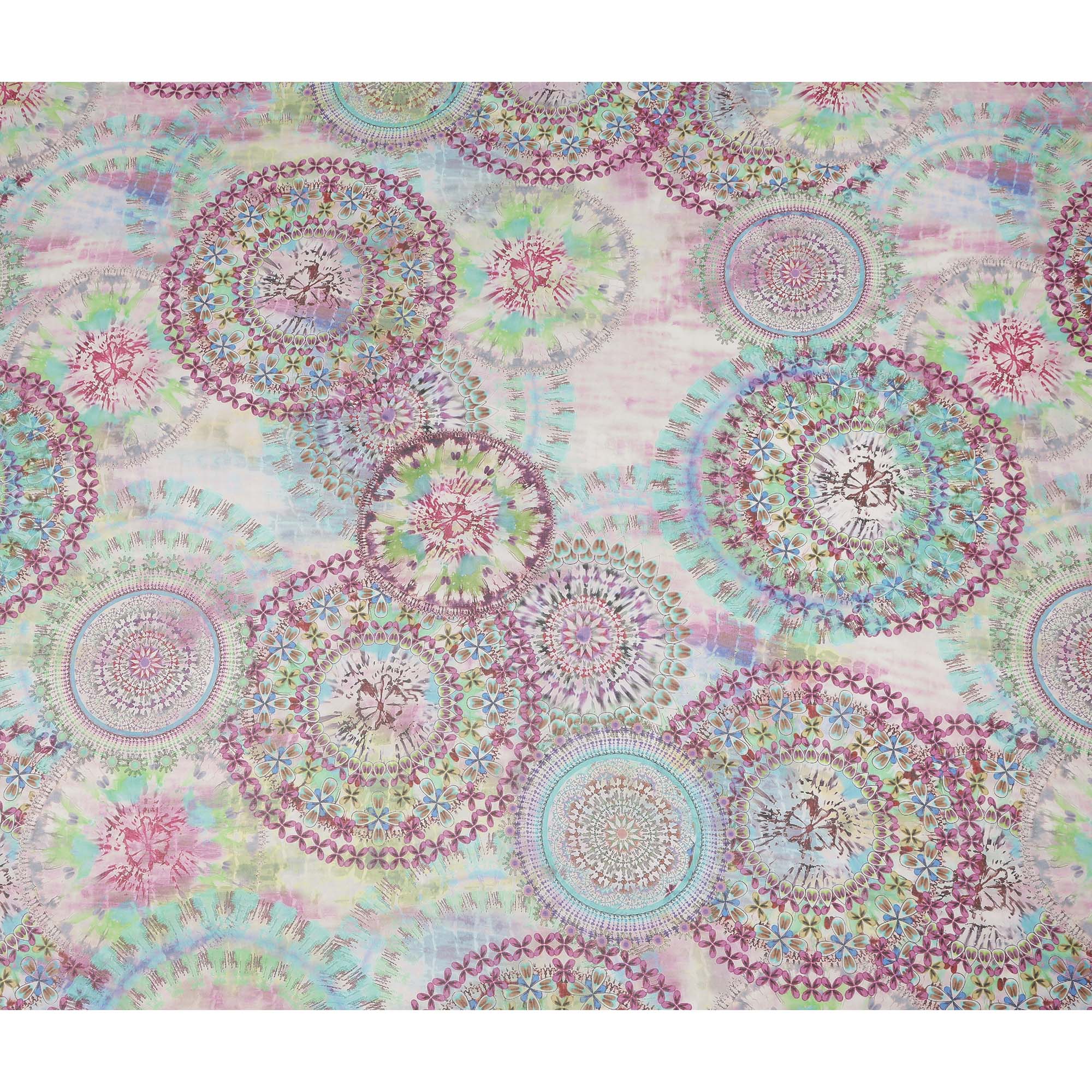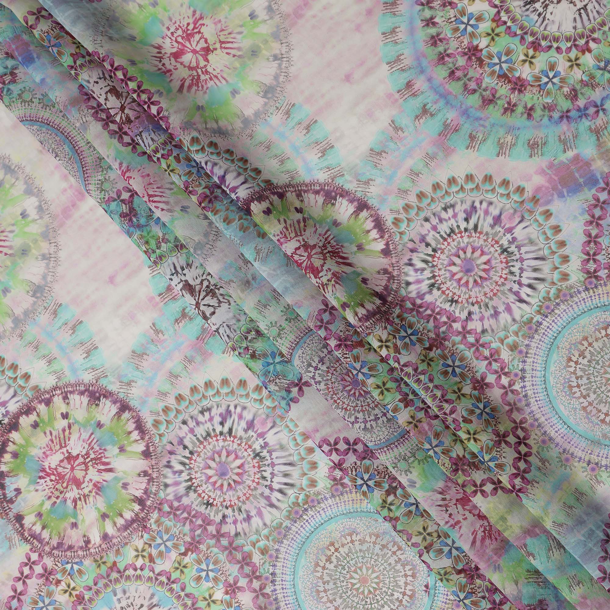 This multicolor floral paisley mandala printed cotton voile fabric features a beautiful blend of pastel pink, aqua, mint green, and soft lavender tones arranged in intricate circular patterns that create a vibrant yet elegant look. Crafted from lightweight and breathable cotton voile, it offers a soft, smooth texture that feels gentle against the skin, making it ideal for summer dresses, tunics, scarves, dupattas, and stylish home décor accents. With a generous 150 cms width, this fabric provides ample coverage for creative projects while maintaining an airy drape that enhances comfort and movement. Perfect for designers, boutique owners, and DIY enthusiasts seeking colorful, versatile fabric from India.