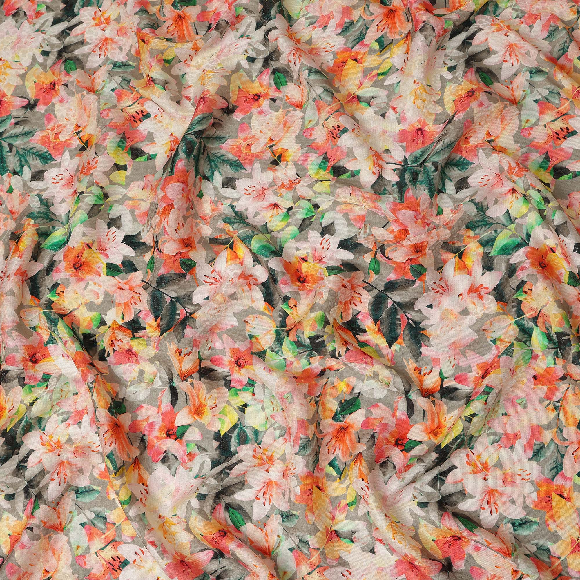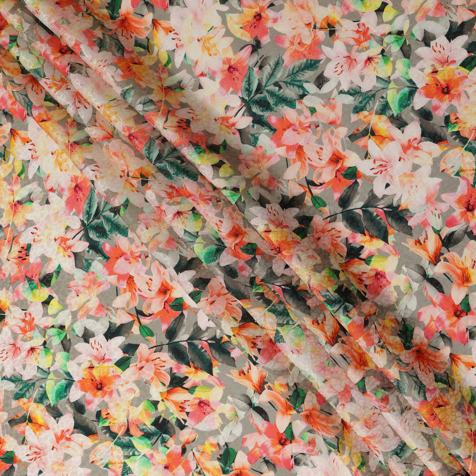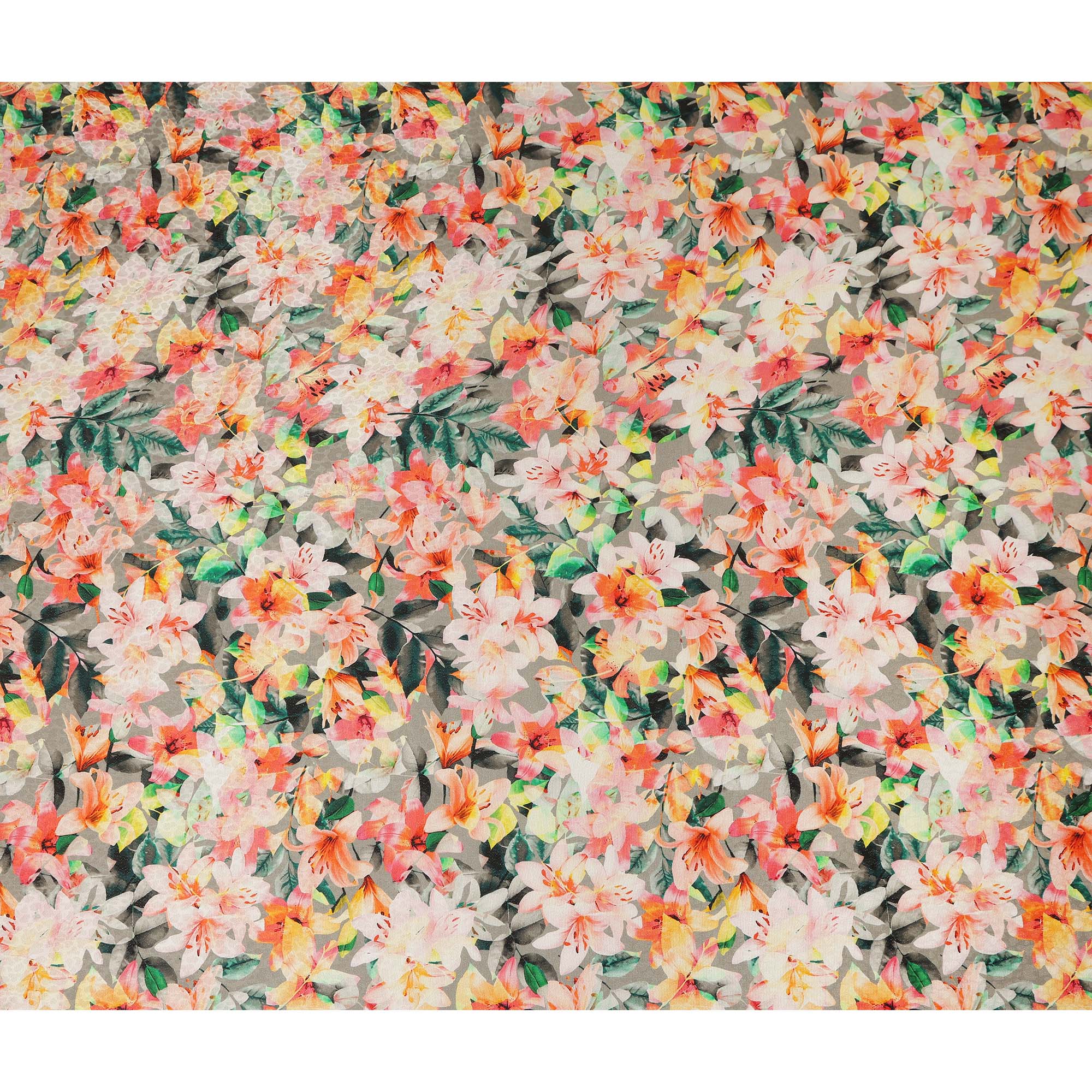 This multicolor floral printed viscose crepe fabric features a vibrant spread of peach, coral, and soft yellow blossoms layered beautifully... Read more Read more