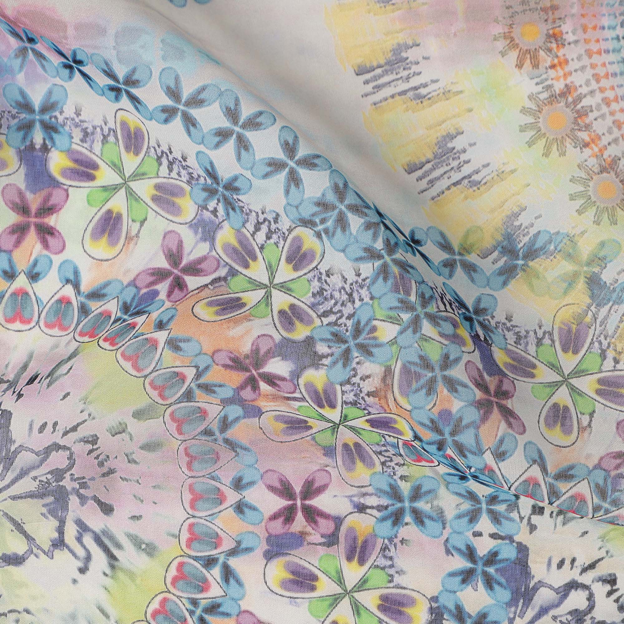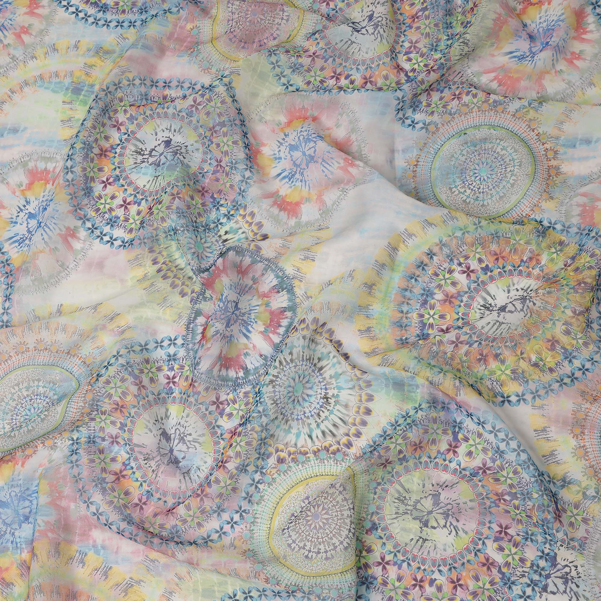 This multicolor mandala floral printed cotton voile fabric showcases a stunning blend of blue, yellow, green, pink, and soft pastel... Read more Read more