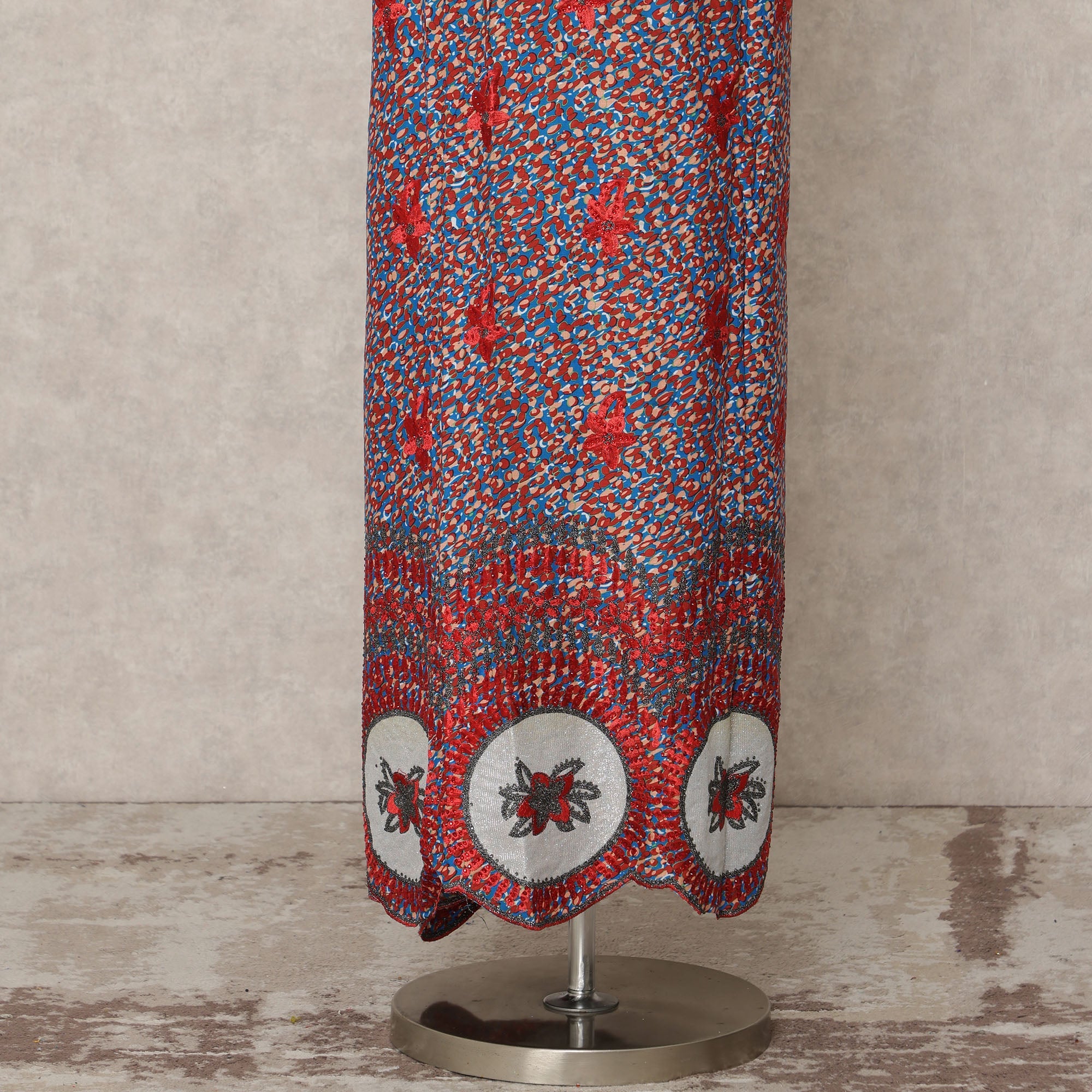 Brighten your ethnic wardrobe with this lively multicolor red blended cotton fabric, featuring vibrant red floral motifs spread across a textured background of blue, yellow, and white micro patterns. Crafted in India, this 3.0-meter fabric with a width of 130 cms is ideal for creating stunning ethnic wear such as sarees, kurtis, or Indo-western outfits. The fabric’s lower border steals the spotlight with intricately embroidered white circular medallions filled with contrasting black and red floral designs, framed in a scalloped red edge that enhances the garment’s overall richness. Made from premium blended cotton, it ensures comfort and breathability, while the colorful design offers a playful yet traditional aesthetic. Whether you’re stitching it for festive wear or a bold everyday look, this fabric delivers charm, tradition, and modern flair. Buy online now and bring home the elegance of Indian craftsmanship and color-infused fabric styling.