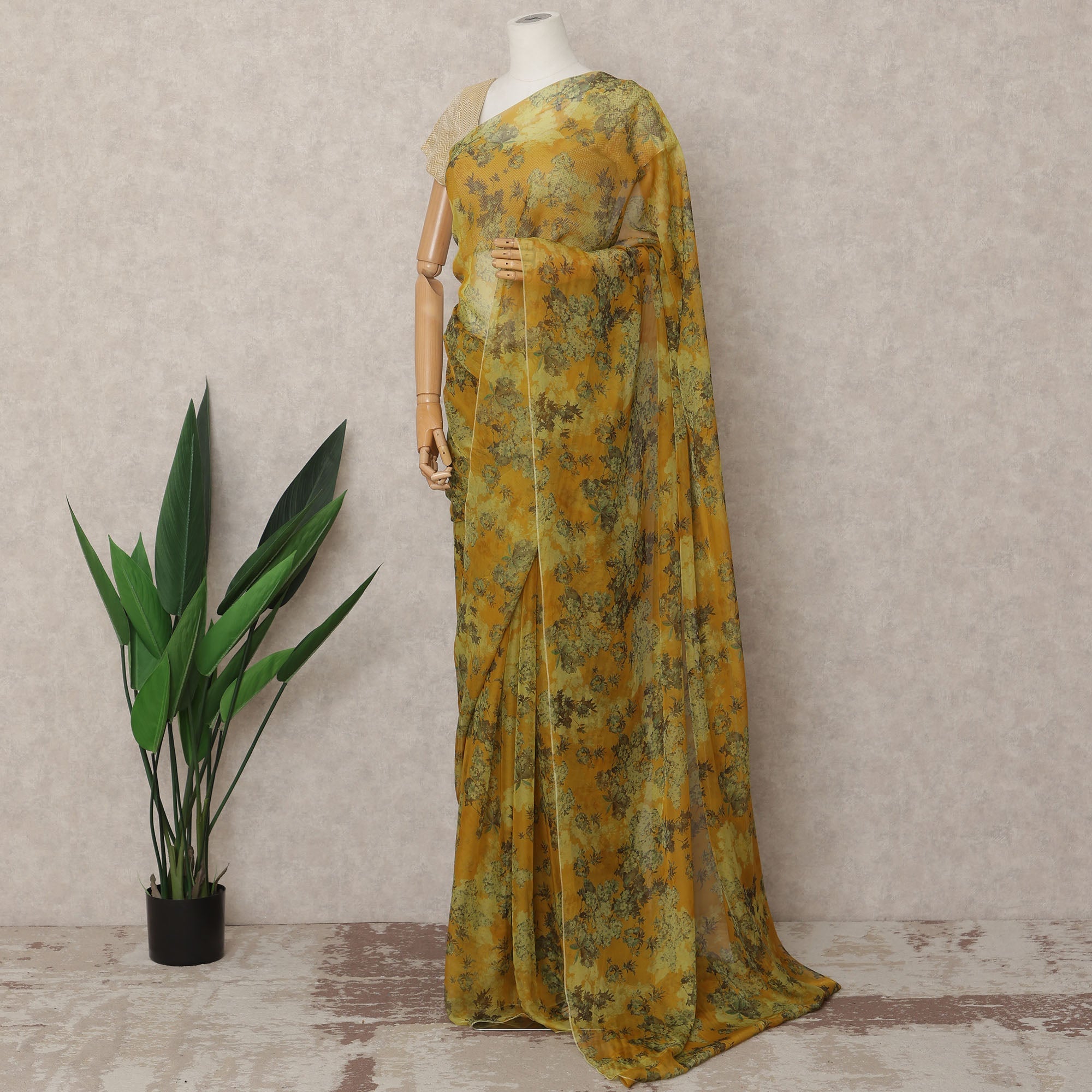 Mustard Green Premium Silk Chiffon Saree with Floral Print, 5.5 Mtrs Length, 110 Cms Width, Made in South Korea-D24310