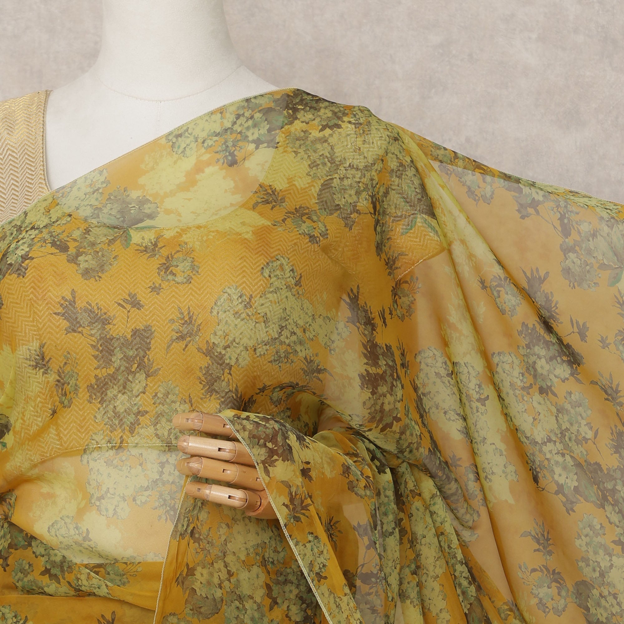 Mustard green base enriched with delicate green floral print for a serene appeal