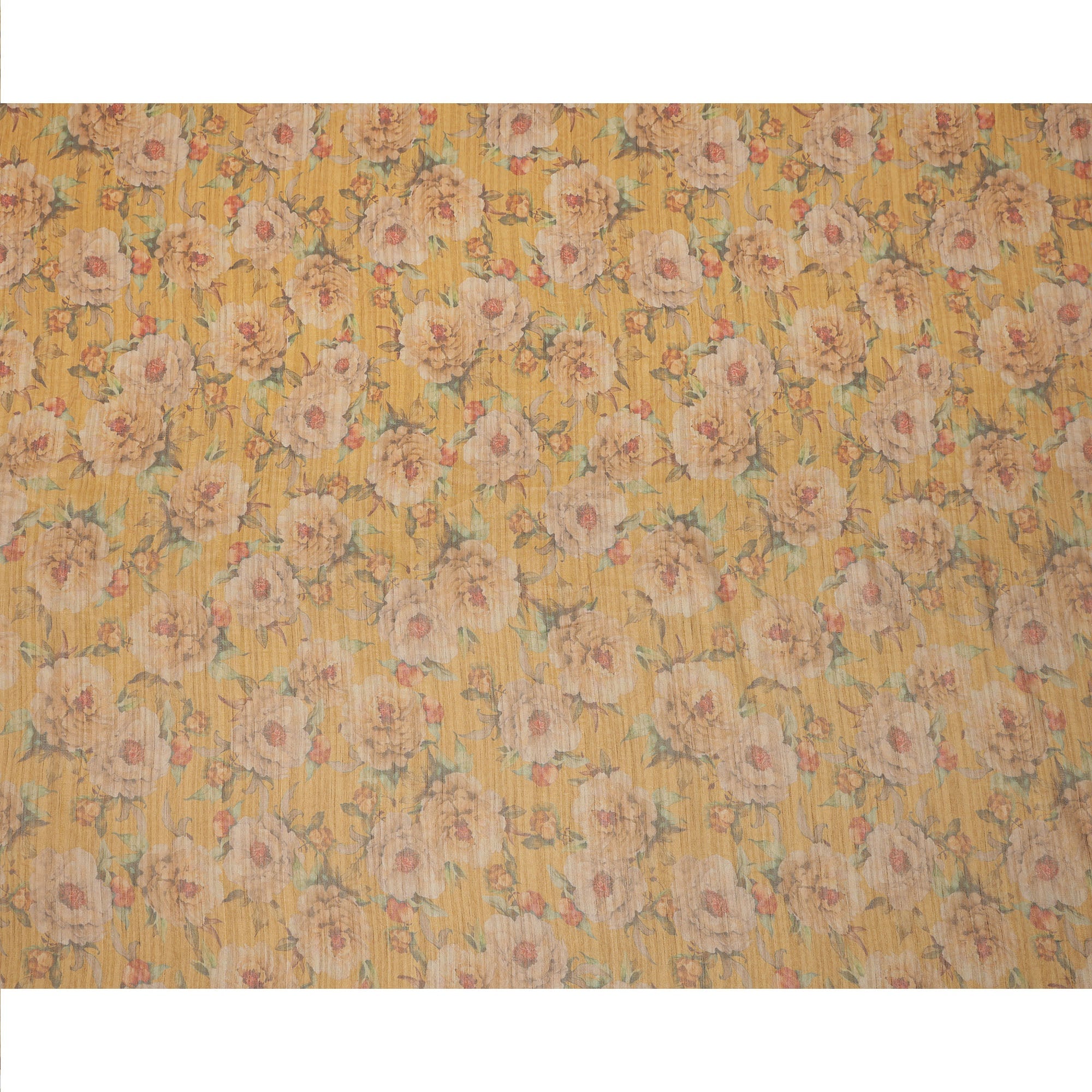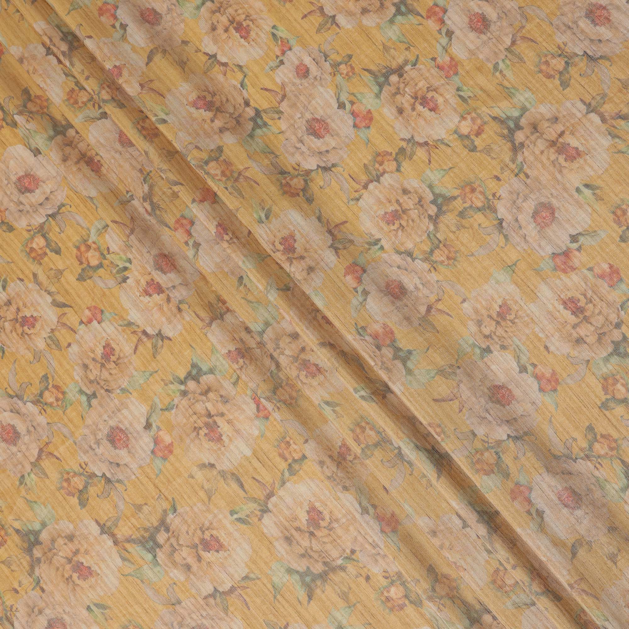 Mustard Yellow Base Floral Printed Viscose Tussar Fabric with Beige Blooms and Green Leaves, 110 Cms Width, Made in India-D24348