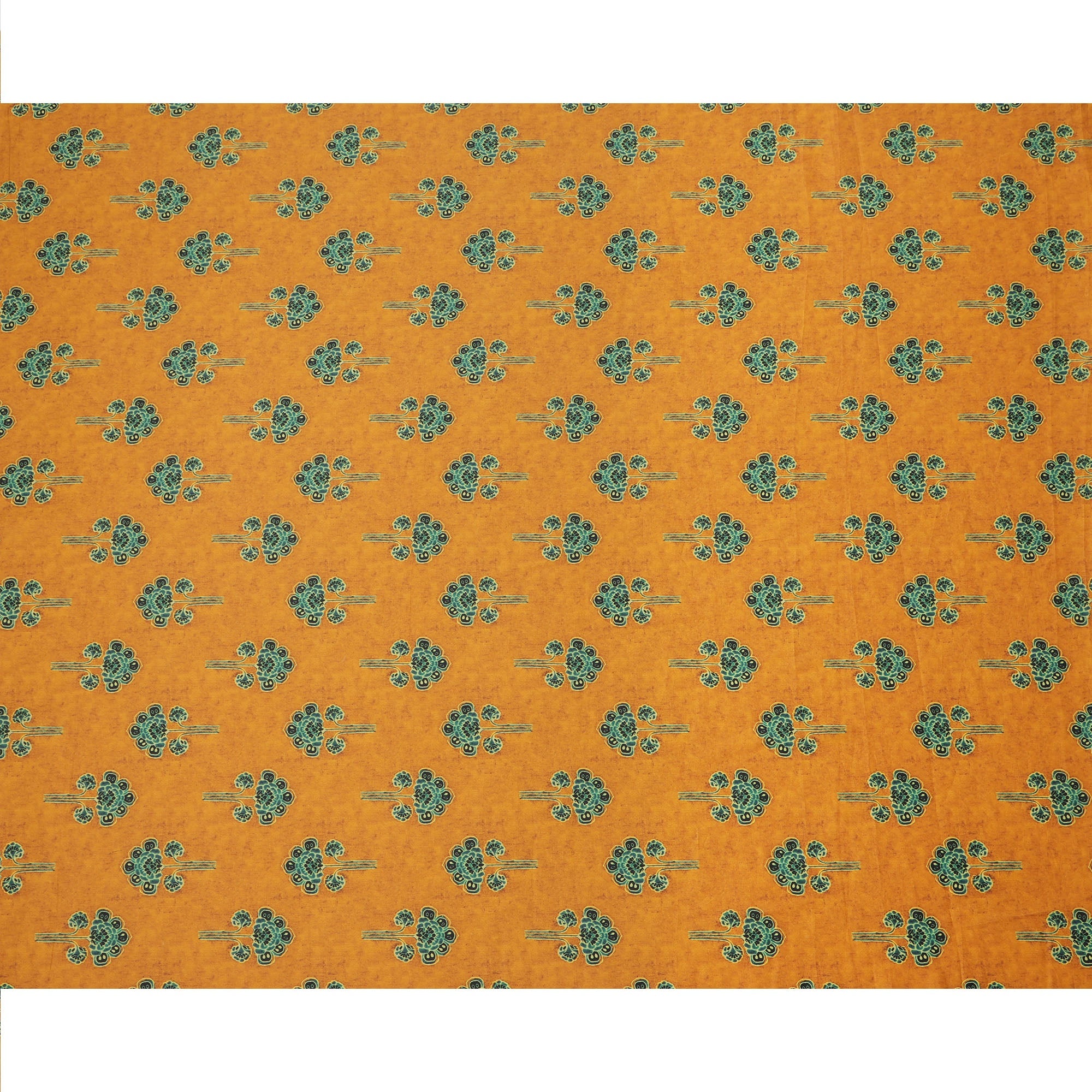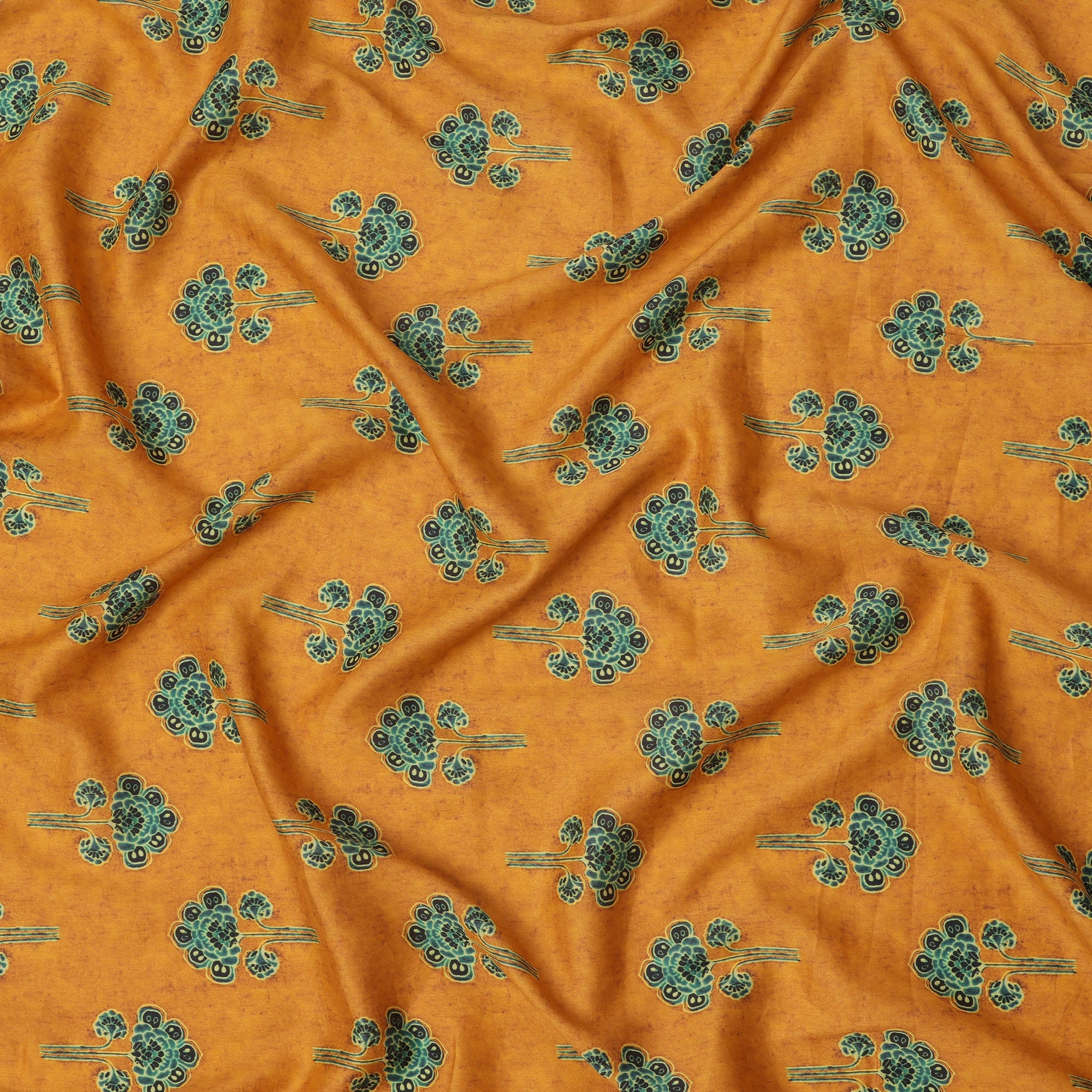 Mustard Yellow Cotton Lawn Fabric with Ethnic Green Floral Motif Print, Width 110 Cms, Made in India-D23949