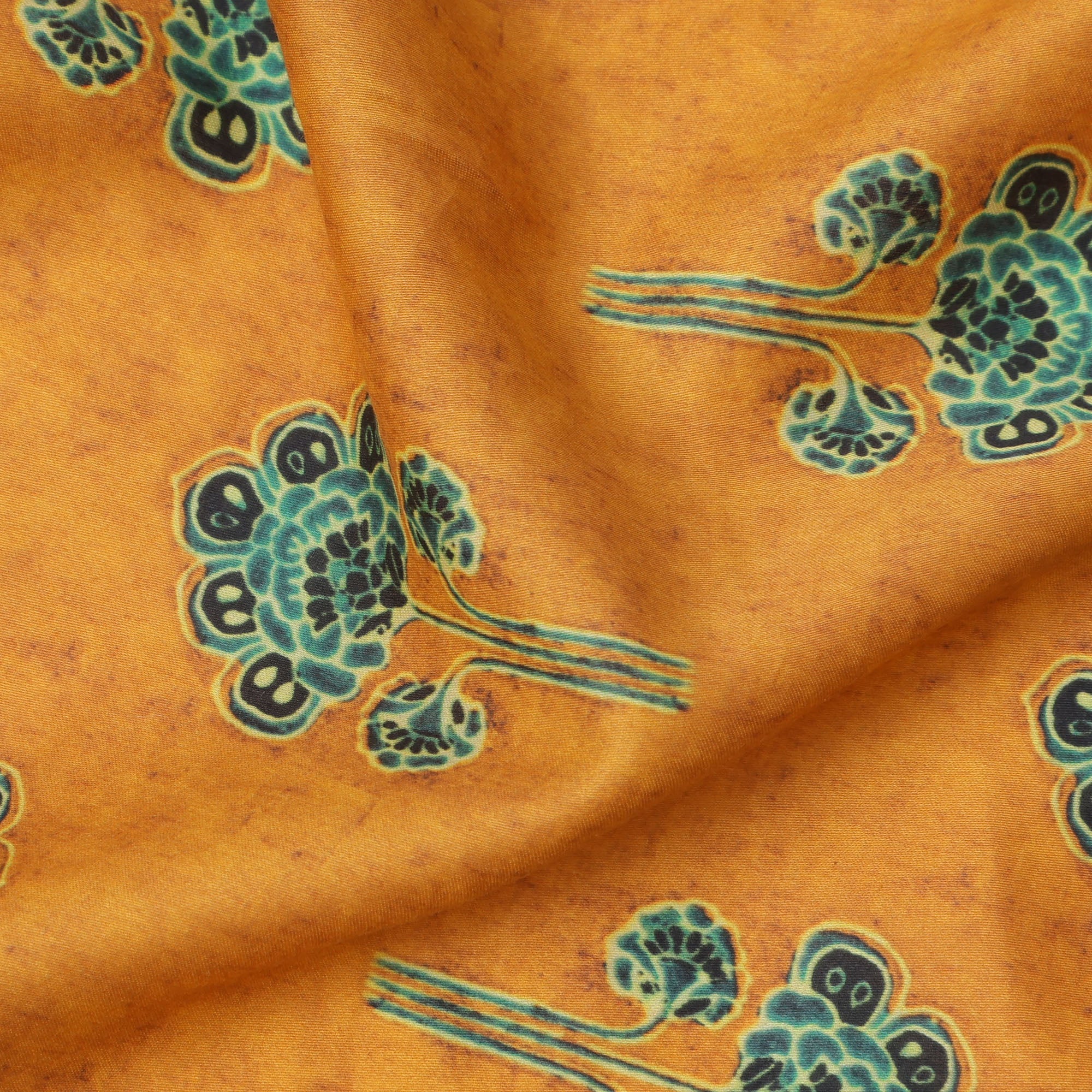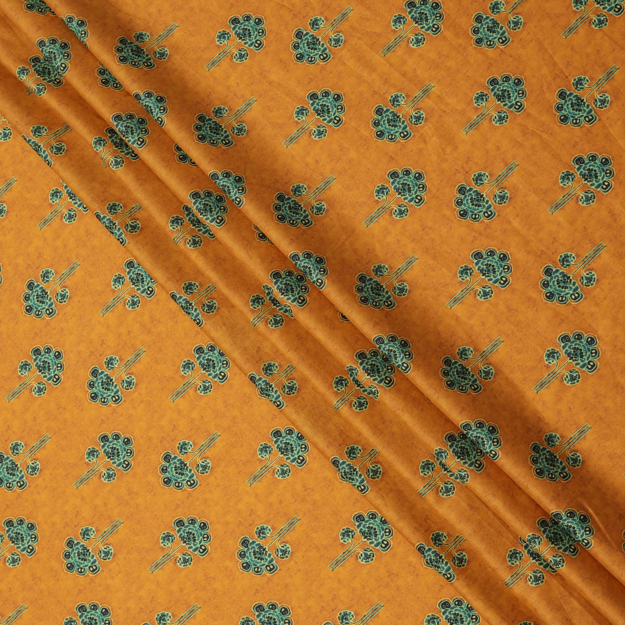 This Mustard Yellow Cotton Lawn Fabric features a charming array of stylized green floral motifs scattered uniformly across its warm,... Read more Read more