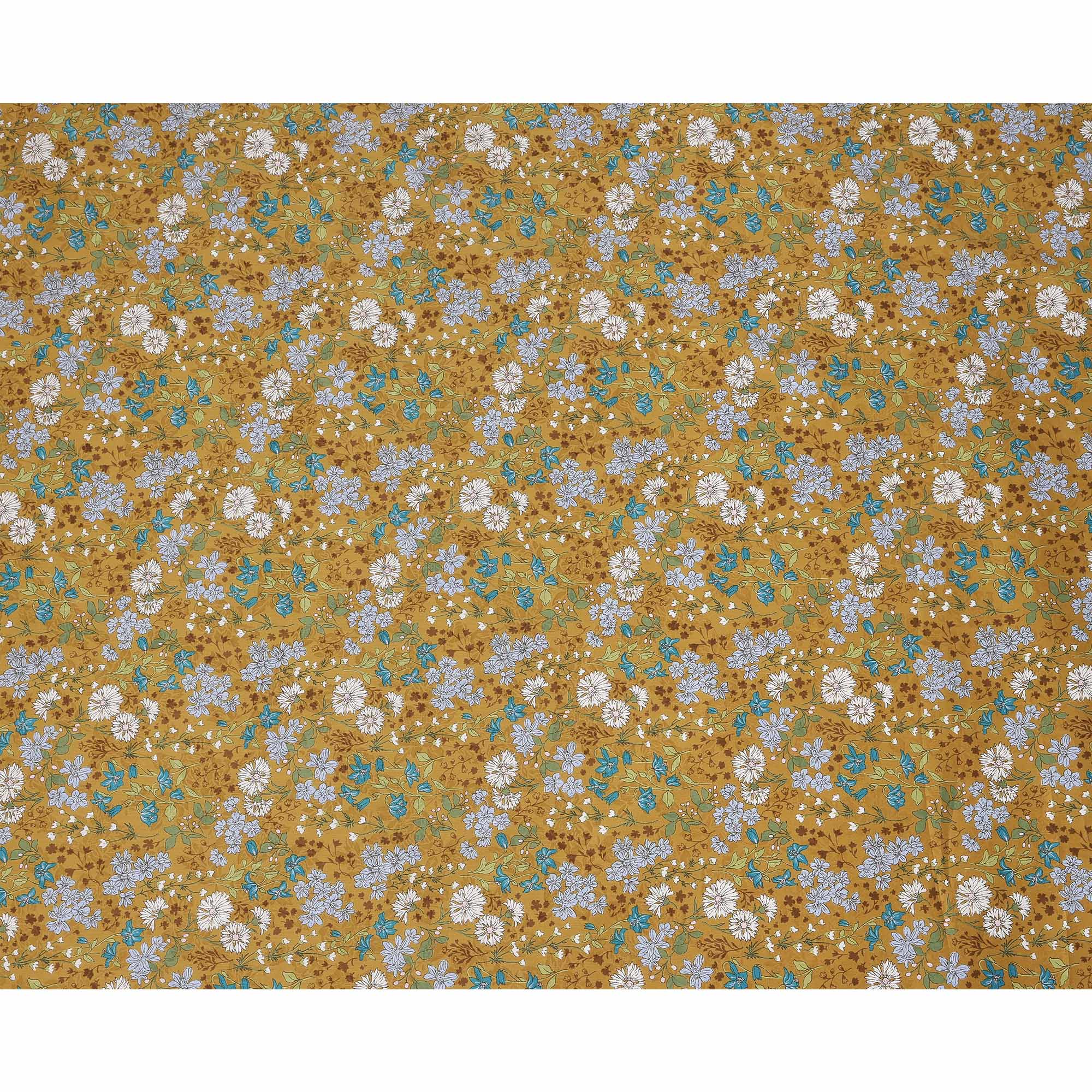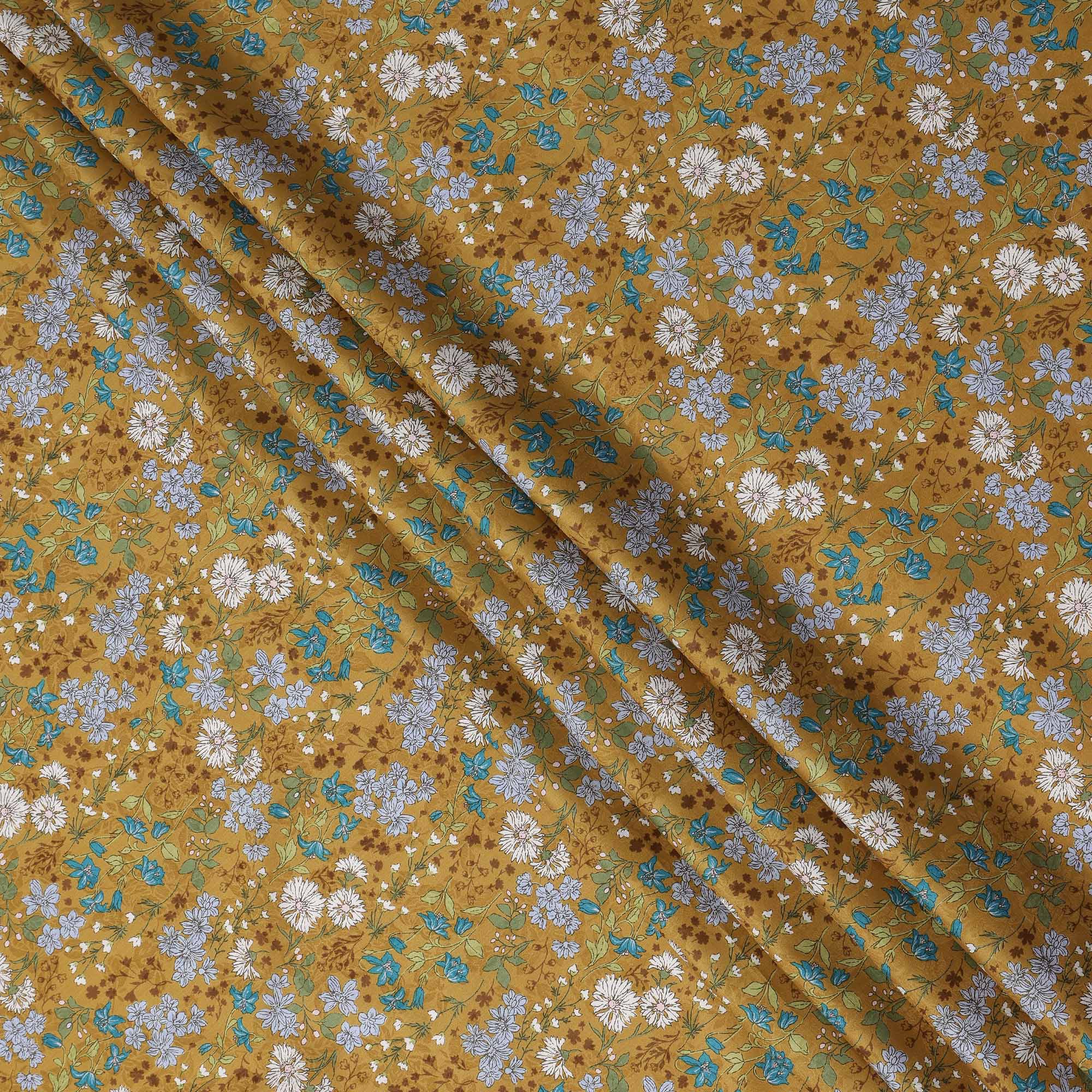 Mustard yellow cotton lawn printed Fabric with teal, white and sage botanical floral, 110 Cms Width, India-D25285