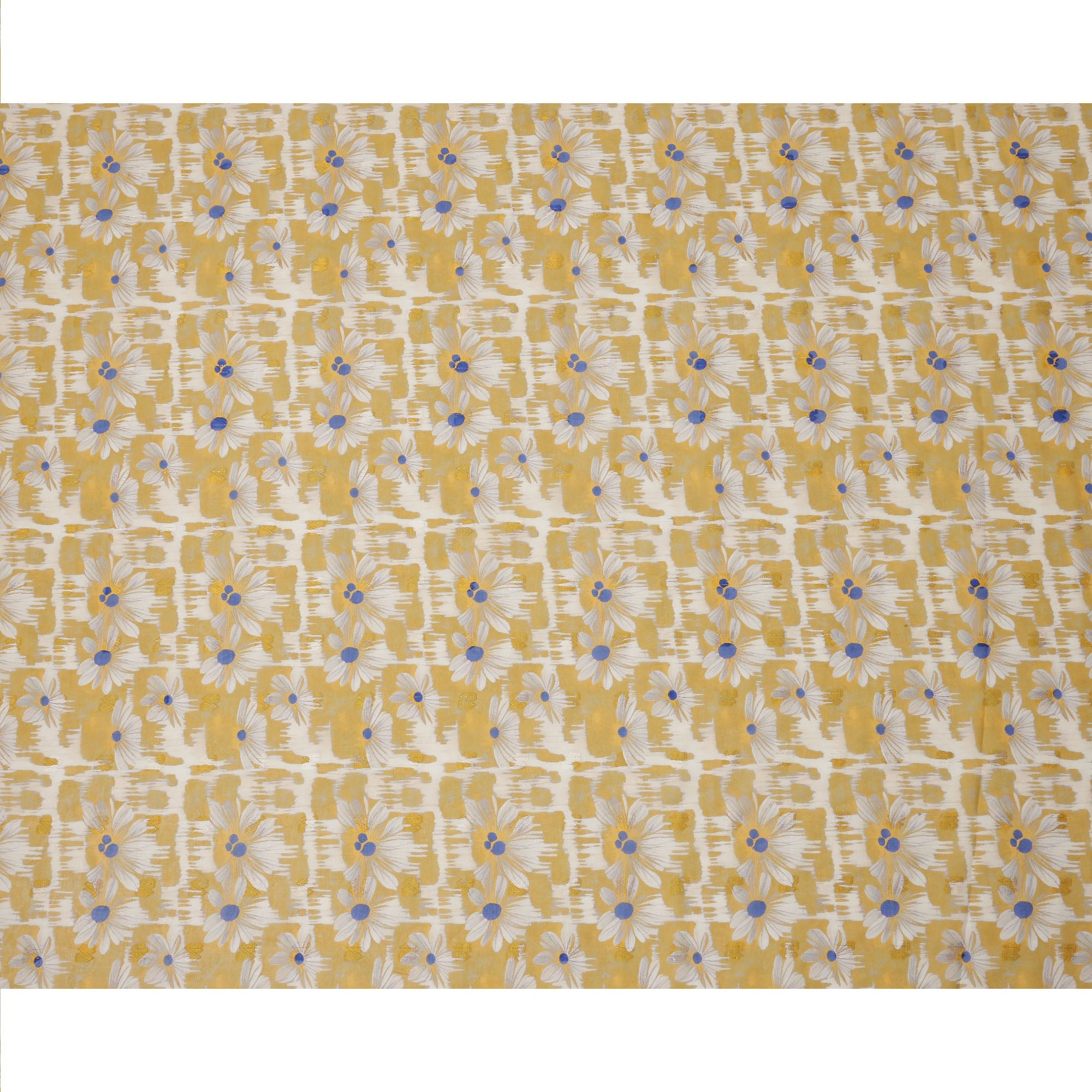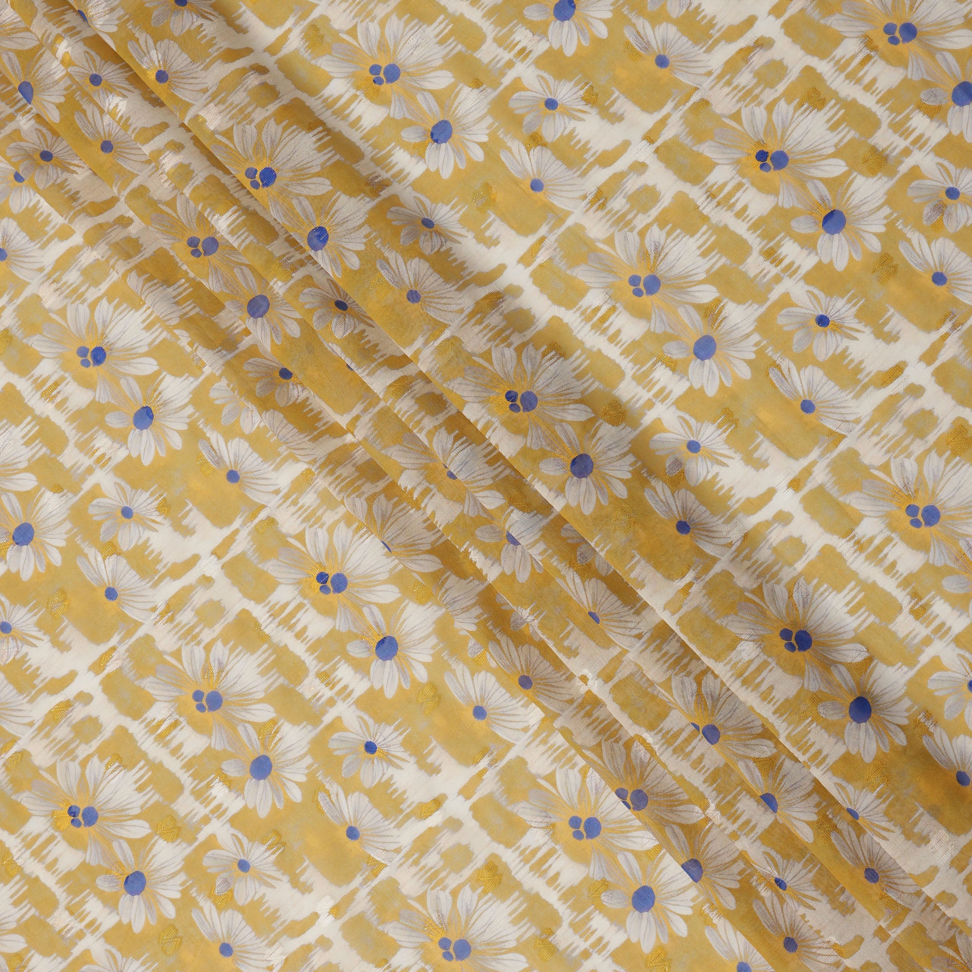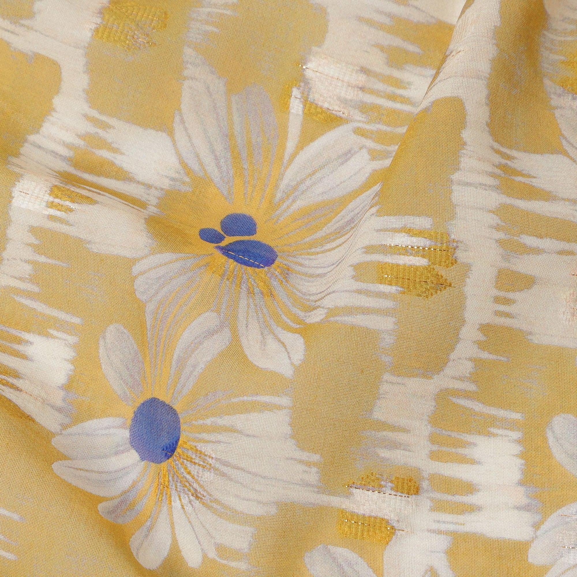 Mustard Yellow Daisy Floral Print Cotton Voile Fabric with White and Blue Accents on Abstract Base, 140 Cms Width, Made in India-D24336