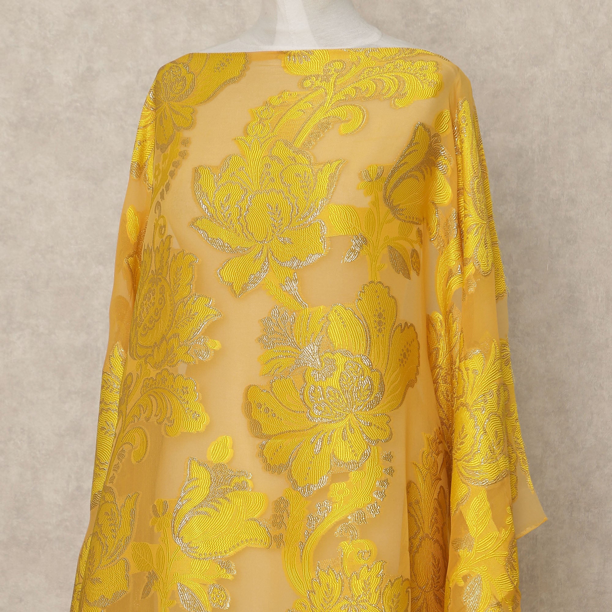 • Sale -20% Mustard Yellow Floral Traditional Somali Premium Fransawi Silk Chiffon Dirac Fabric With Metallic Lurex 3.5 Mtrs 140 Cms Width France-D28033
