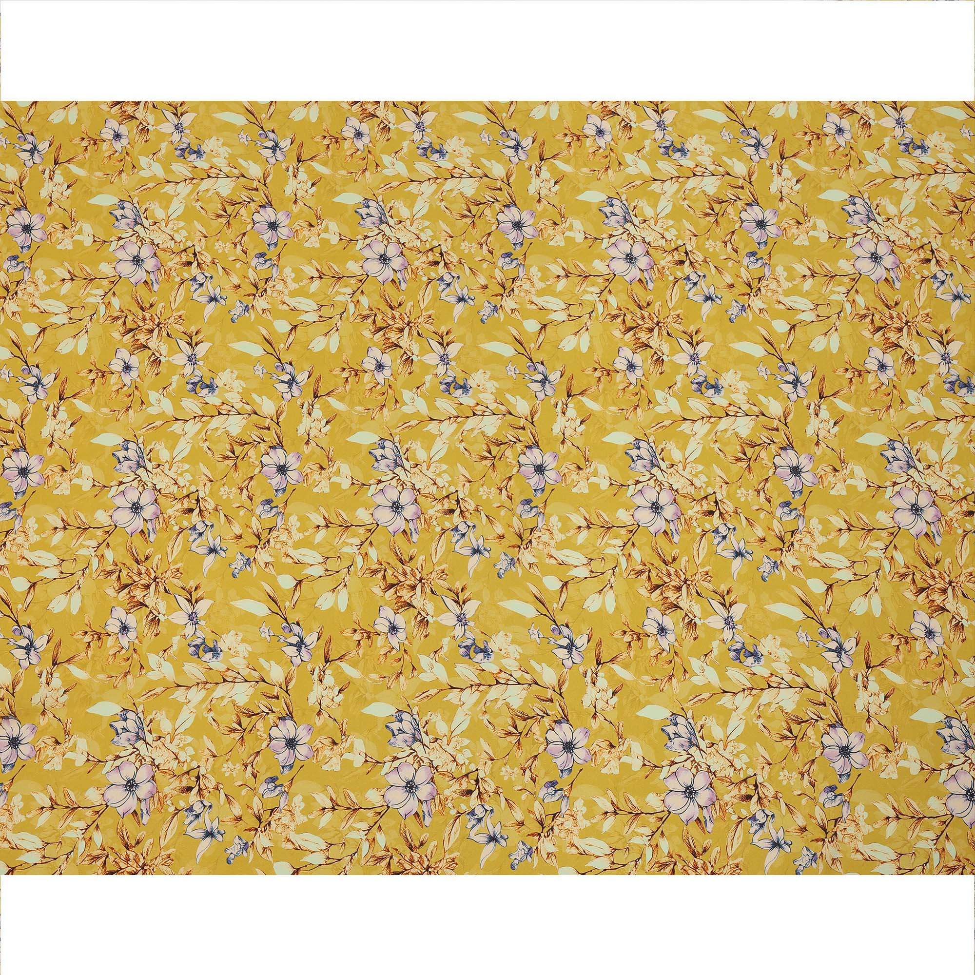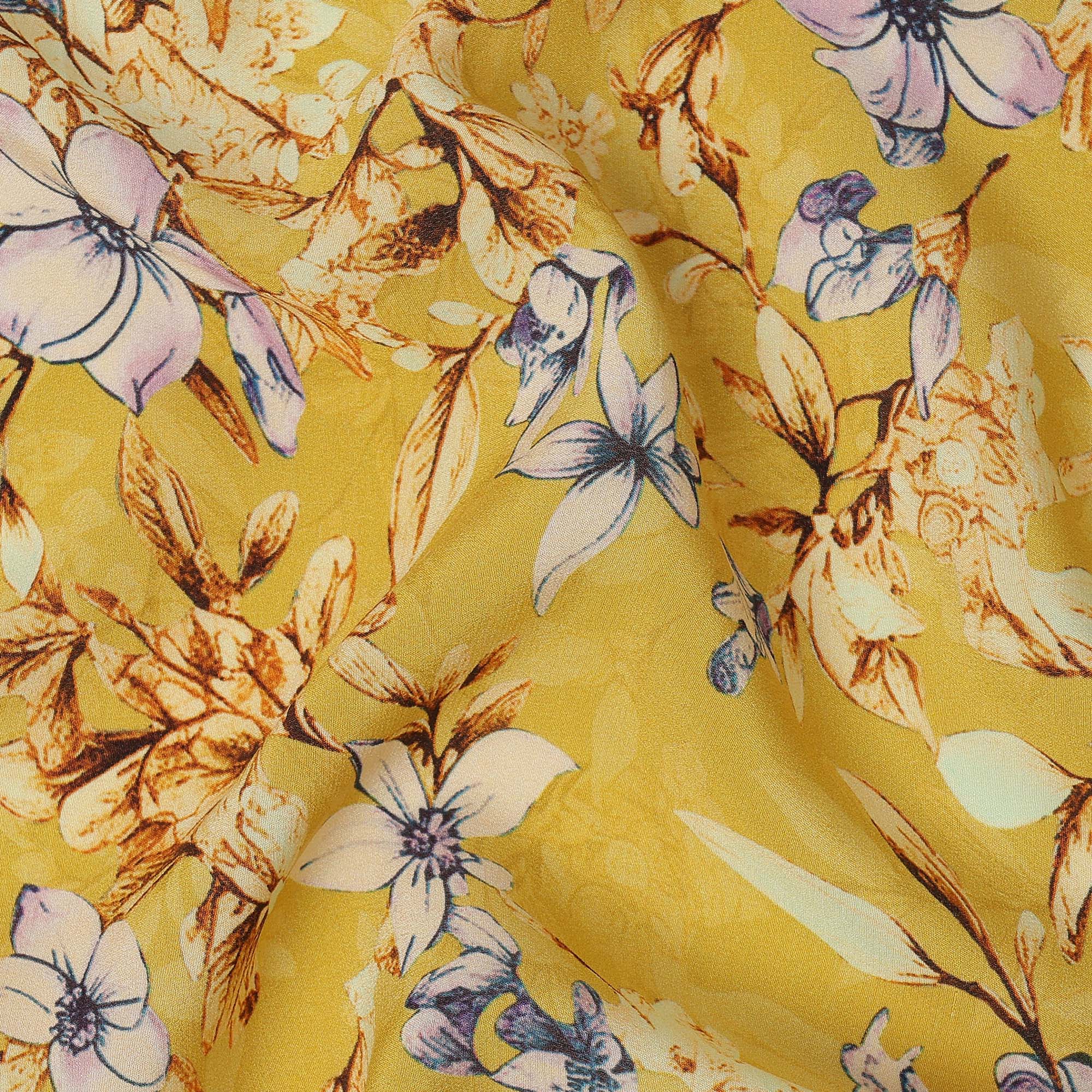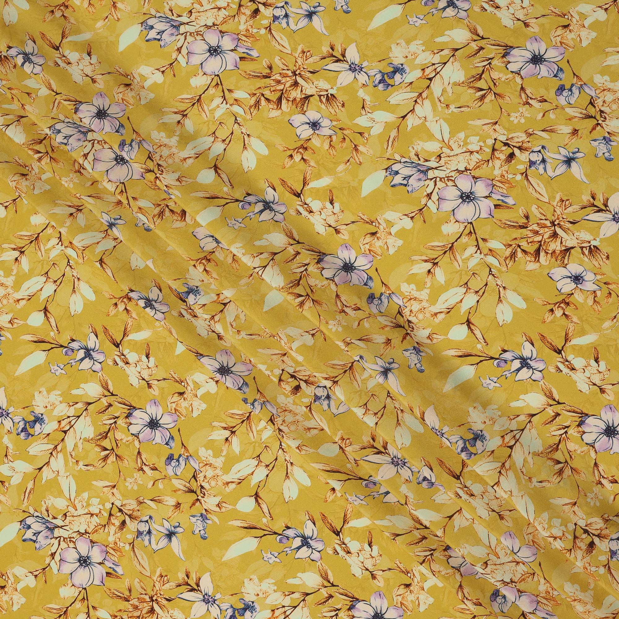 Mustard Yellow Multicolor Floral Printed Premium Pure Silk Crepe Fabric with Botanical Leaf and Bloom Design, 110 cms Width, Made in India-D26328