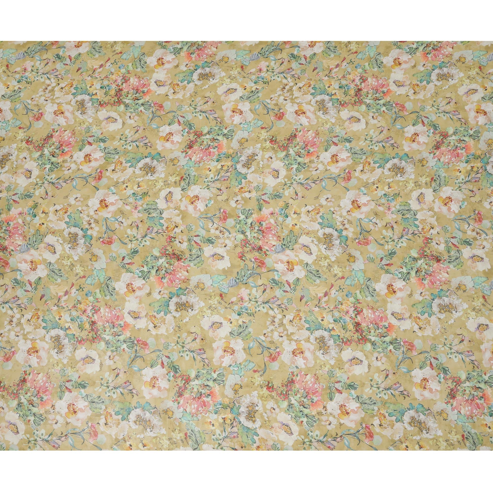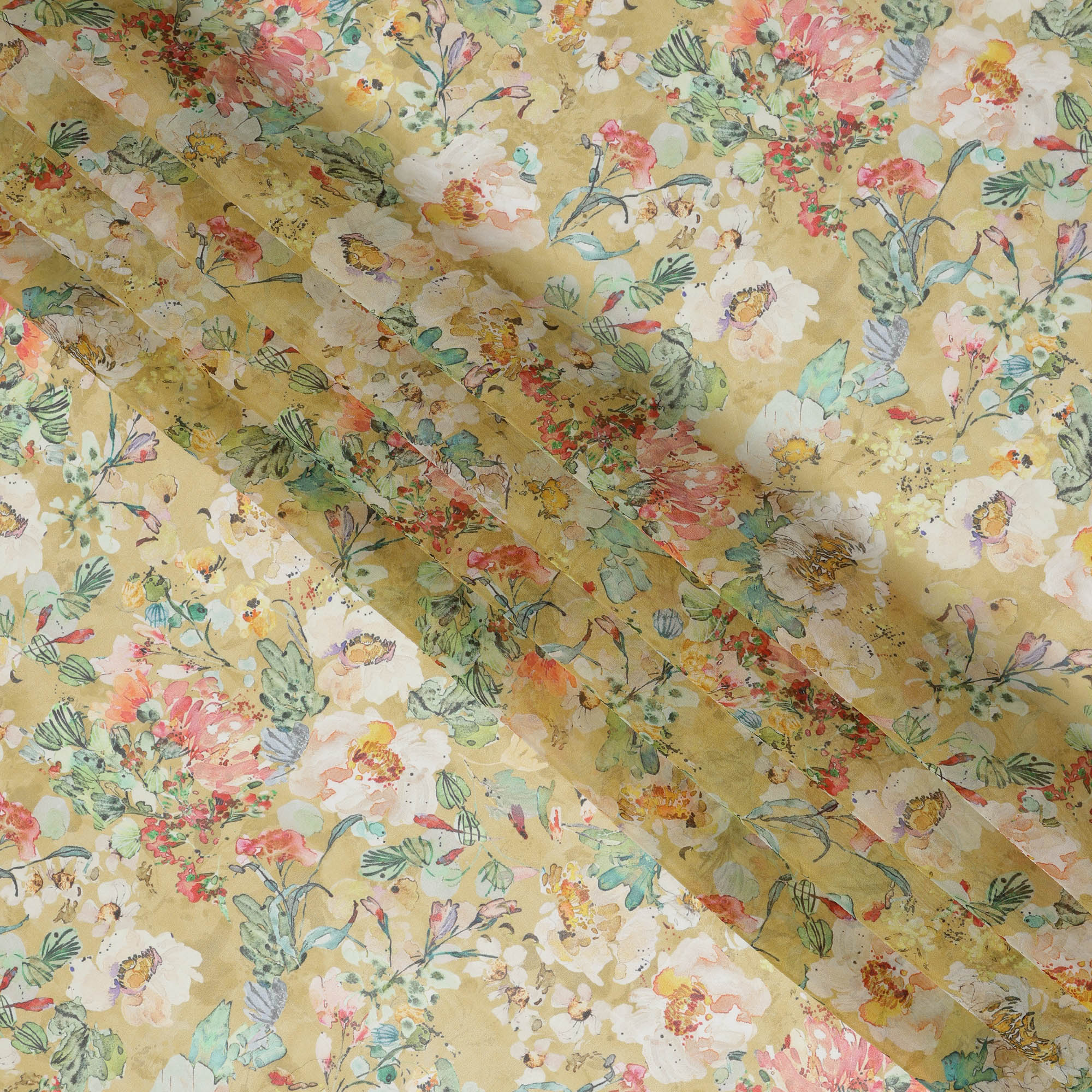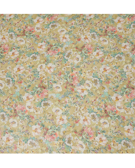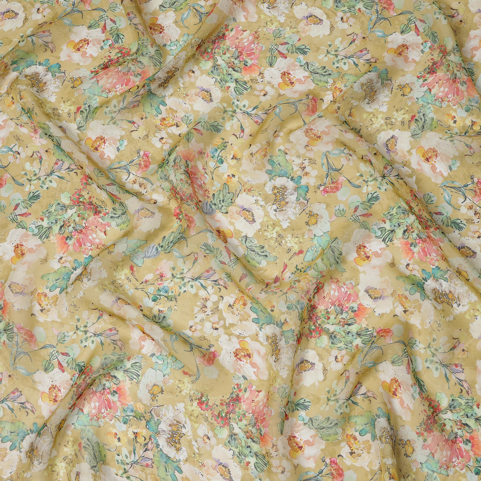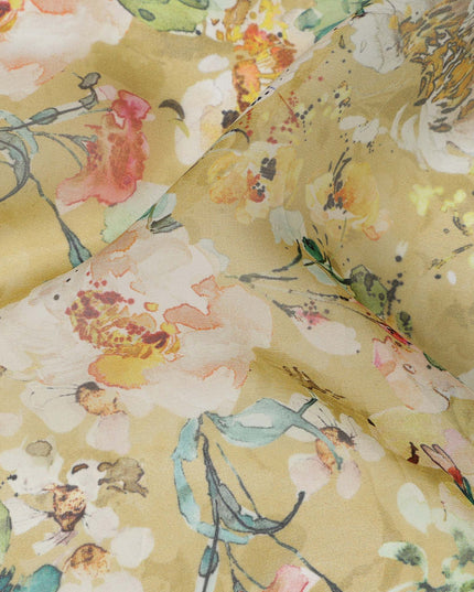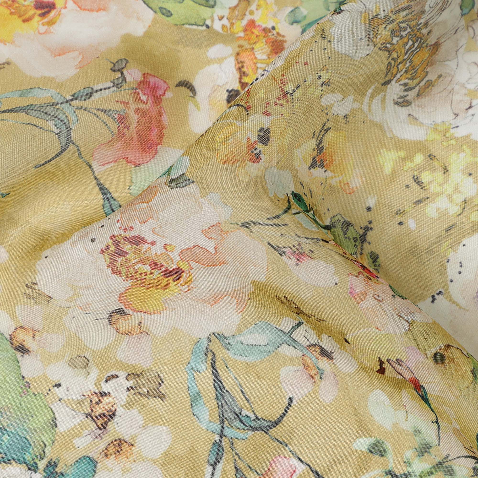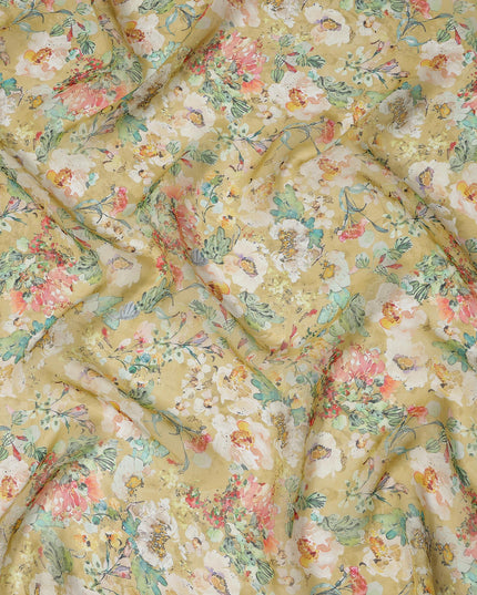 Mustard Yellow Multicolor Floral Printed Synthetic Organza Fabric with Artistic Bloom Motifs, Width 110 Cms, Made in India-D23322