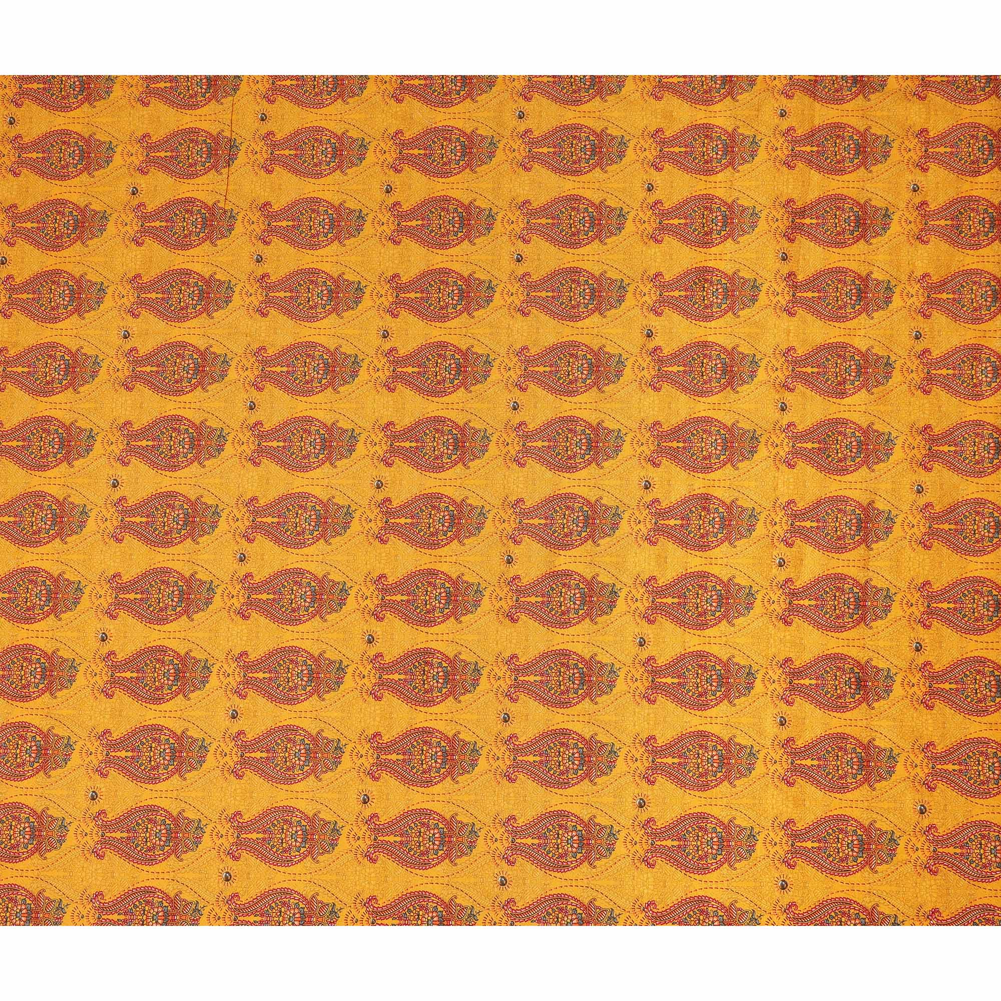 Mustard yellow base with intricate paisley buta print creates a rich traditional ethnic design.
