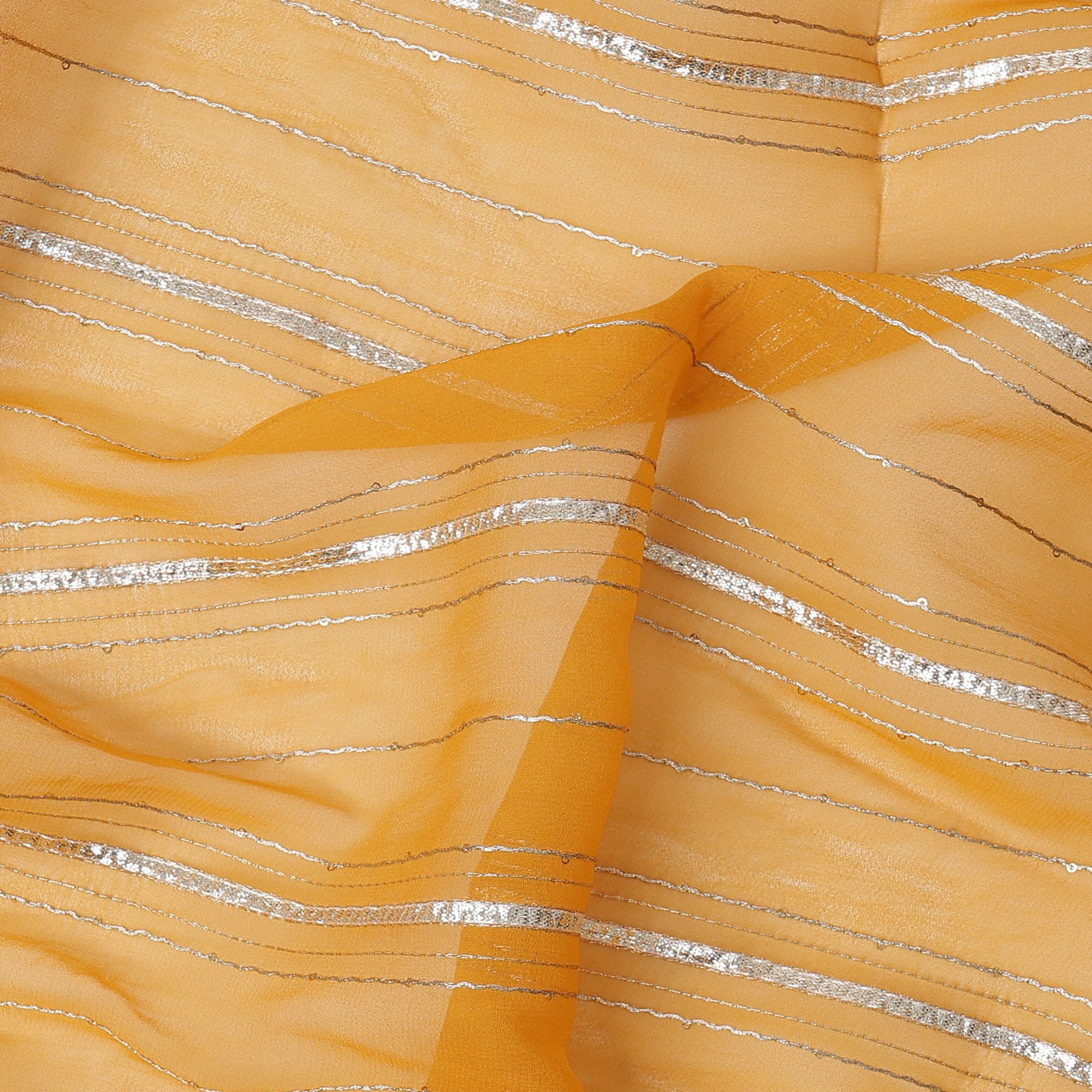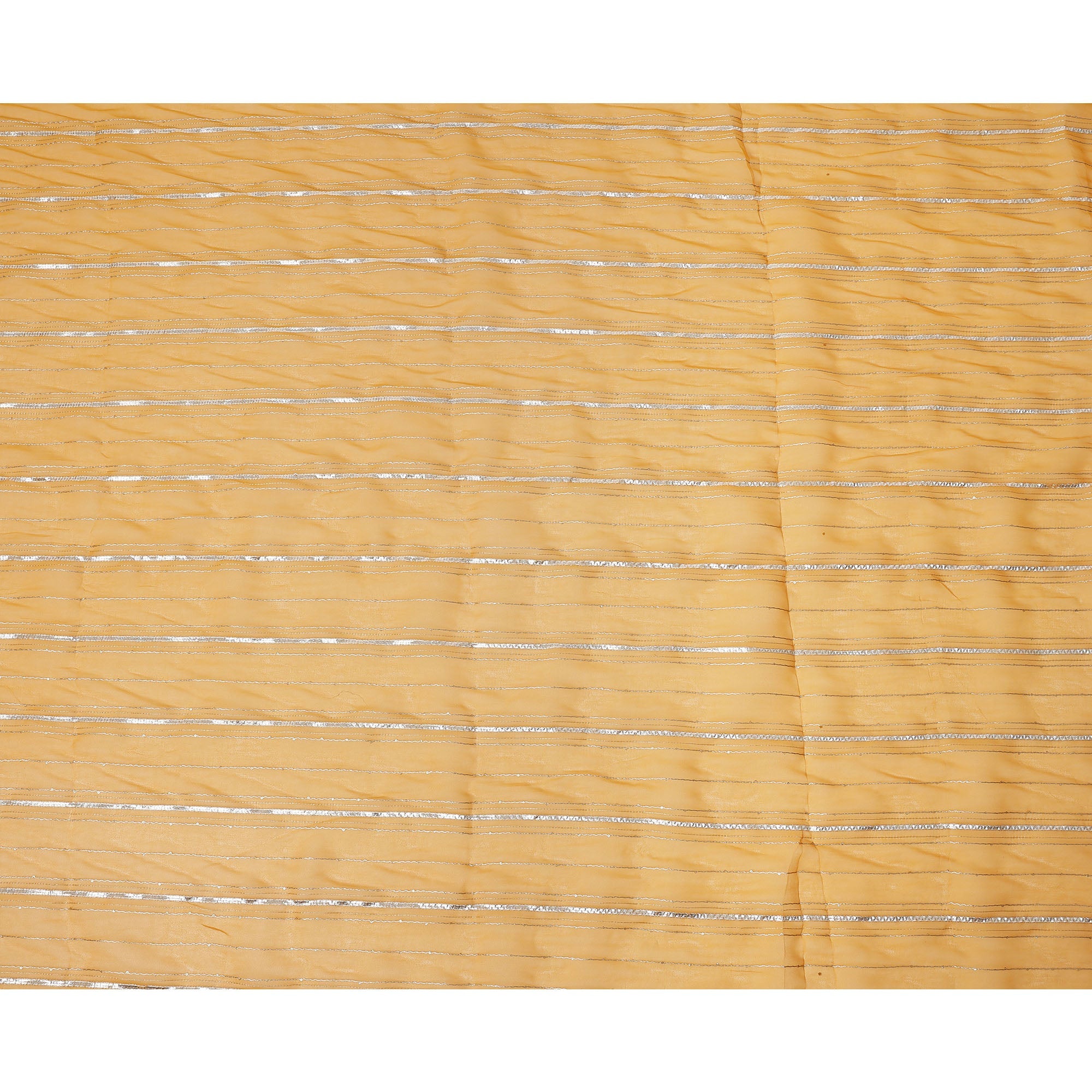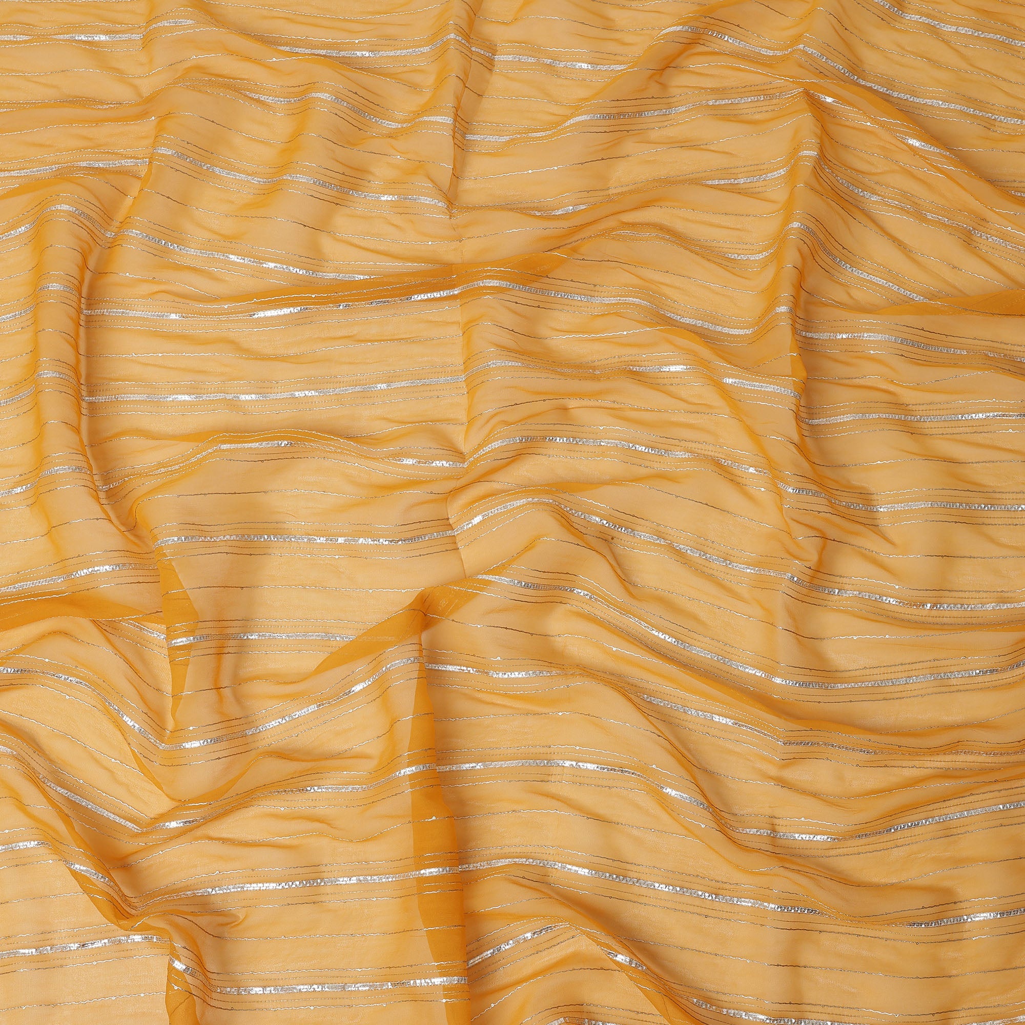 Mustard Yellow Silver Zari Striped Synthetic Georgette Chiffon Fabric, 110 Cms Width, Made in India-D26195
