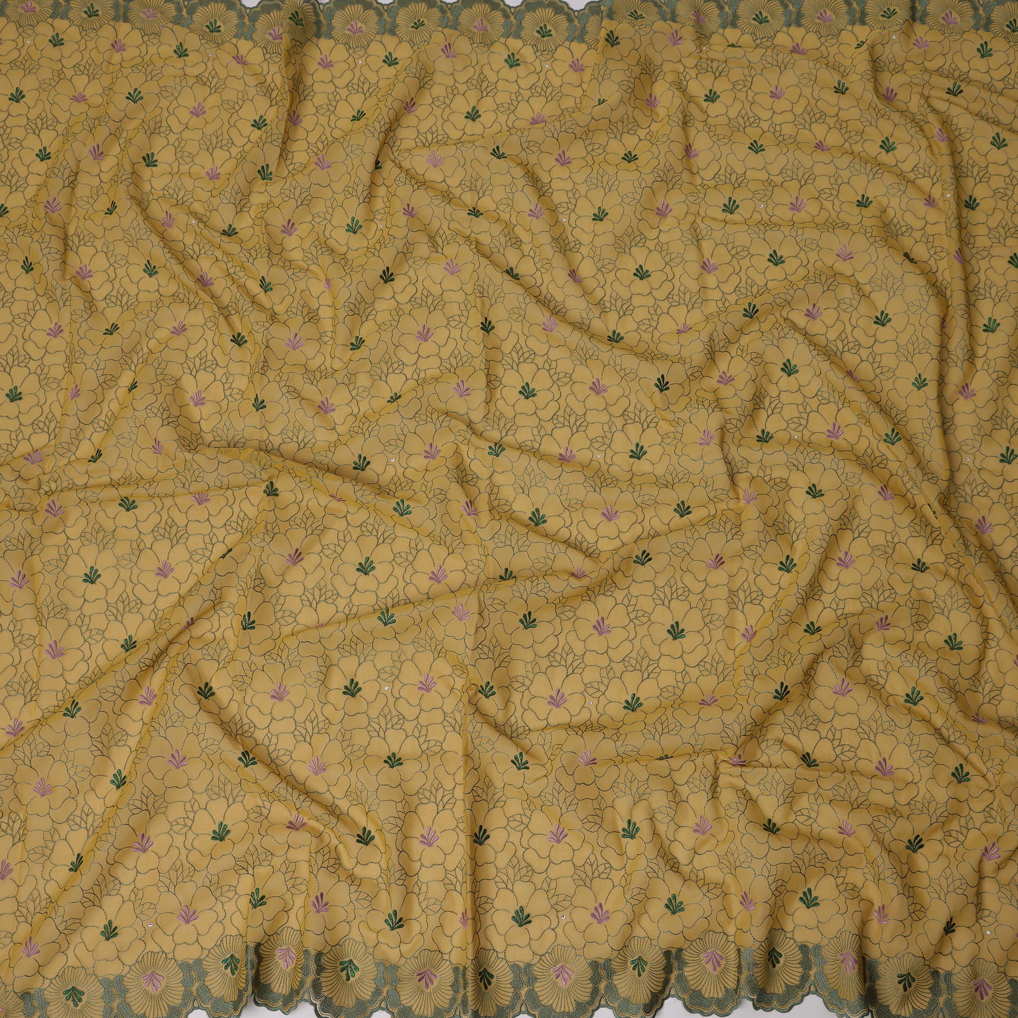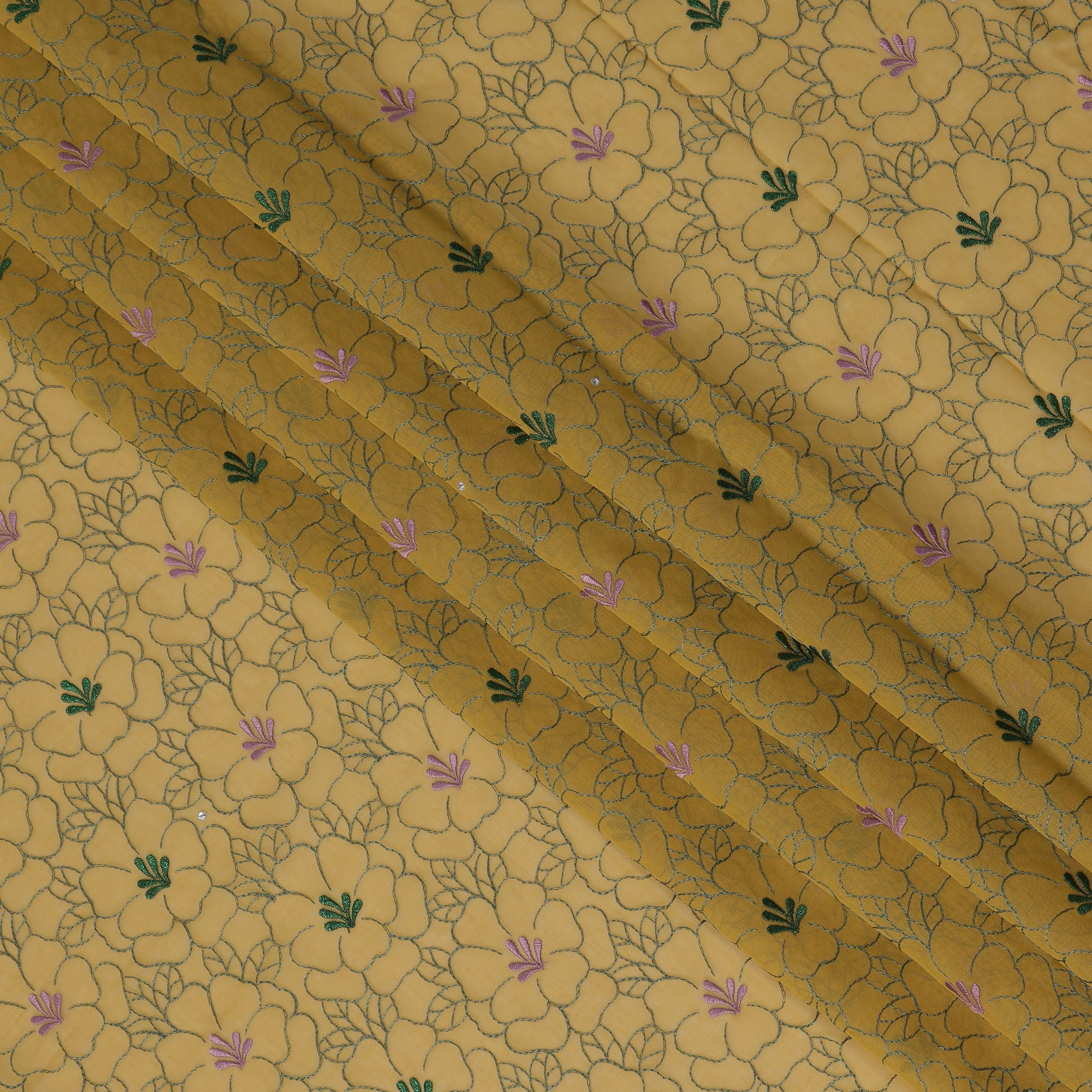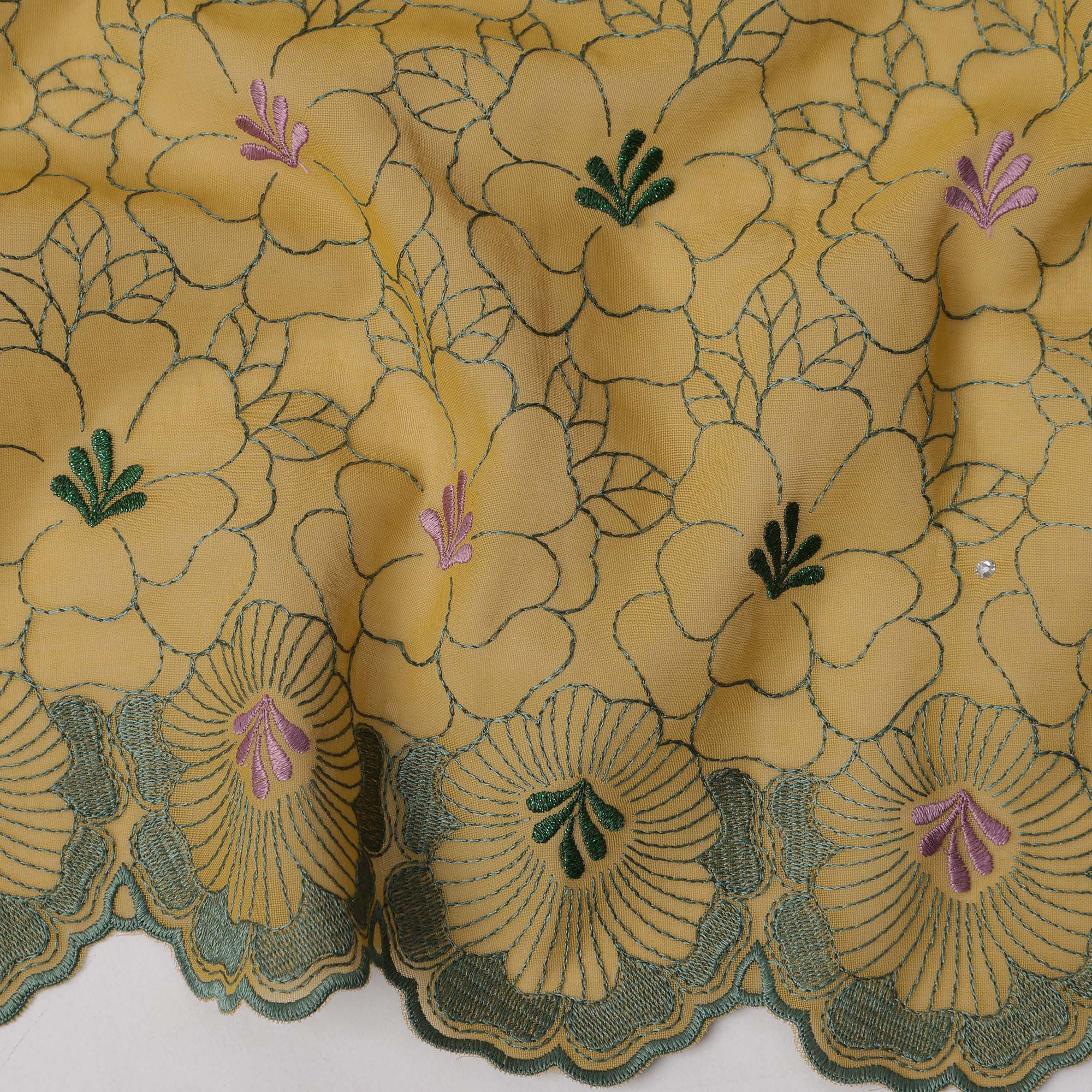 Mustard yellow cotton voile fabric embroidered with pink and green floral motifs and accented with stone work.