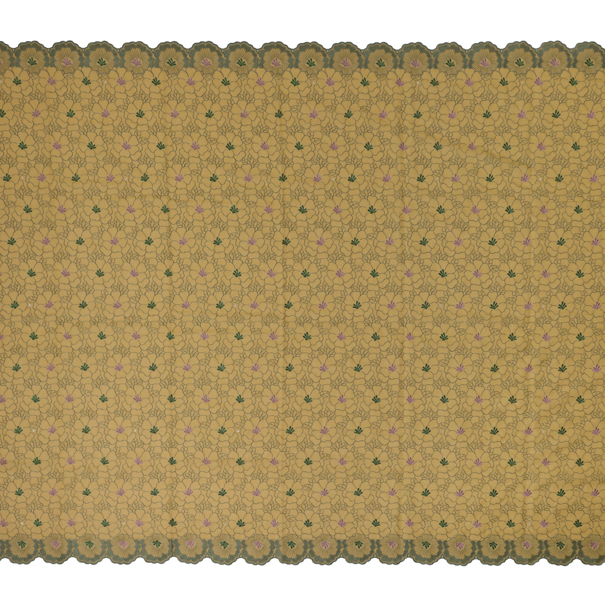 This mustard yellow traditional Sudanese thobe is crafted from premium pure cotton voile fabric and features delicate floral embroidery in soft pink and green with shimmering stone work that adds a refined sparkle throughout. The fabric showcases finely detailed floral outlines with a beautifully scalloped border that enhances the ethnic elegance of the piece. Woven in Switzerland, the cotton voile offers superior breathability, lightness, and comfort, ideal for extended wear in warm climates or ceremonial occasions. With a length of 4.5 meters and a width of 140 cms, it is perfectly suited for creating a full-length, gracefully draped thobe that blends cultural richness with sophisticated craftsmanship. Whether worn at festive events, weddings, or religious celebrations, this fabric brings a balance of tradition, charm, and high-quality finesse. Shop online to experience the perfect union of Swiss quality and Sudanese heritage.
