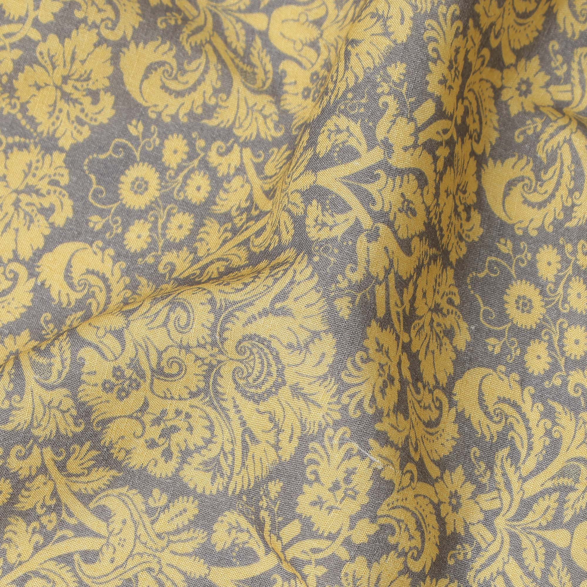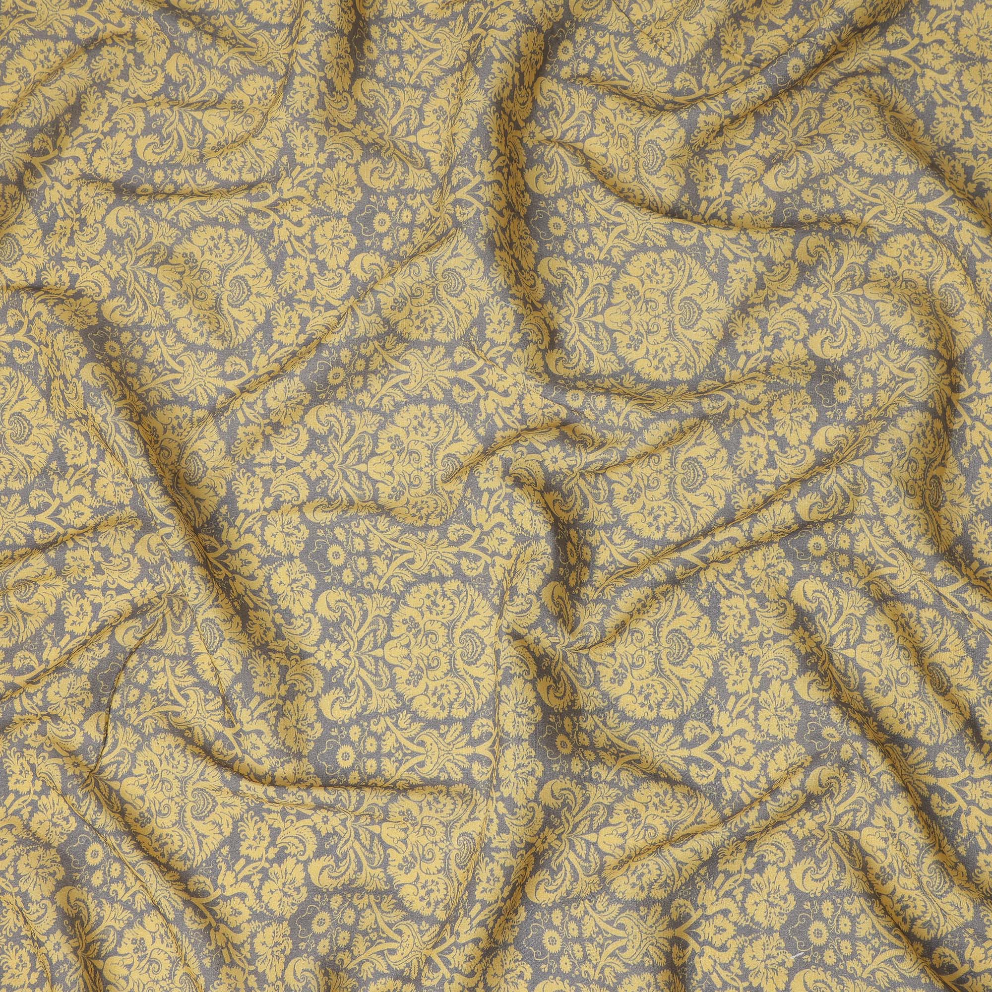 This mustard yellow vintage floral damask printed cotton linen fabric blends timeless elegance with the natural comfort of a breathable cotton linen composition, making it an excellent choice for refined garments and creative sewing projects. Crafted from a balanced mix of cotton and linen fibers, the fabric features a soft feel with a subtle natural texture that enhances durability while maintaining a comfortable and airy drape. The warm mustard yellow base is beautifully decorated with intricate vintage damask floral motifs arranged in an ornamental repeating pattern, creating a sophisticated and classic textile appearance. With a width of 110 cms, the fabric offers ample material for designing dresses, tops, skirts, tunics, shirts, and stylish handcrafted accessories. Its breathable structure and comfortable weight make it suitable for everyday wear while the elegant ornamental floral design adds a timeless charm to fashion pieces, sewing projects, and creative apparel designs.