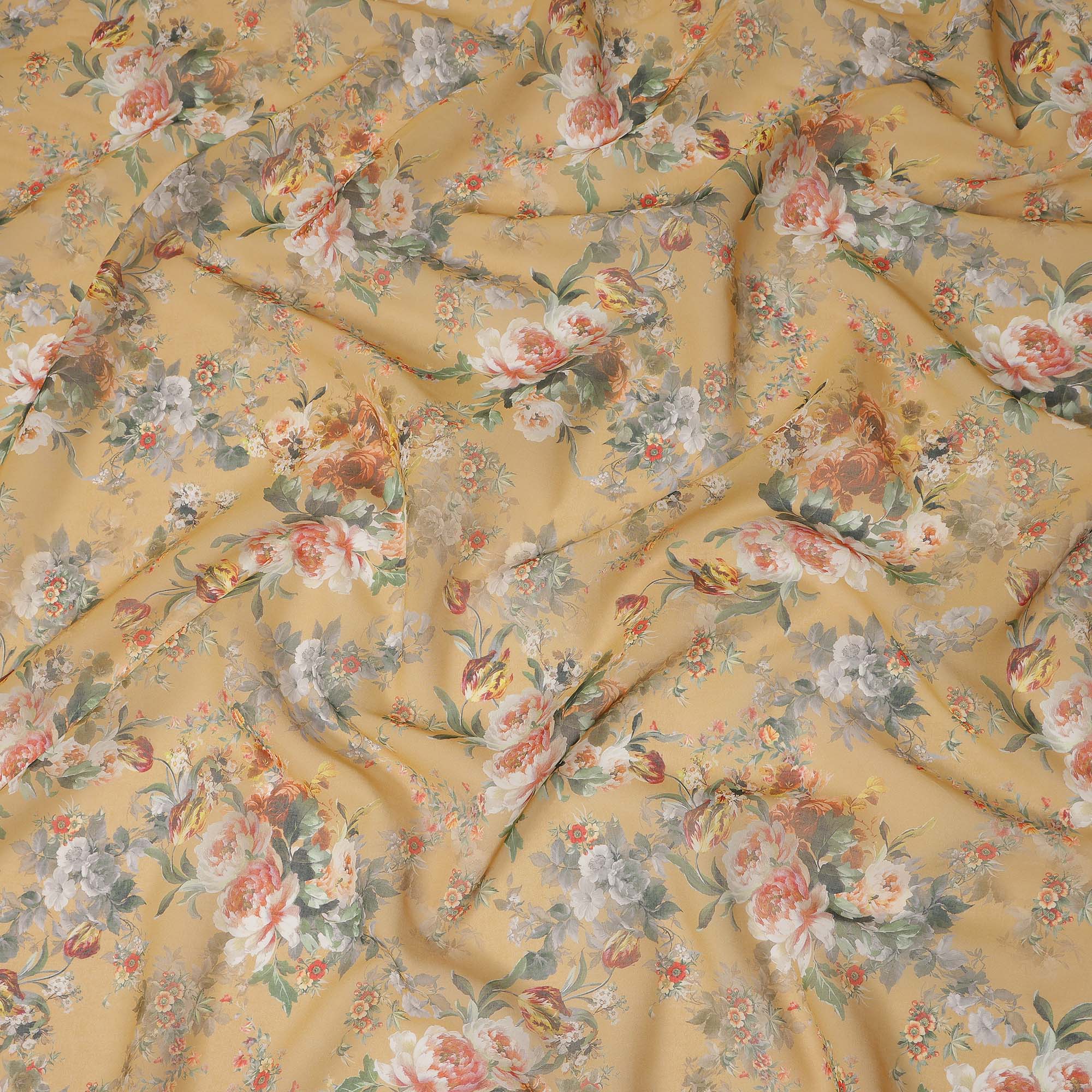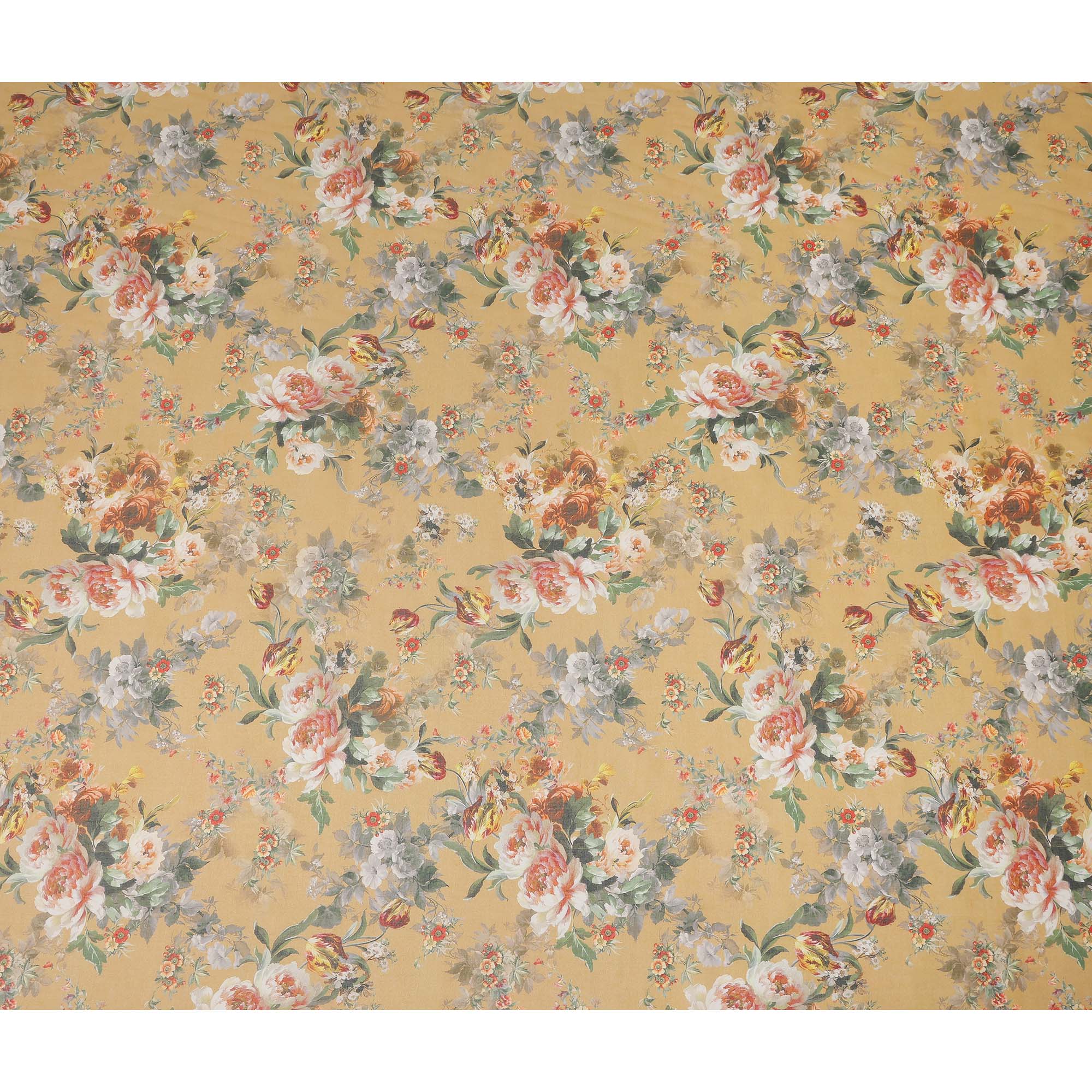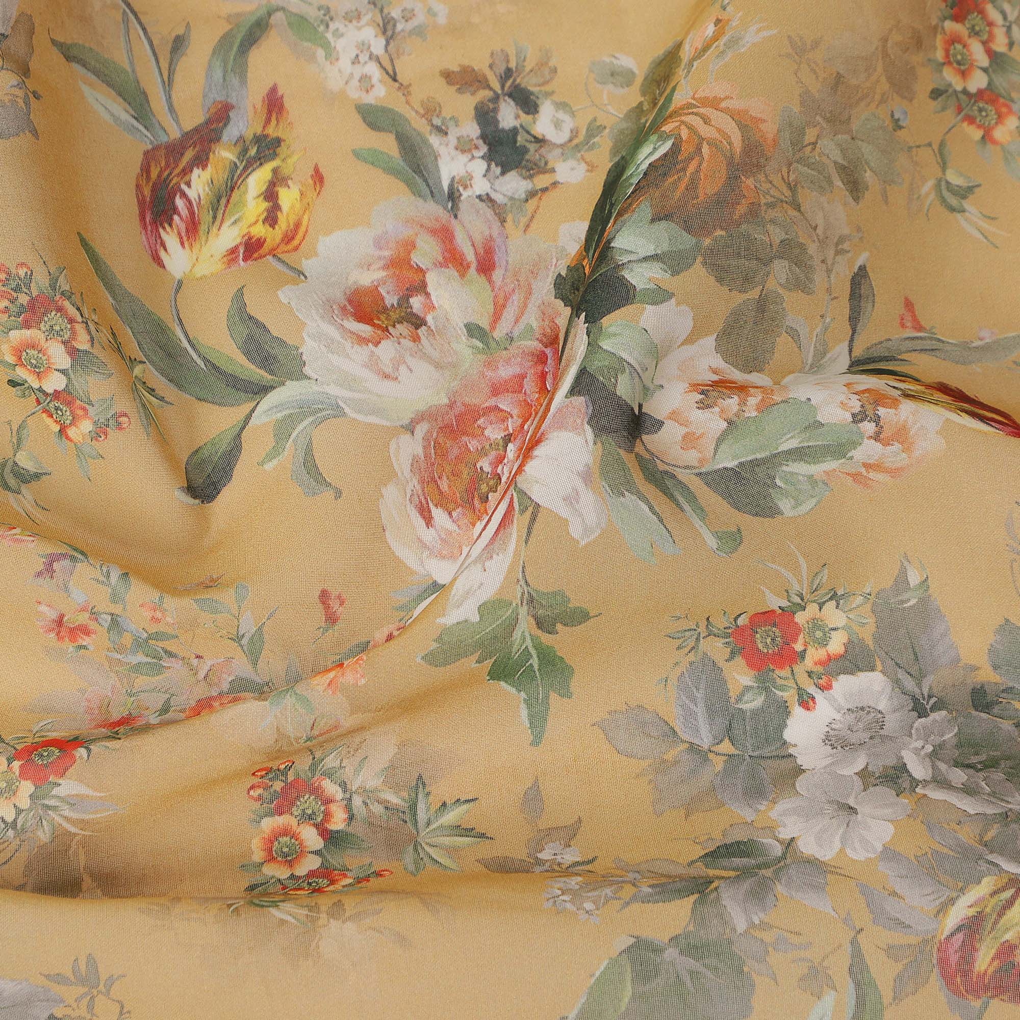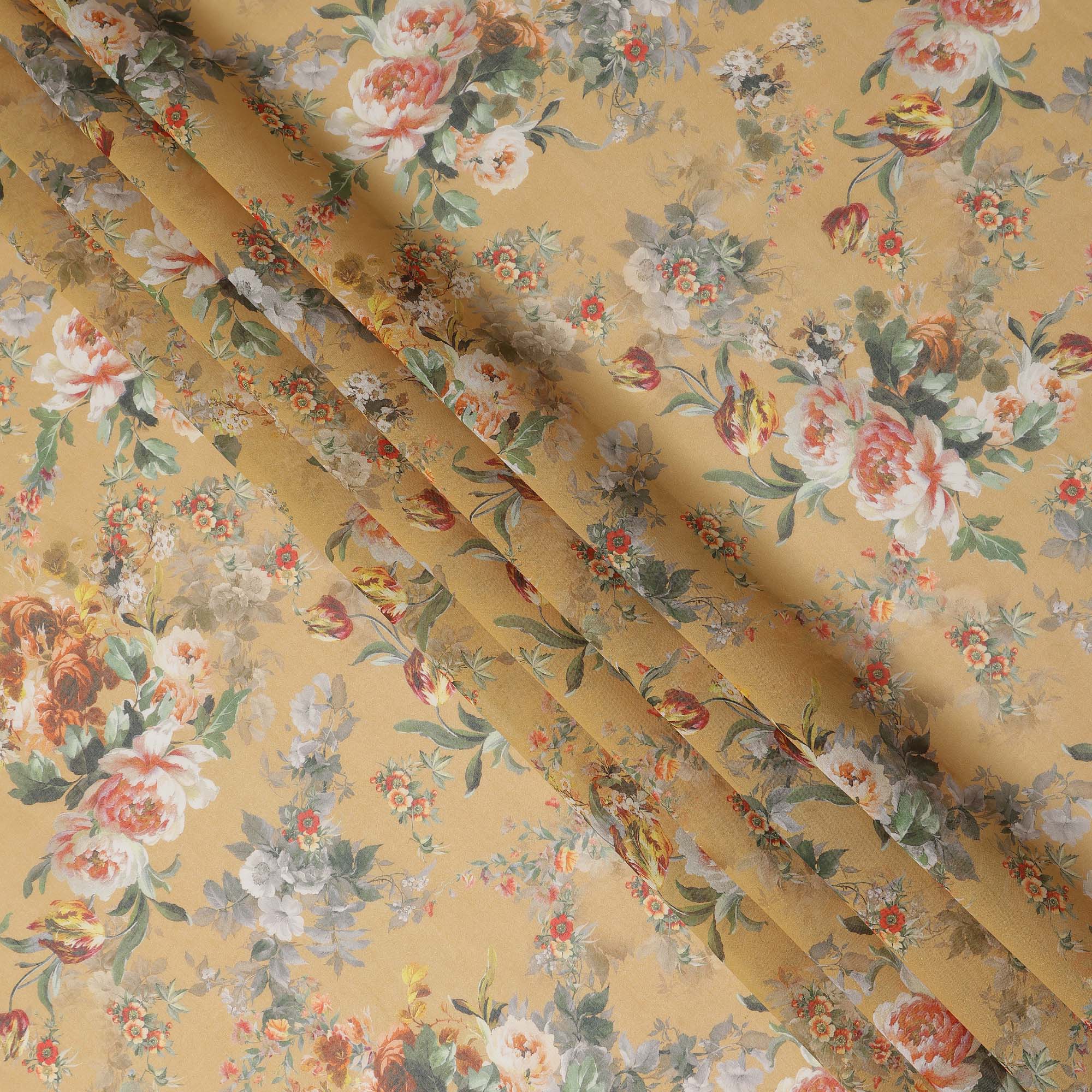 This mustard yellow vintage floral rose printed cotton voile fabric features an elegant arrangement of blooming roses and delicate botanical motifs in soft shades of peach, ivory, sage green, and muted coral, beautifully set against a warm mustard base. Crafted from lightweight and breathable cotton voile, it offers a smooth, airy texture that feels gentle on the skin and drapes gracefully for comfortable wear. With a generous 150 cms width, it is perfect for dresses, blouses, tunics, scarves, and charming home décor accents. Ideal for designers, boutique creators, and DIY sewing enthusiasts, this fabric combines timeless floral beauty with everyday comfort and versatile functionality.