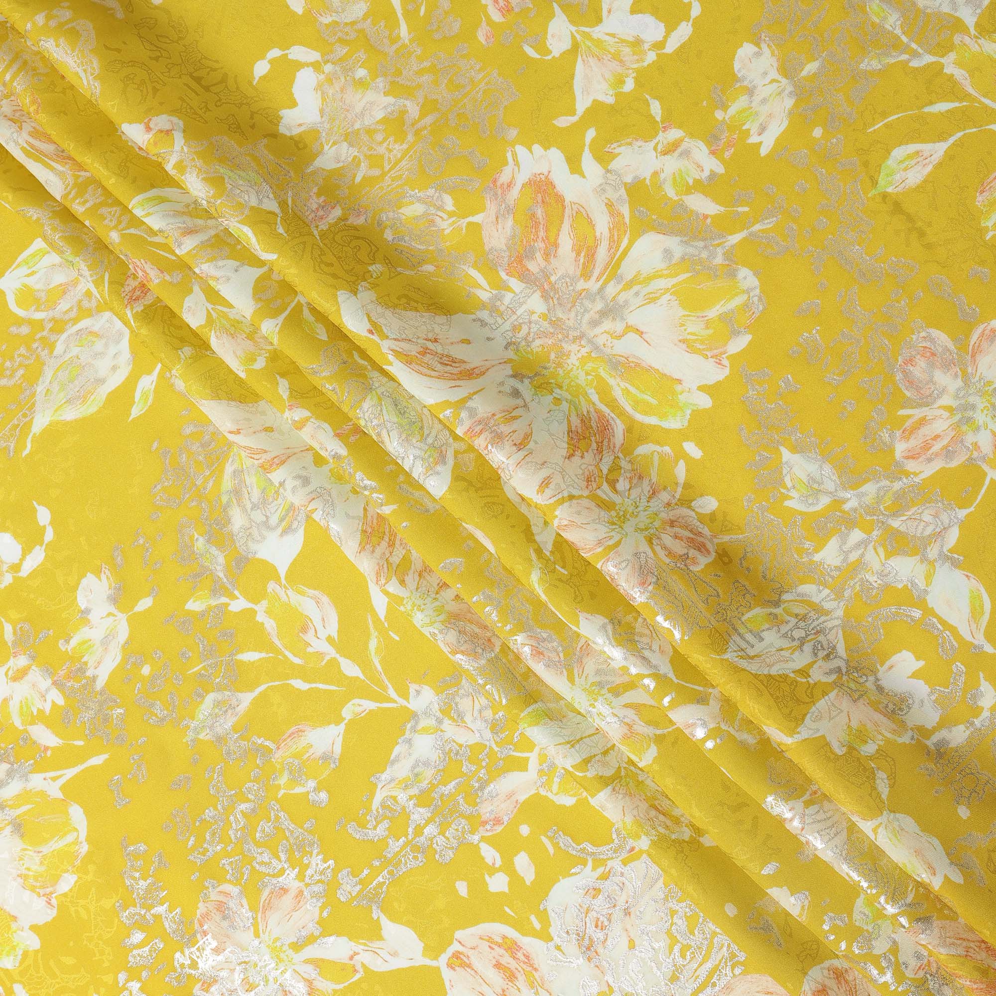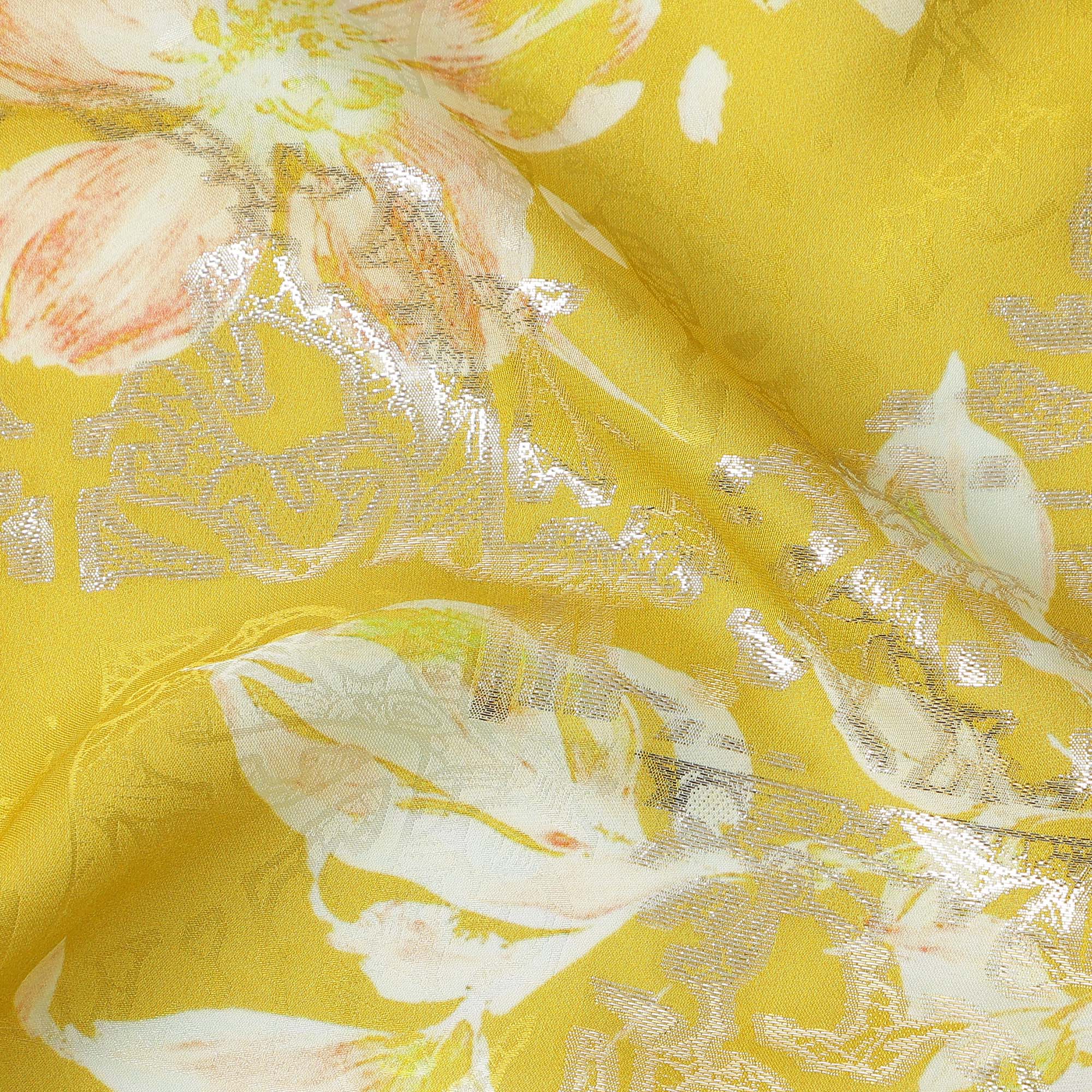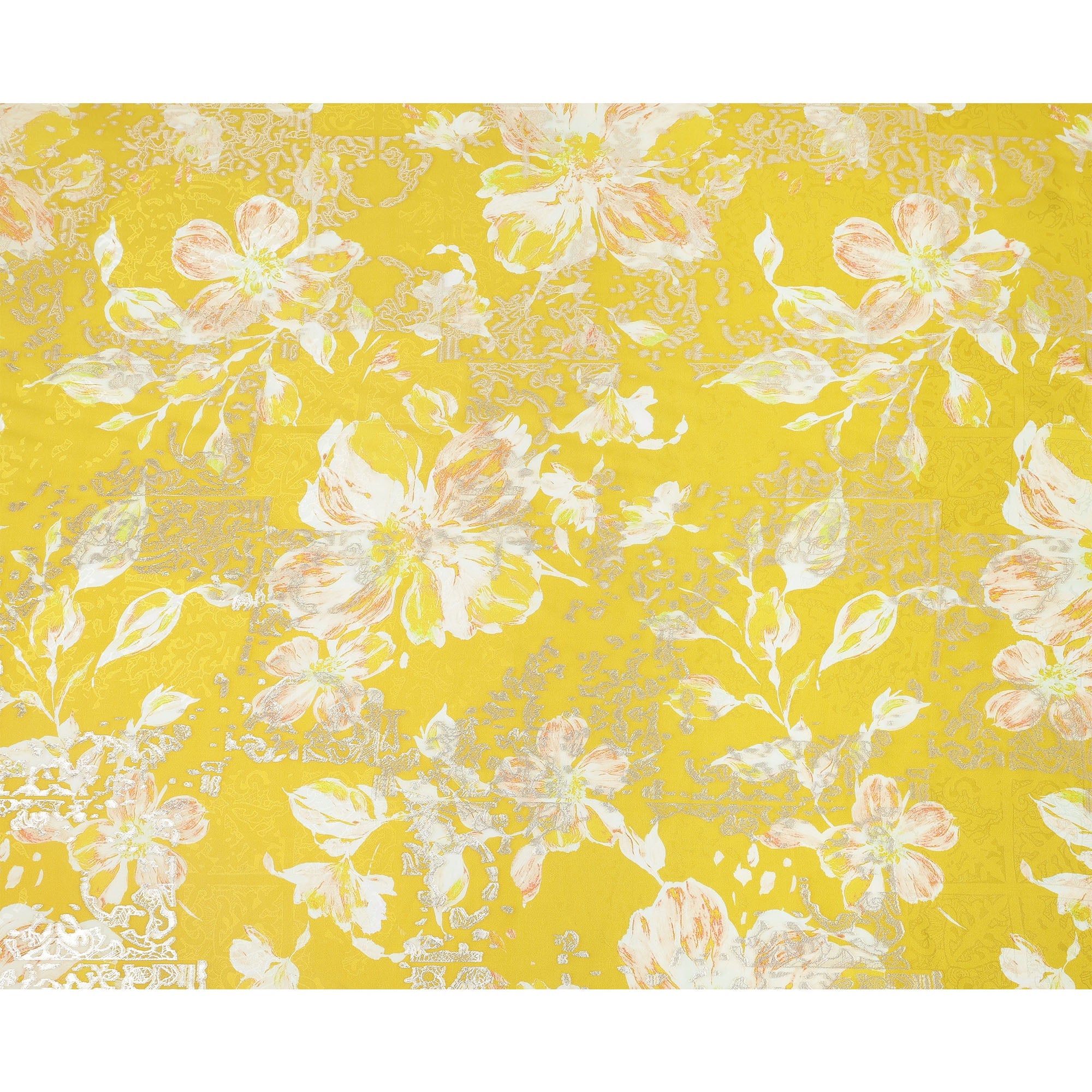 Mustard Yellow with White and Peach Floral Print Pure Silk Satin Fabric, 140 Cms Width, Made in South Korea-D25996