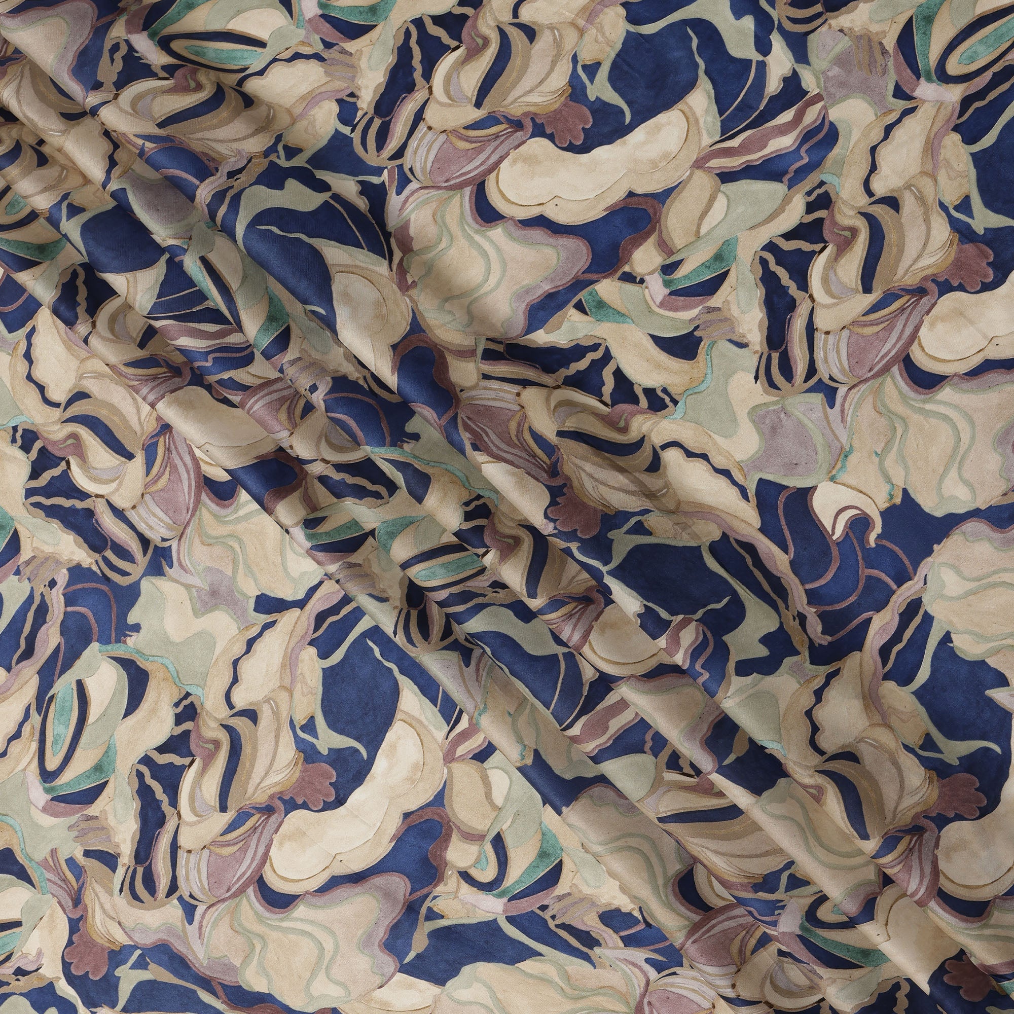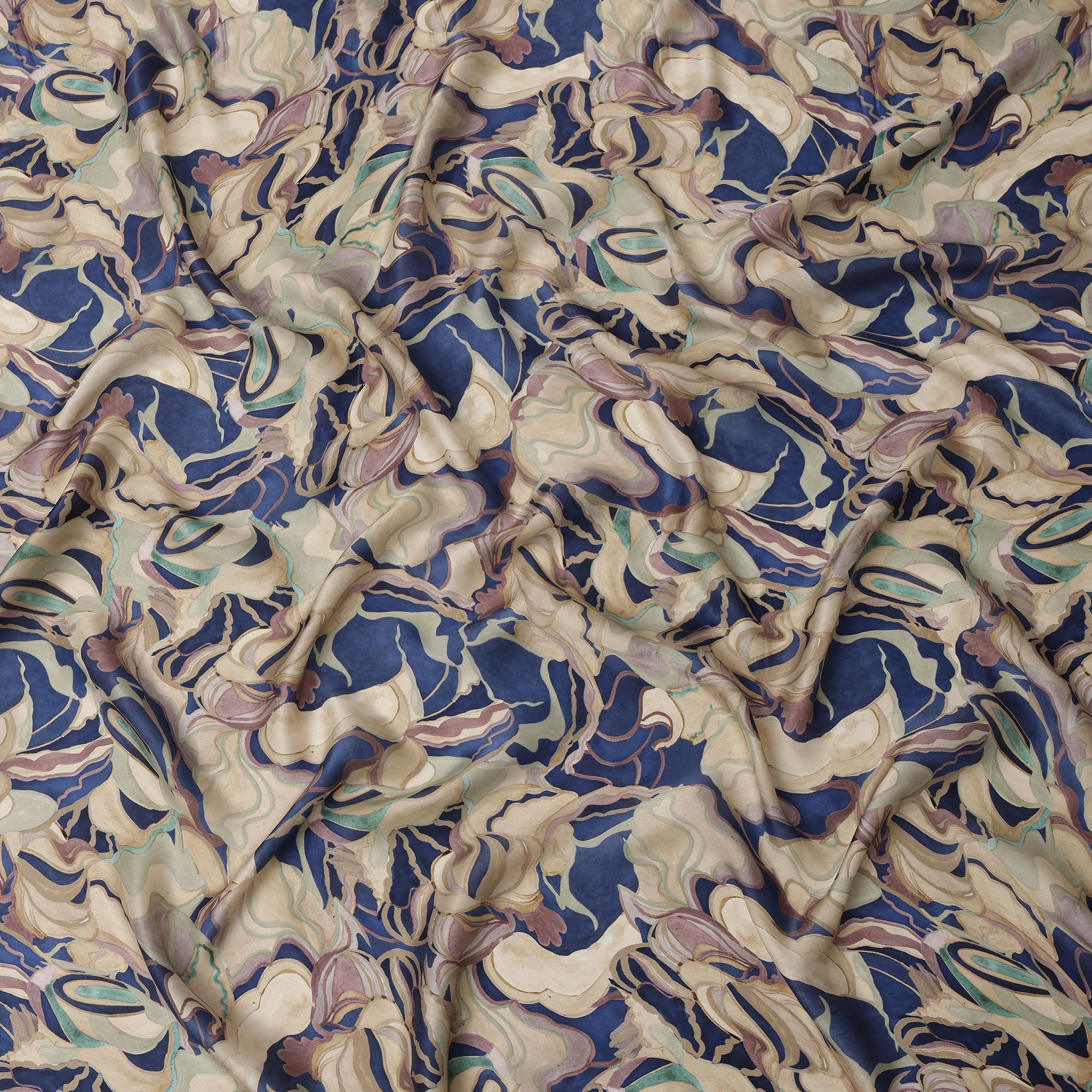 Premium viscose modal satin fabric with navy blue base and beige marble abstract print
