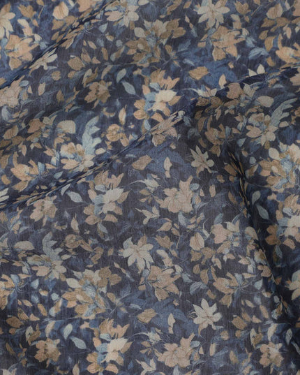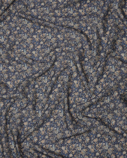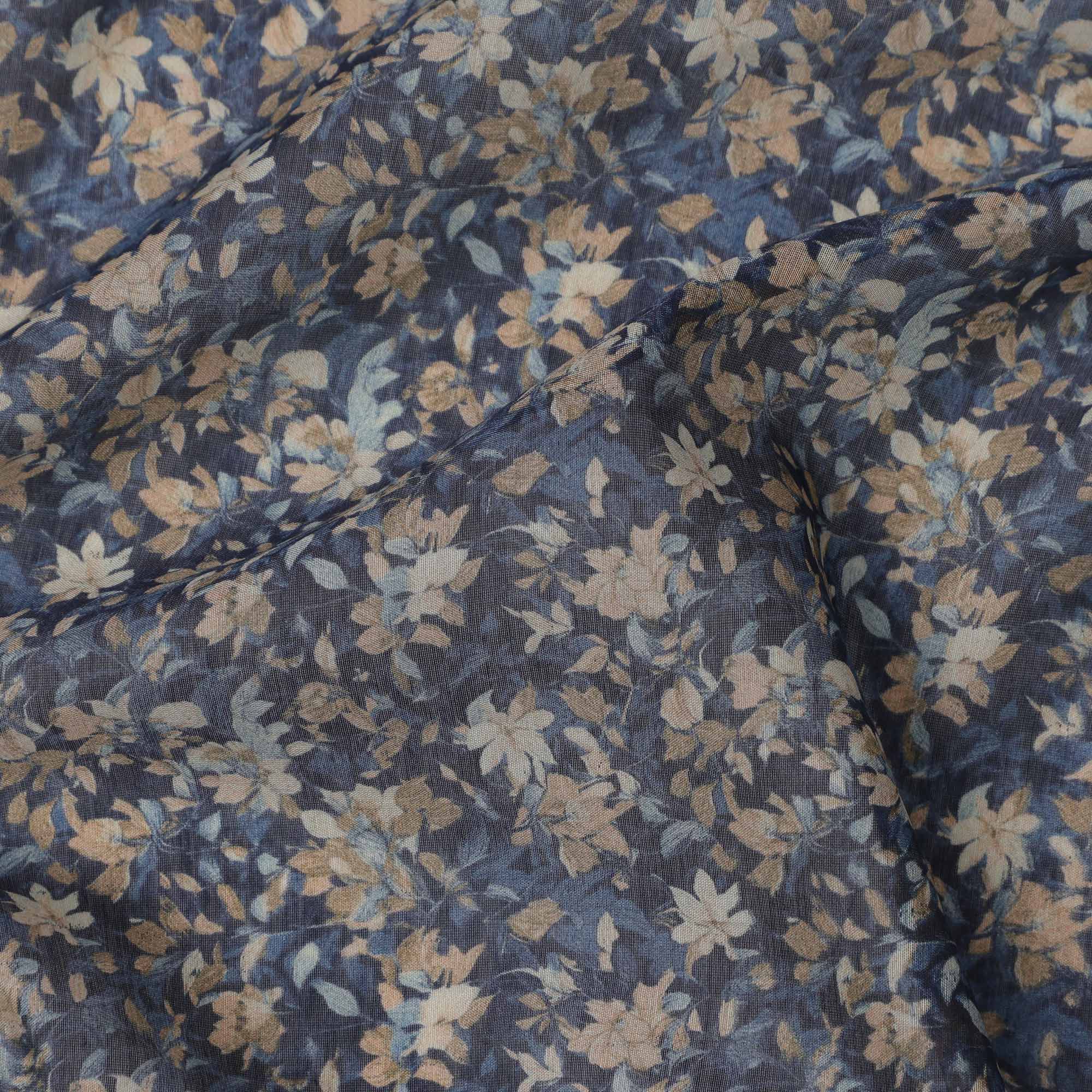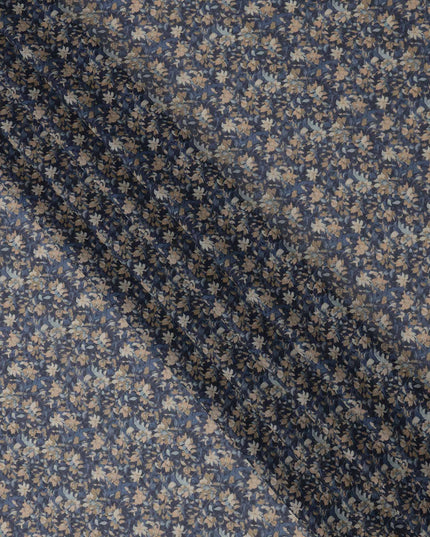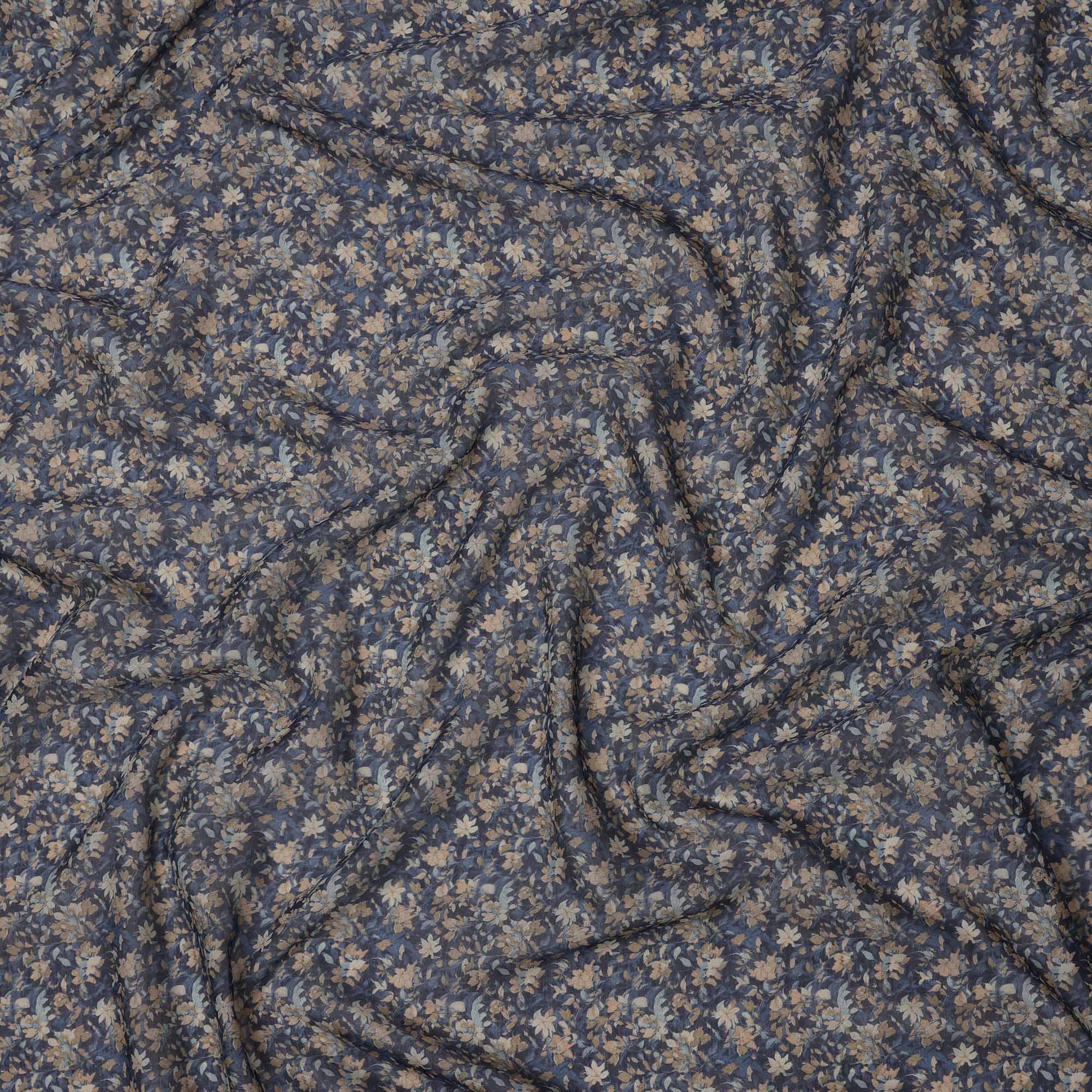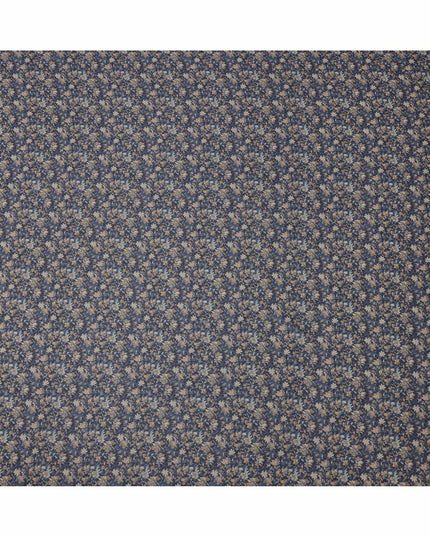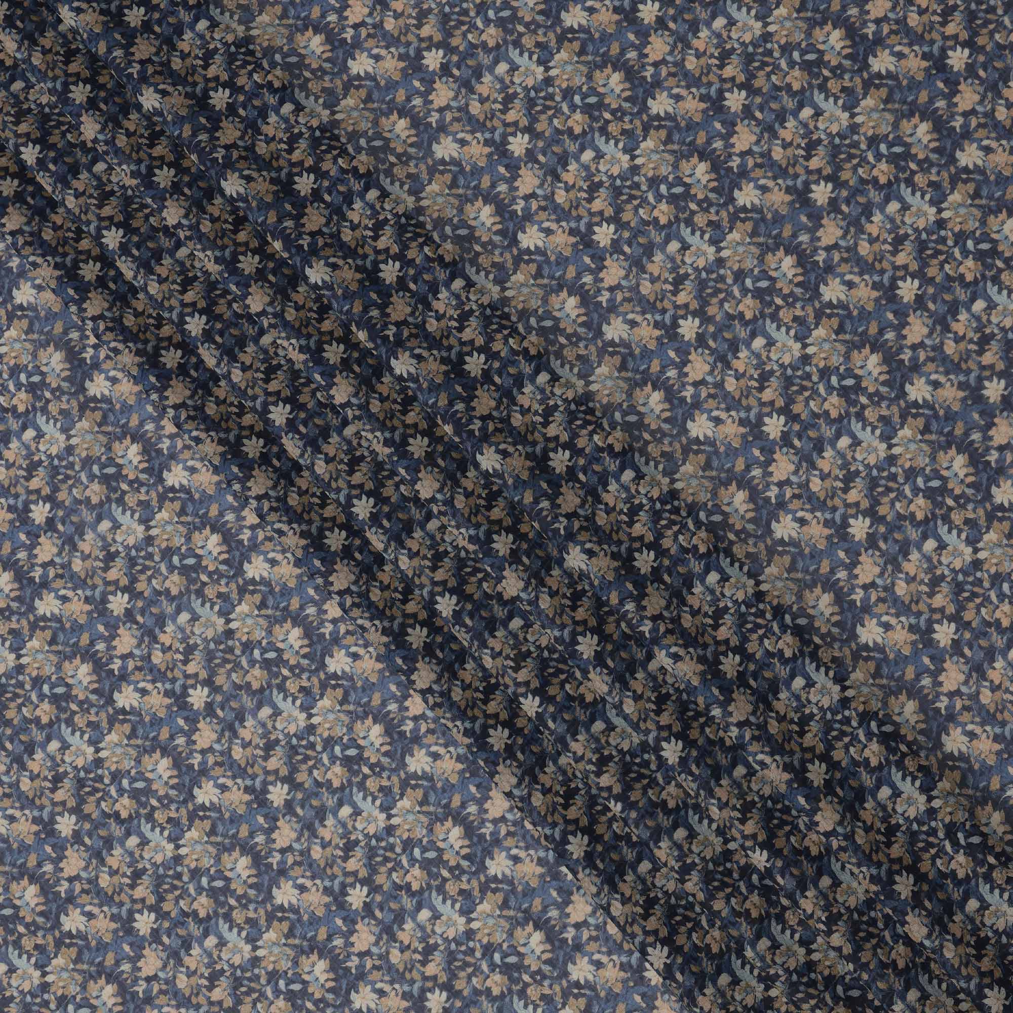 This navy blue base cotton voile fabric is intricately adorned with a micro floral print in tones of beige, muted... Read more Read more
