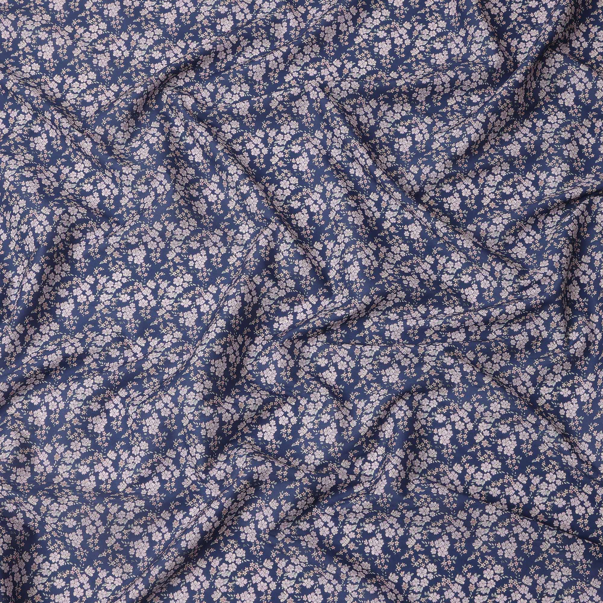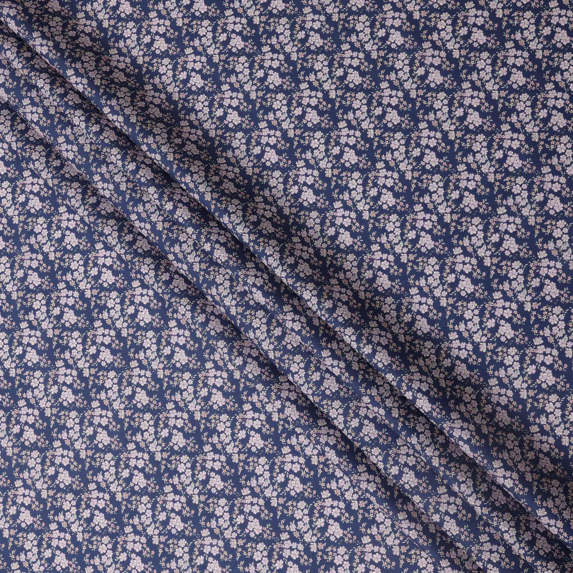 Navy Blue Base with White and Pink Floral Print Pure Cotton Lawn Fabric, 140 Cms Width, Made in India-D26011