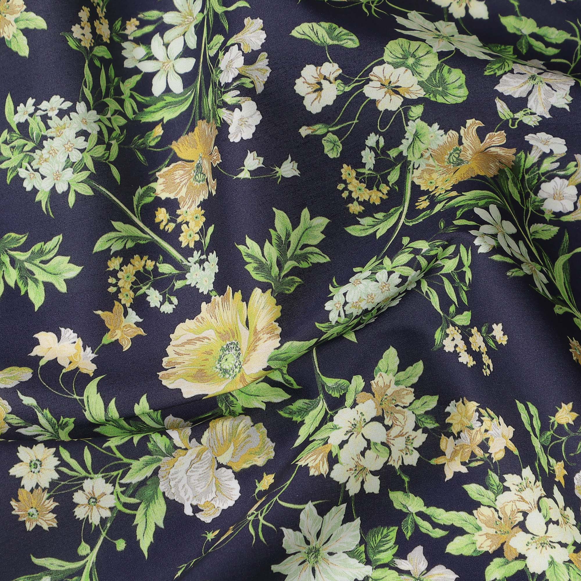 Premium Navy Blue Base with Yellow and White Floral Print Pure Cotton Lawn Fabric with fine weave