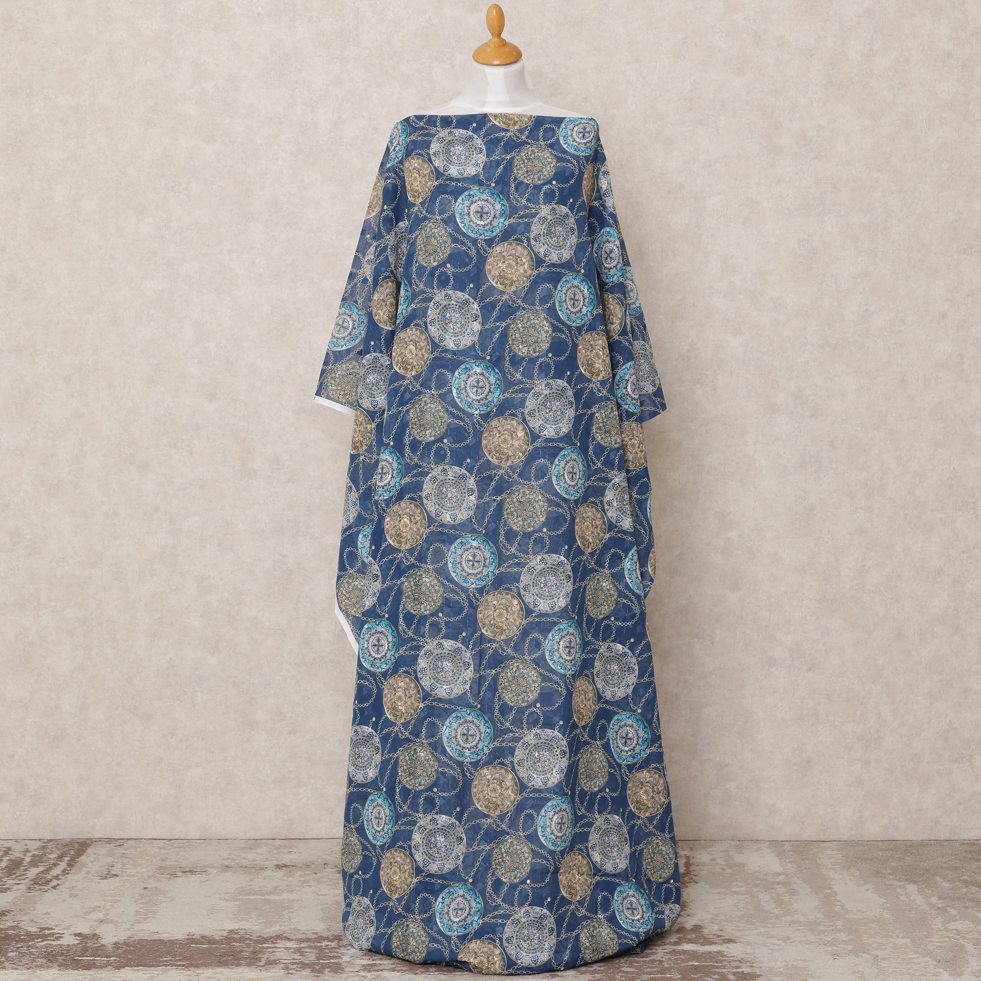 Navy blue base with intricate multicolor embroidered circular motifs