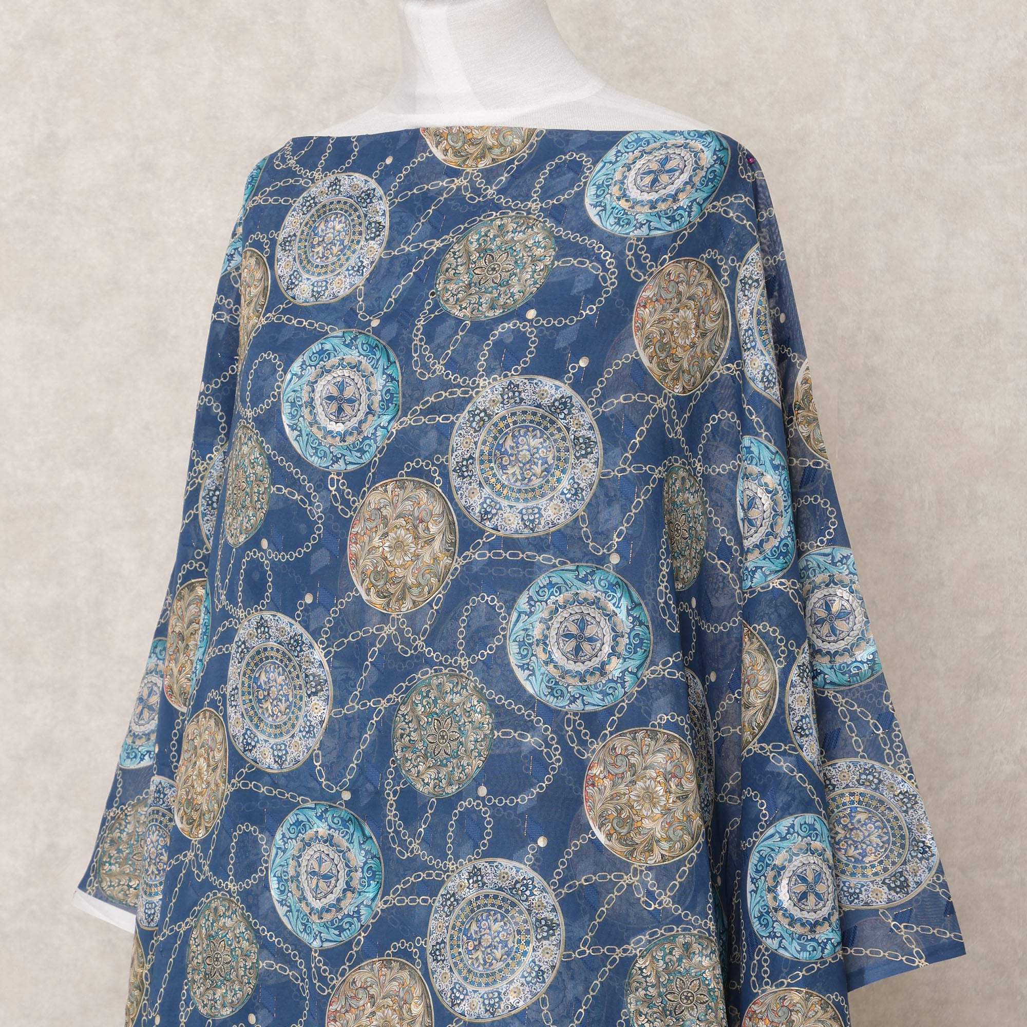 Step into sophistication with this navy blue Somali cotton voile embroidery fabric, featuring intricately detailed circular motifs in shades of beige, ivory, and turquoise that bring together traditional charm and modern refinement. Expertly crafted in India, this 3.5-meter fabric is made from lightweight, breathable cotton voile known for its airy texture and smooth drape, ideal for creating modest yet stylish garments like abayas, hijabs, tunics, or kaftans. The embroidery adds texture and richness to the deep blue base, making it an excellent choice for festive or formal ethnic wear. With a generous width of 140 cm, this fabric allows for versatile tailoring and creative expression in design. Whether for daily elegance or special occasions, it offers superior comfort, durability, and visual appeal. Buy online now to infuse your wardrobe with embroidered heritage and fine Indian craftsmanship. Shop online for fabric that’s as graceful as it is enduring.