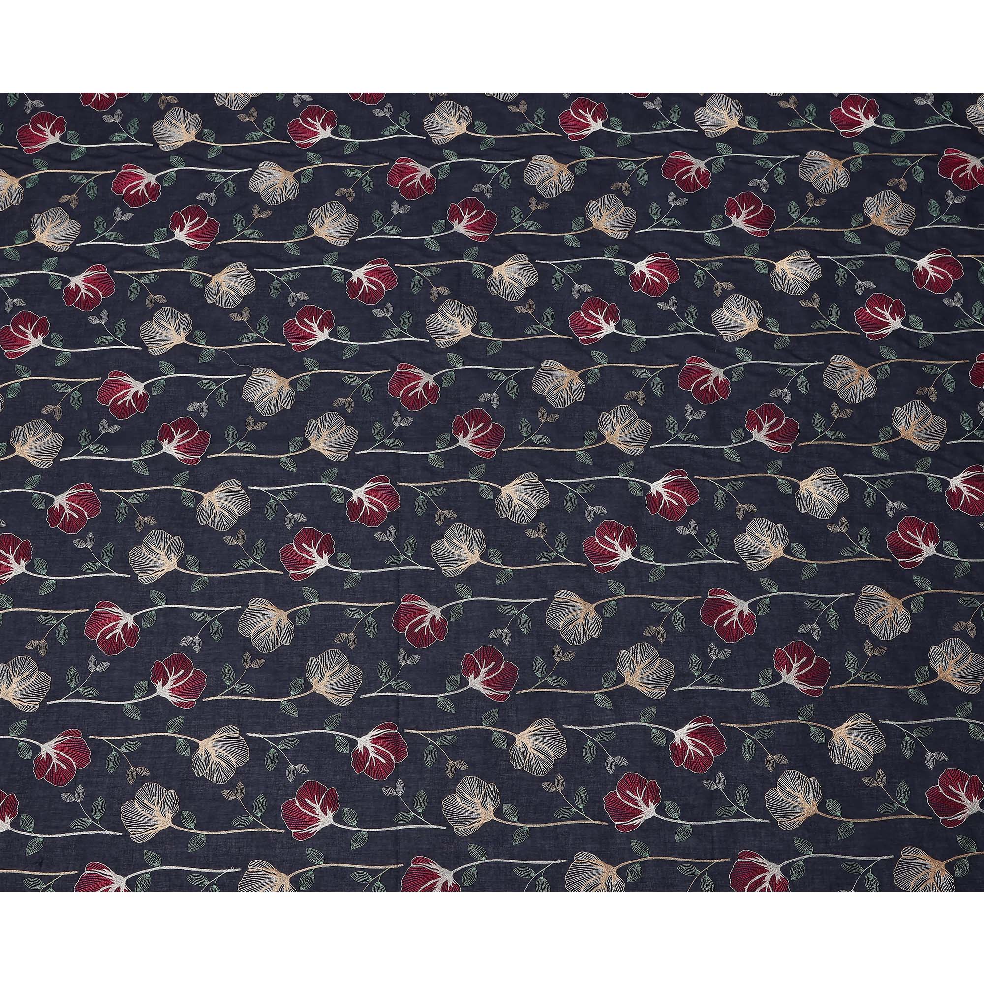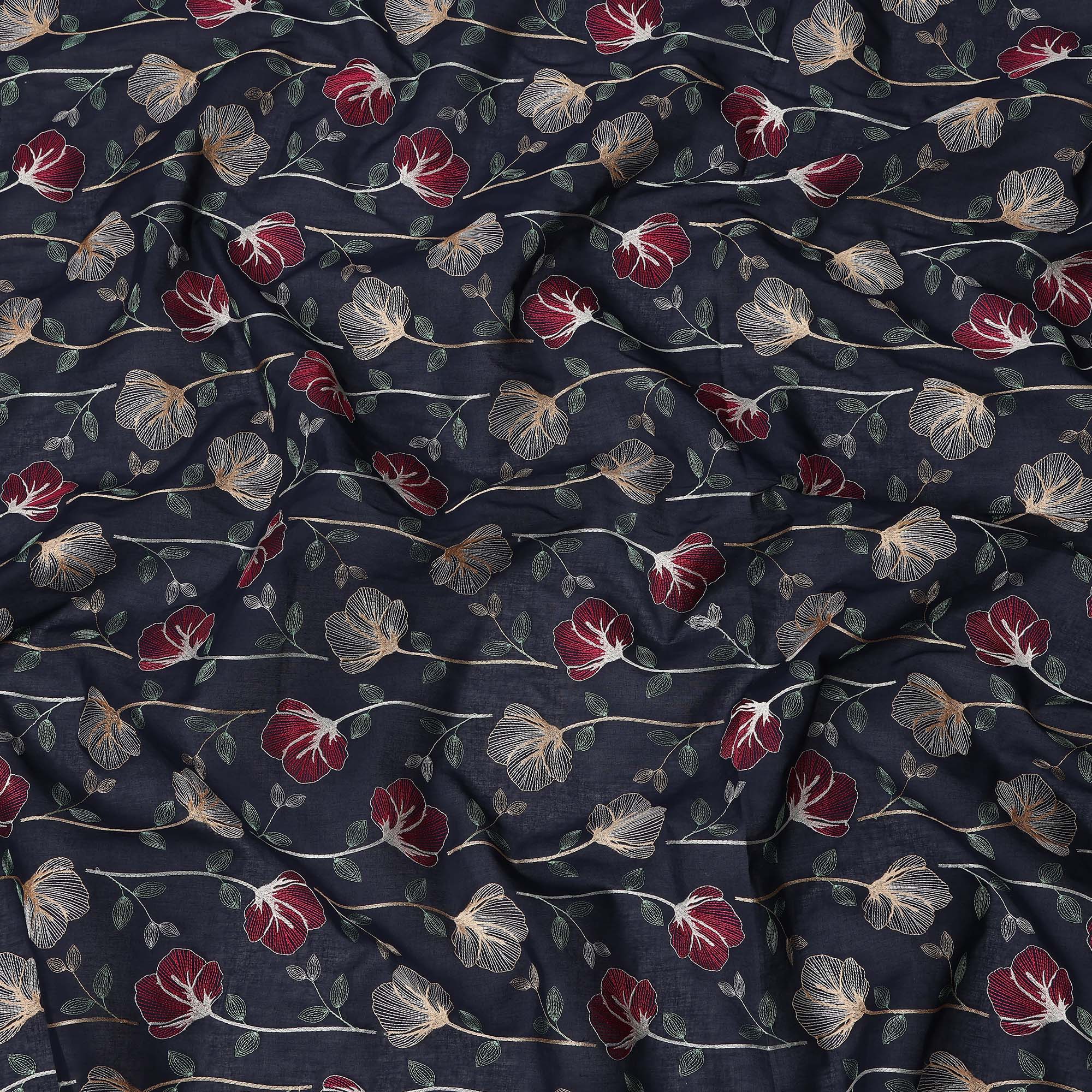Navy Blue Floral Embroidered Cotton Voile Fabric with Multicolor Threadwork, 110 Cms Width, India-D25322