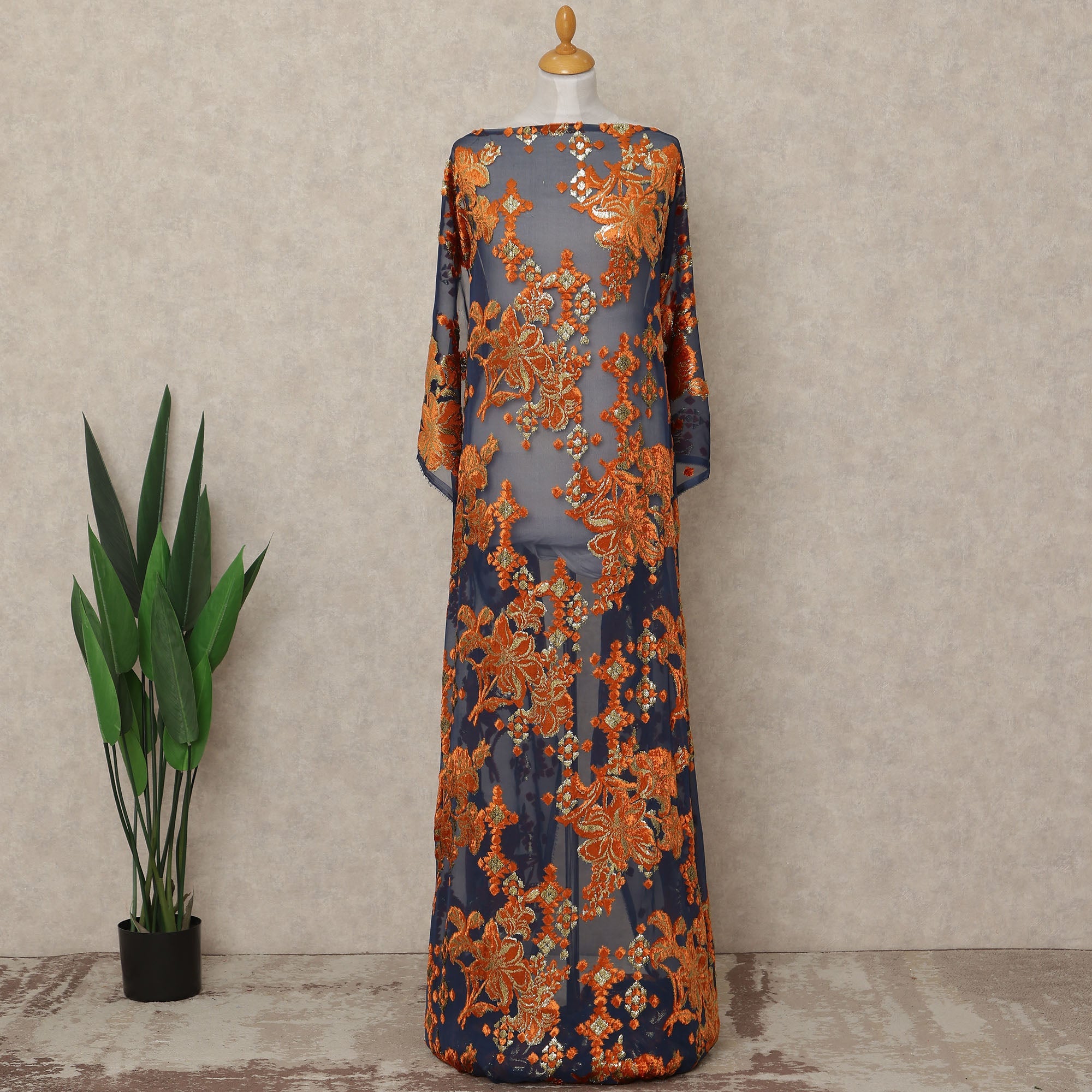 • Sale -20% Navy Blue Floral Metallic Lurex Silk Velvet Chiffon Makmal Dirac Fabric Traditional Somali Embroidered Design 3.5 Mtrs Piece 140 Cms Width Made In South Korea-D28414