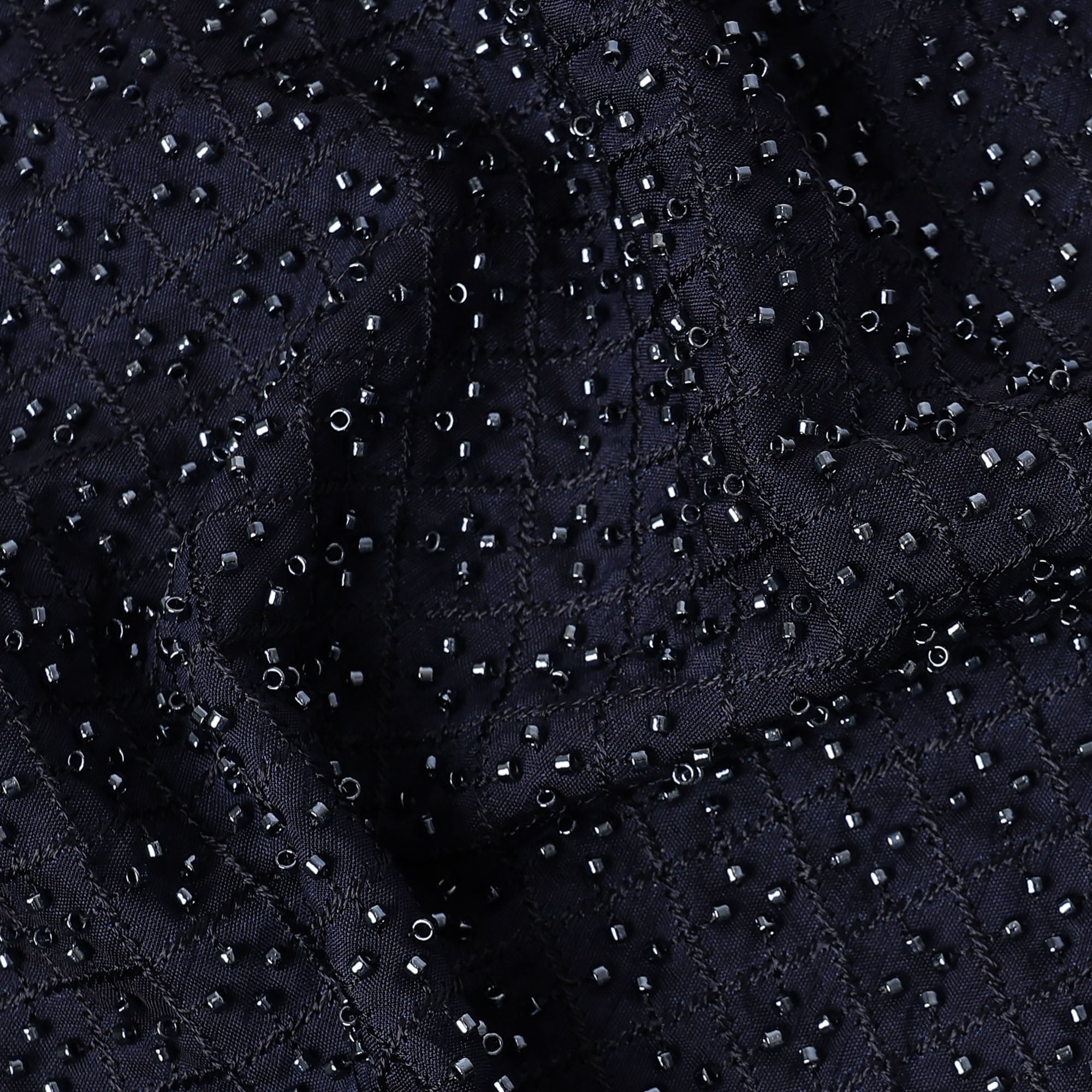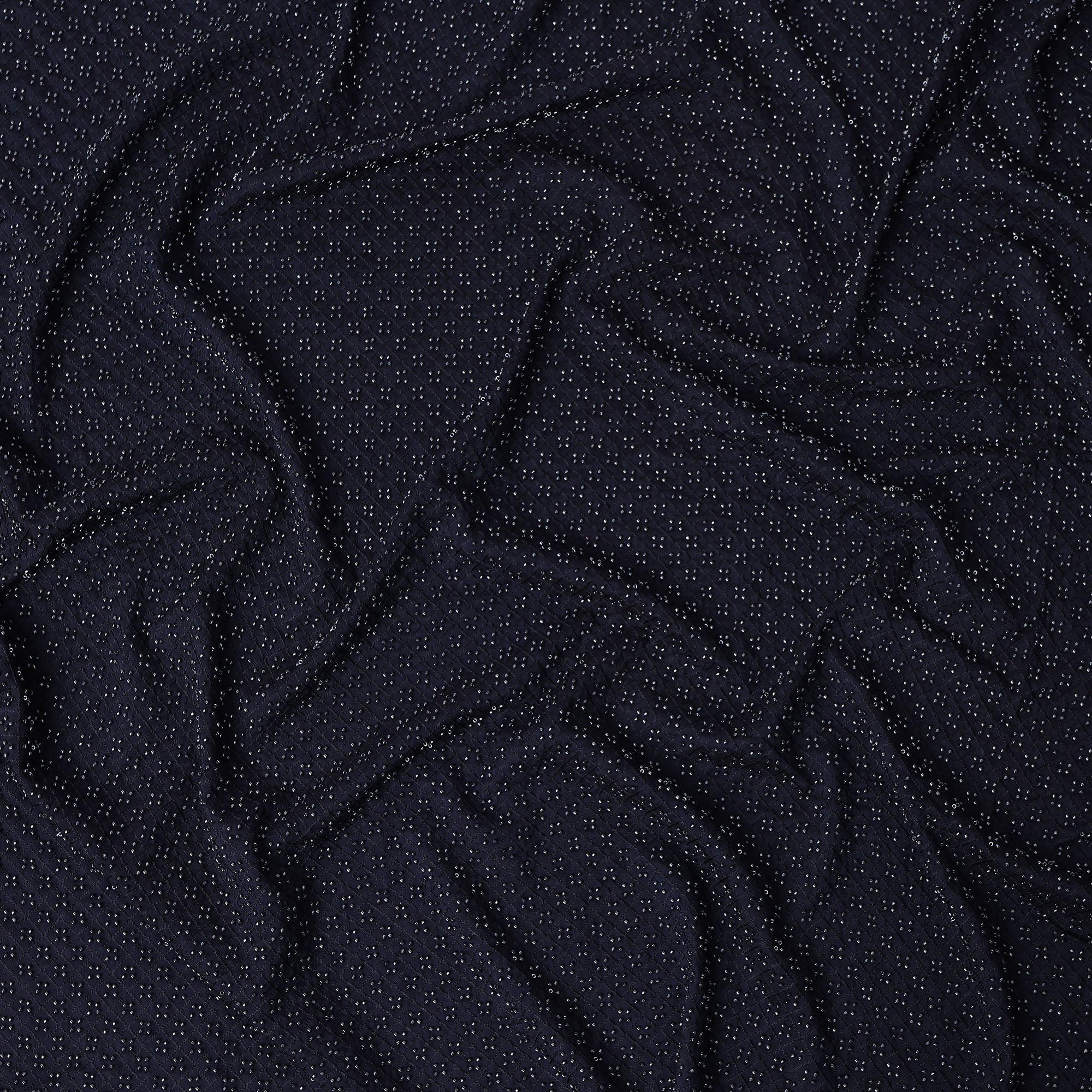 This refined navy blue synthetic blended fabric features an elegant micro-dotted textured pattern that adds subtle dimension and sophistication to any garment. The deep navy tone enhances the understated dotted detailing, making it ideal for both contemporary and classic fashion applications such as dresses, blouses, skirts, menswear accents, and semi-formal ensembles. Lightweight, smooth, and easy to drape, this fabric offers exceptional comfort while maintaining a polished finish suitable for everyday wear or special occasions. Designers looking to buy online or shop online for versatile, high-quality textured fabrics will appreciate its durability, crease-resistant nature, and timeless appeal, making it a perfect choice for creating refined and stylish apparel.