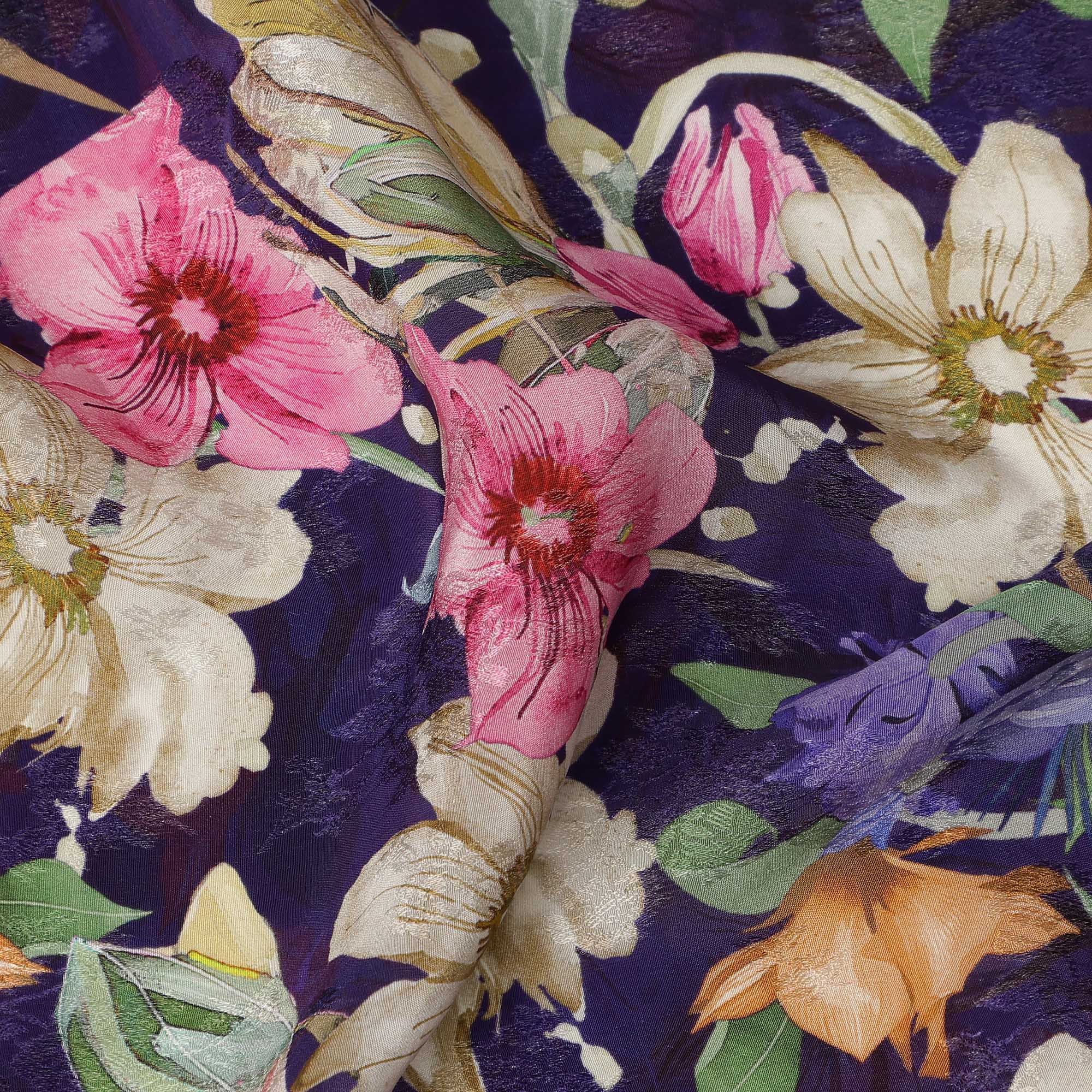 Navy Blue Multicolor Floral Allover Printed Viscose Modal Satin Fabric, 110 Cms, India-D26892