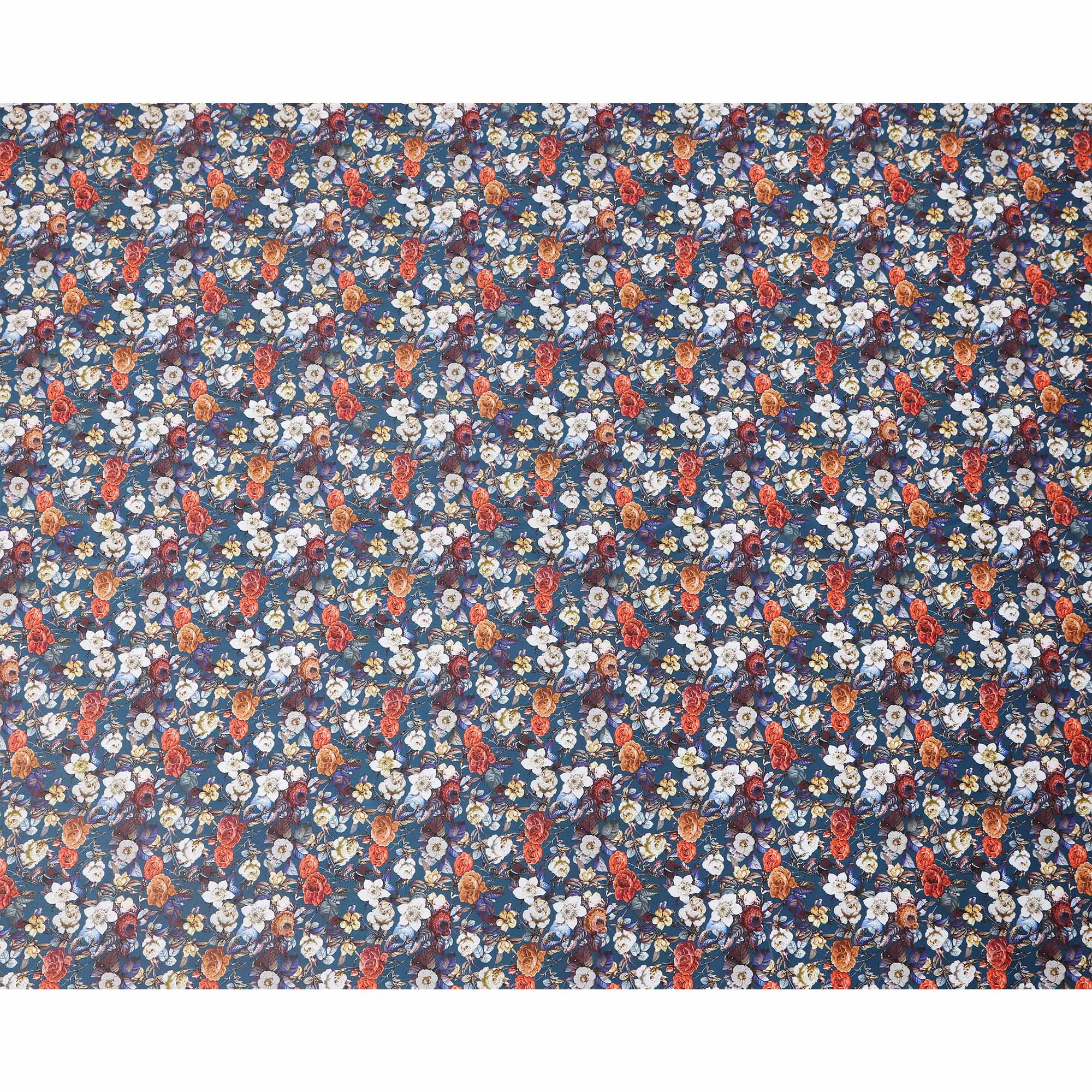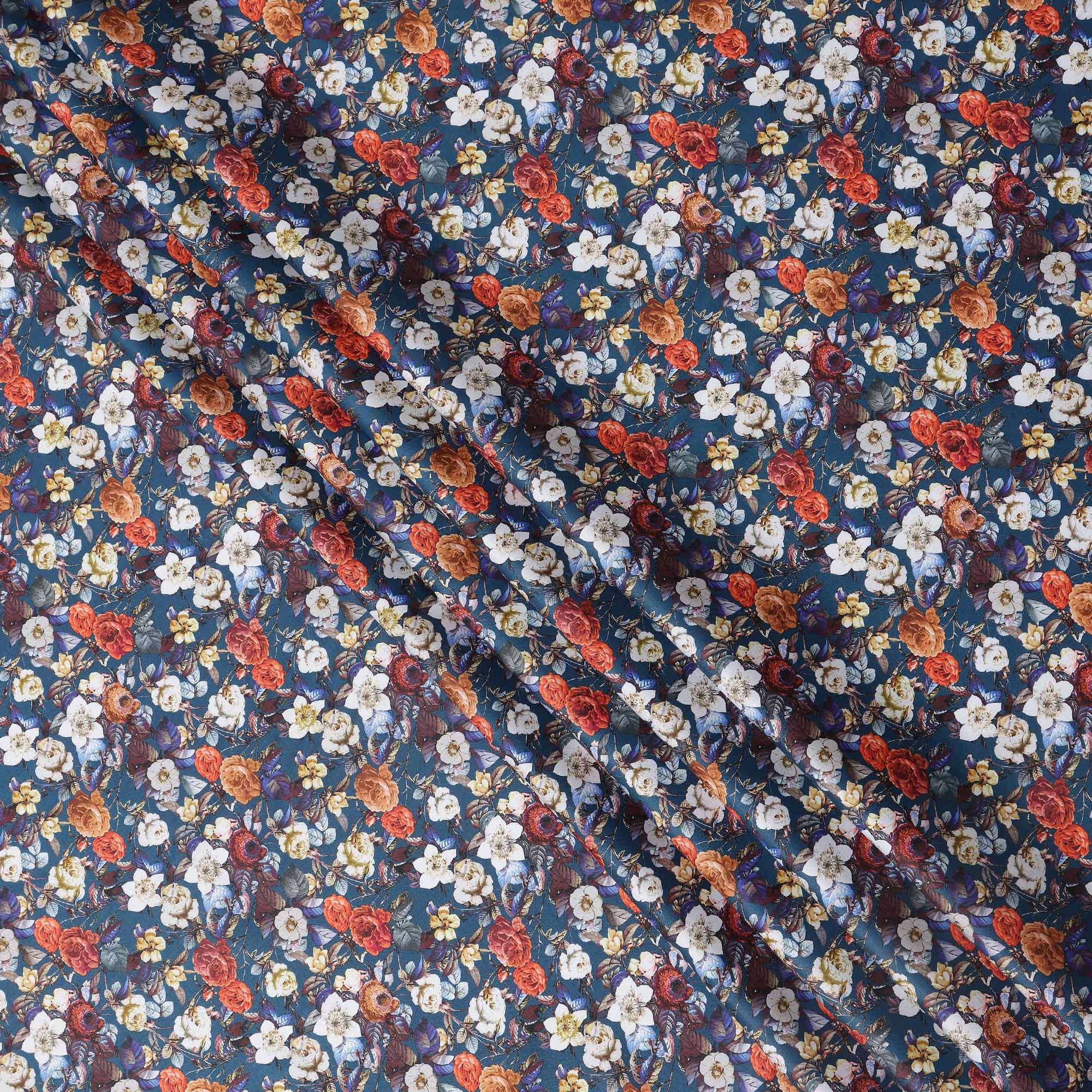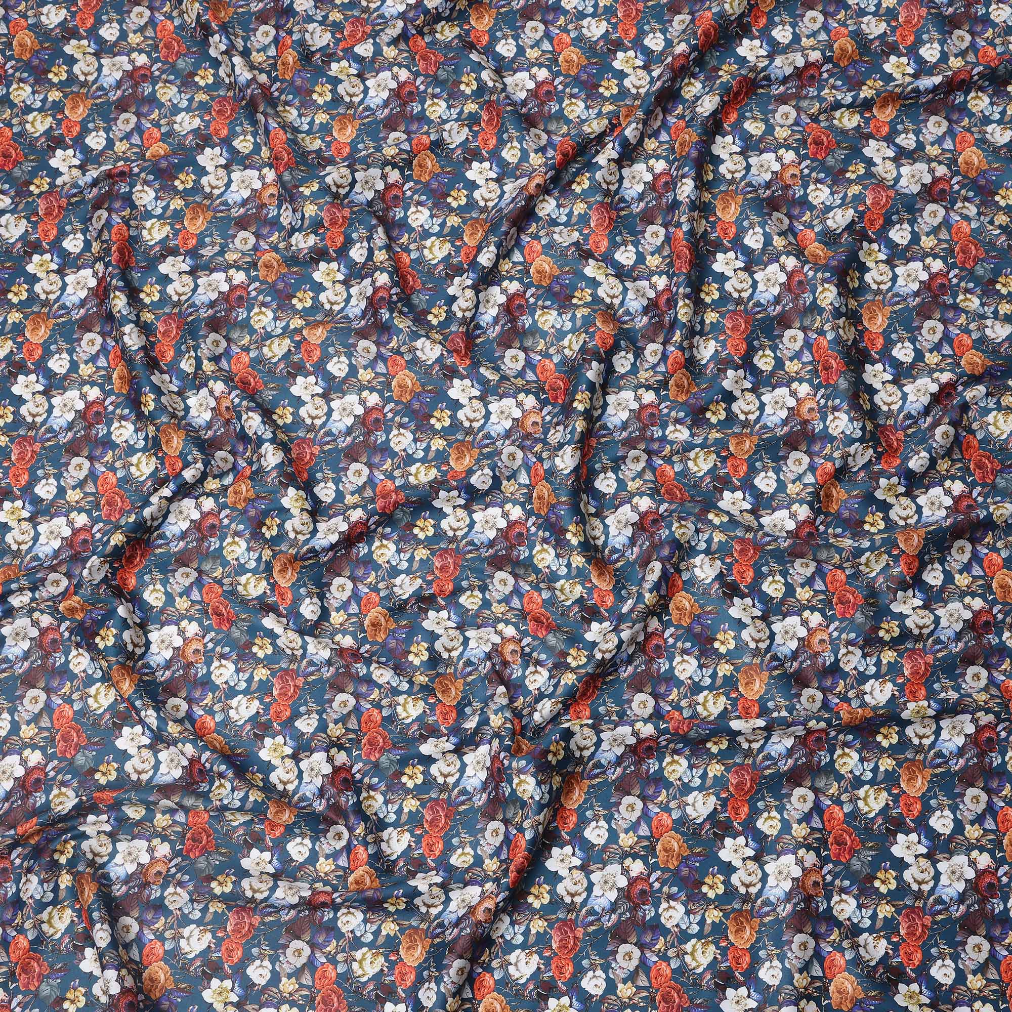 Premium Navy Blue Multicolor Floral Print Pure Cotton Satin Fabric with elegant sheen